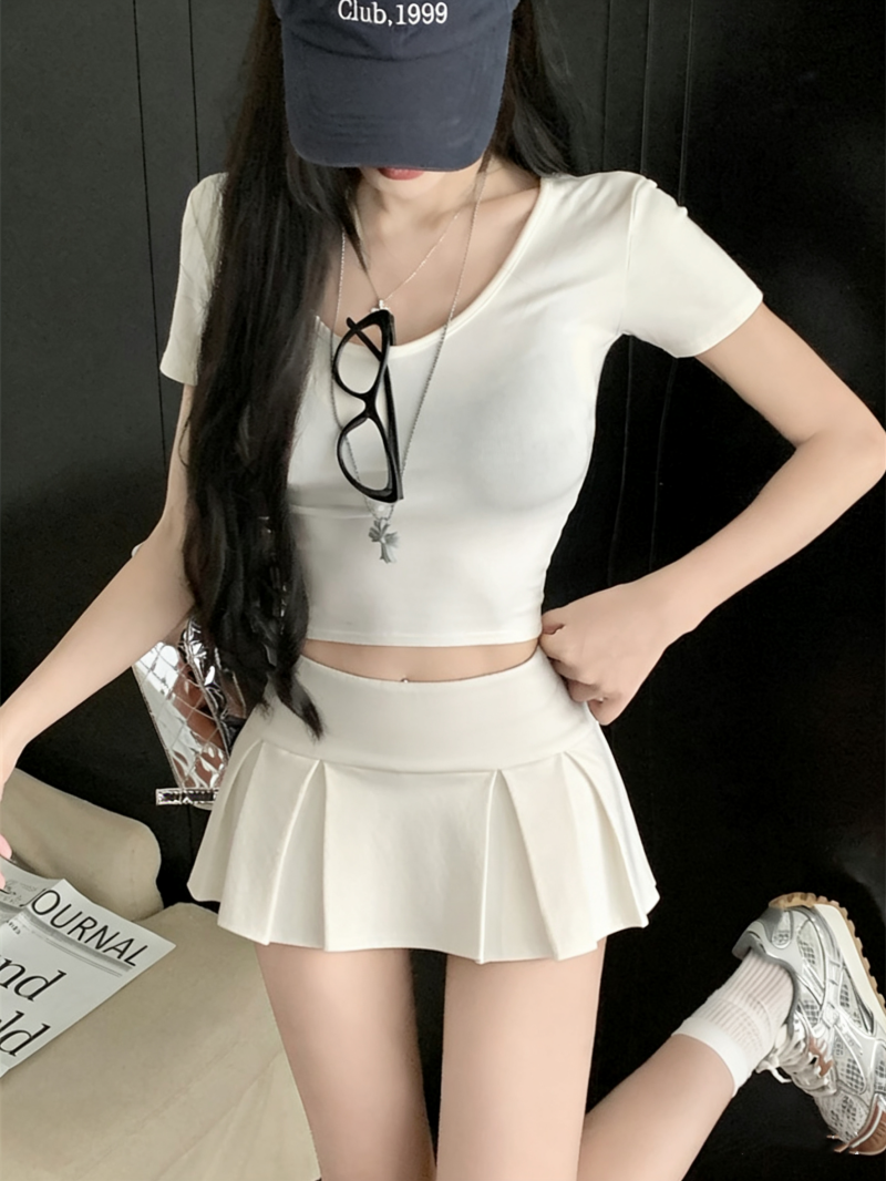 실사 정가 감소되지 않음 티셔츠 여성 의류 디자인 센스 작은 대중 불규칙 광장 칼라 타이트 쇼트 스타일 반팔 맨위
