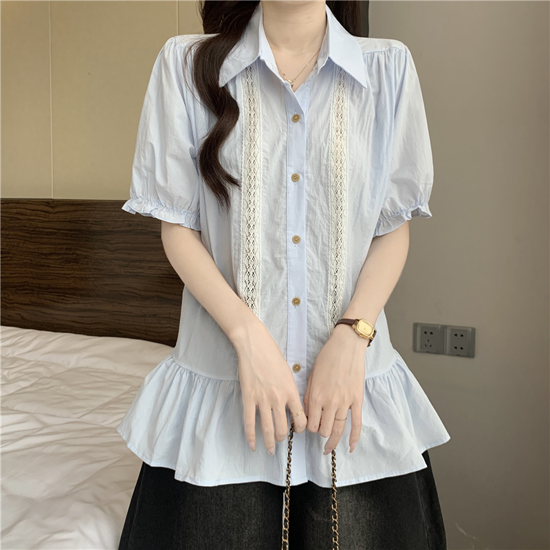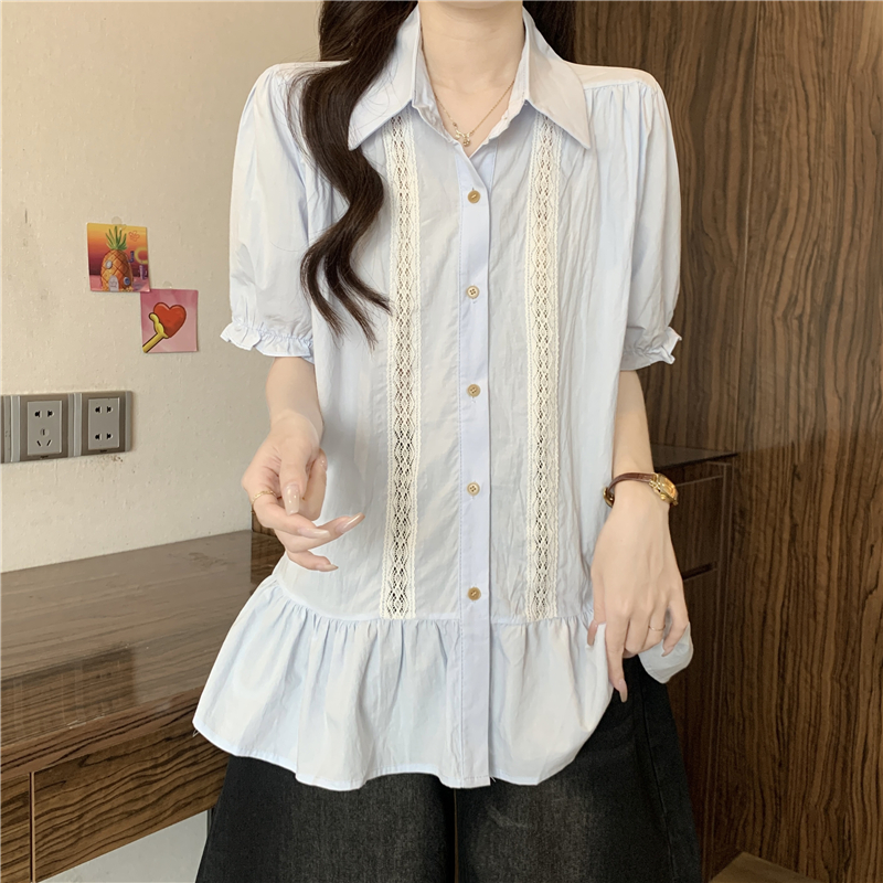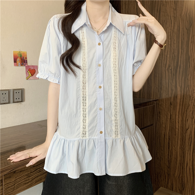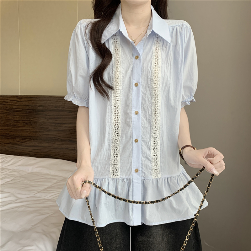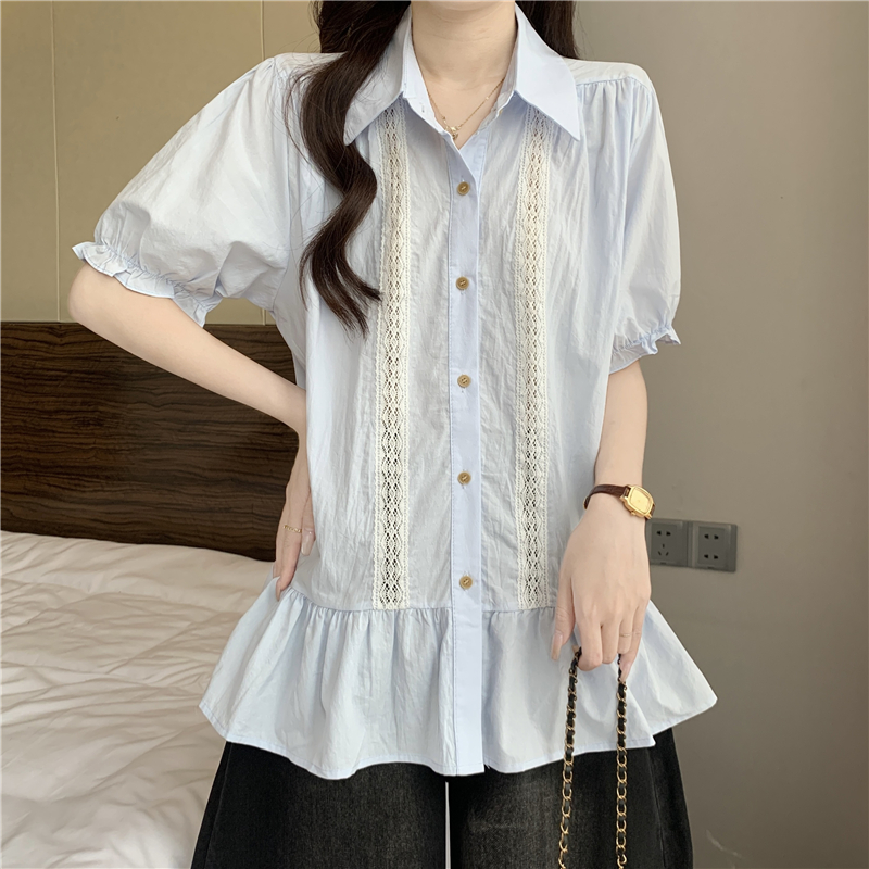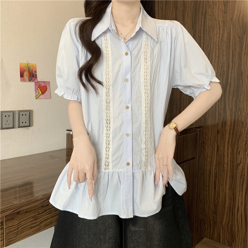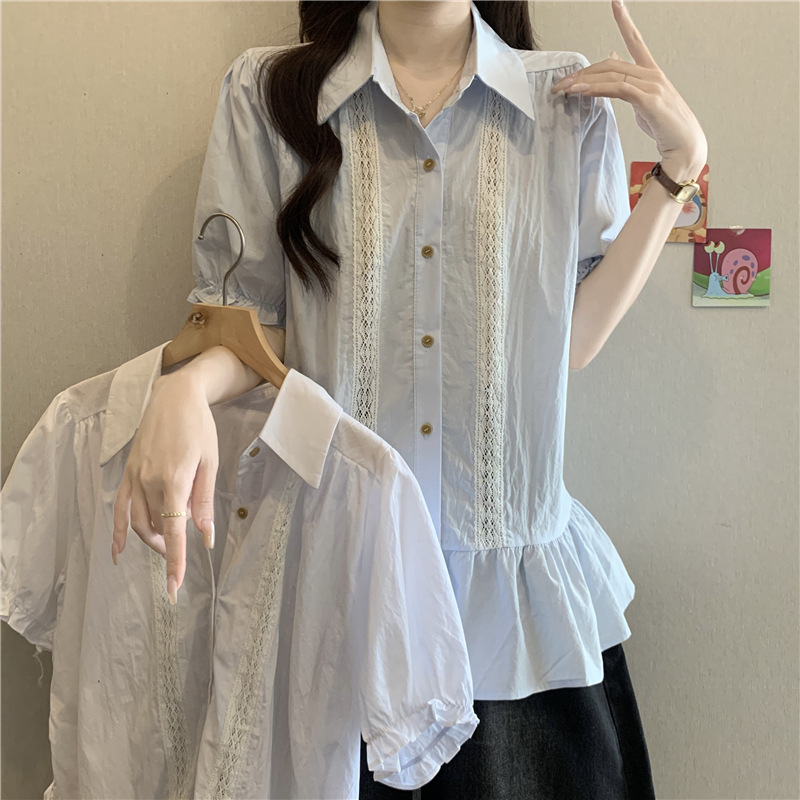 프랑스식 고급 센스 레이스 자수 V넥 반팔 여성 셔츠 여름 빅 사이즈 지방 mm 표지 배 벌룬 소매 맨위