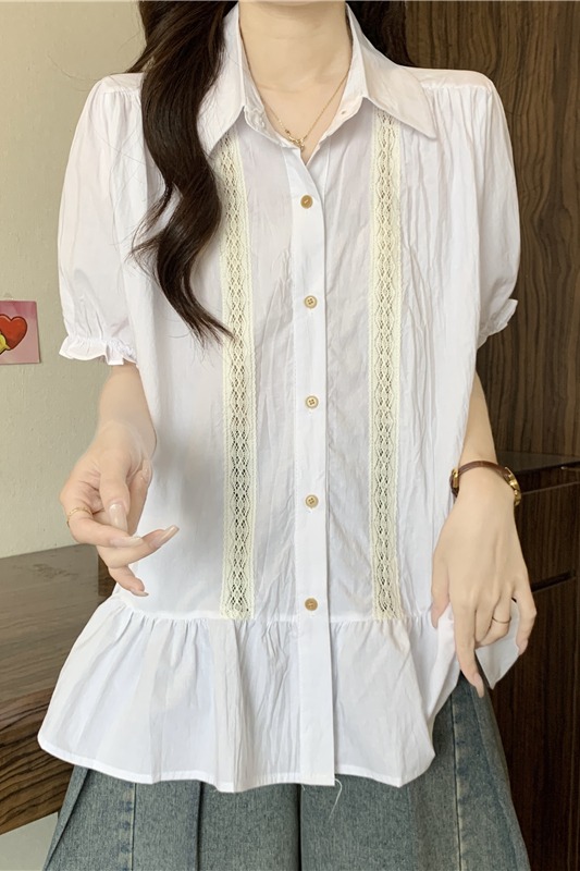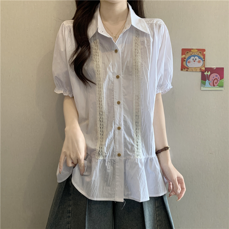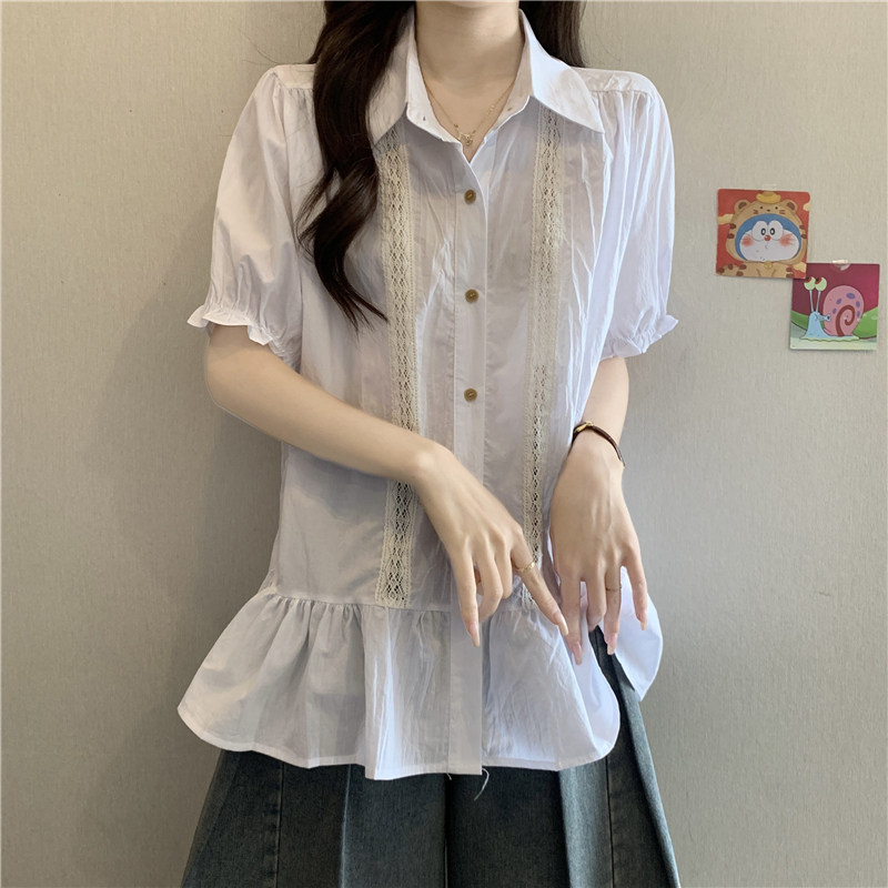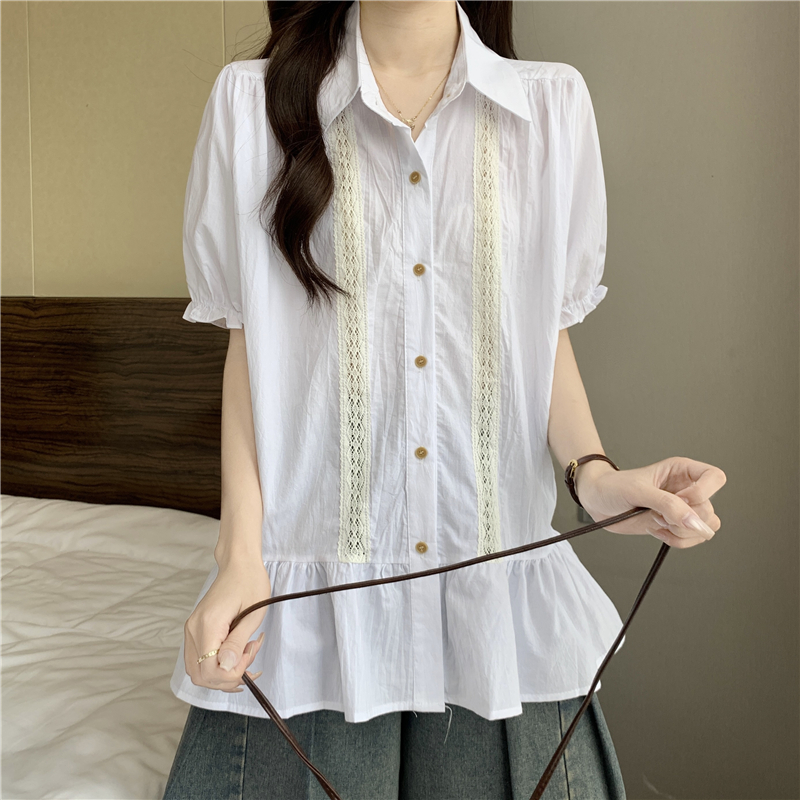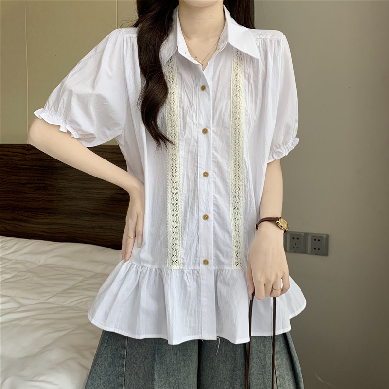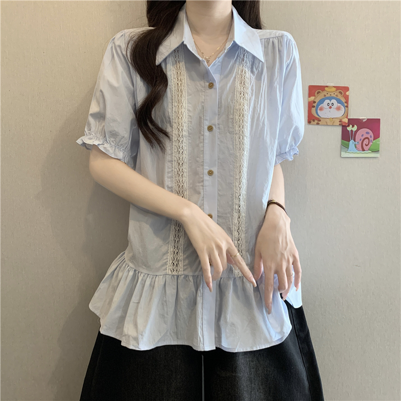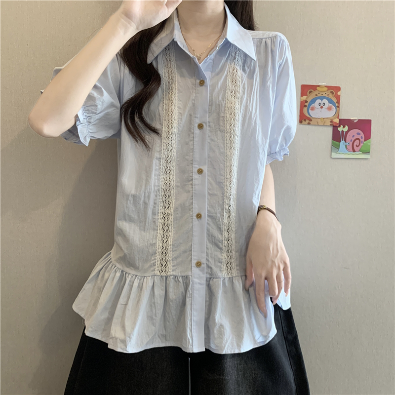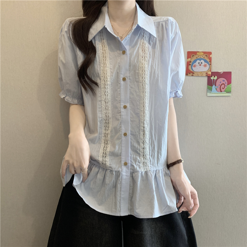 프랑스식 고급 센스 레이스 자수 V넥 반팔 여성 셔츠 여름 빅 사이즈 지방 mm 표지 배 벌룬 소매 맨위