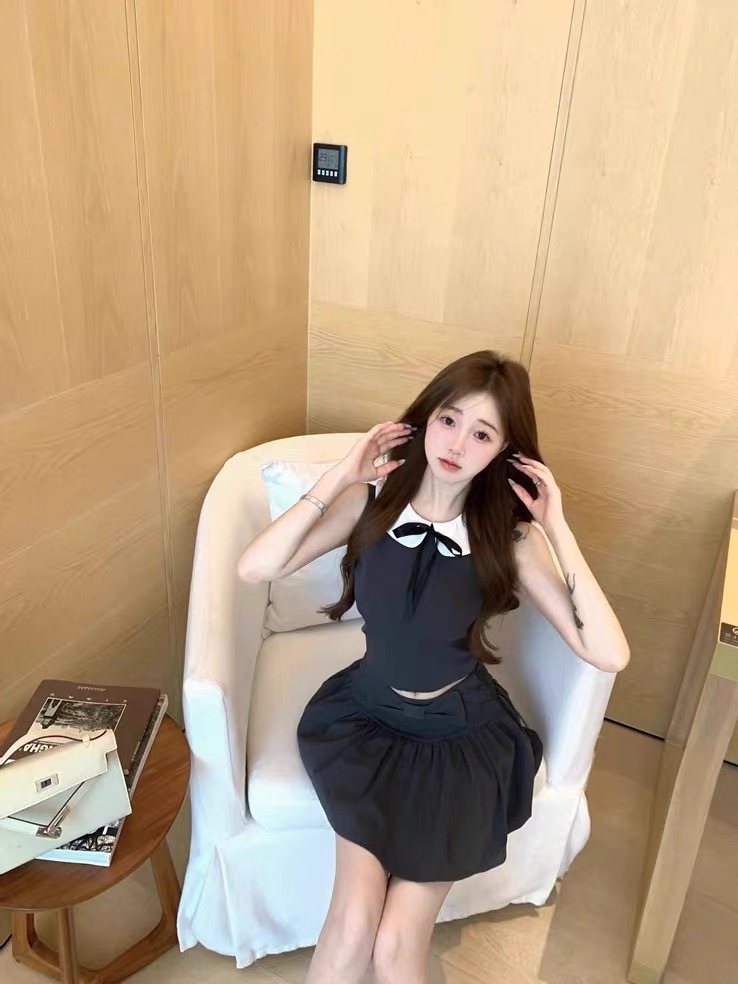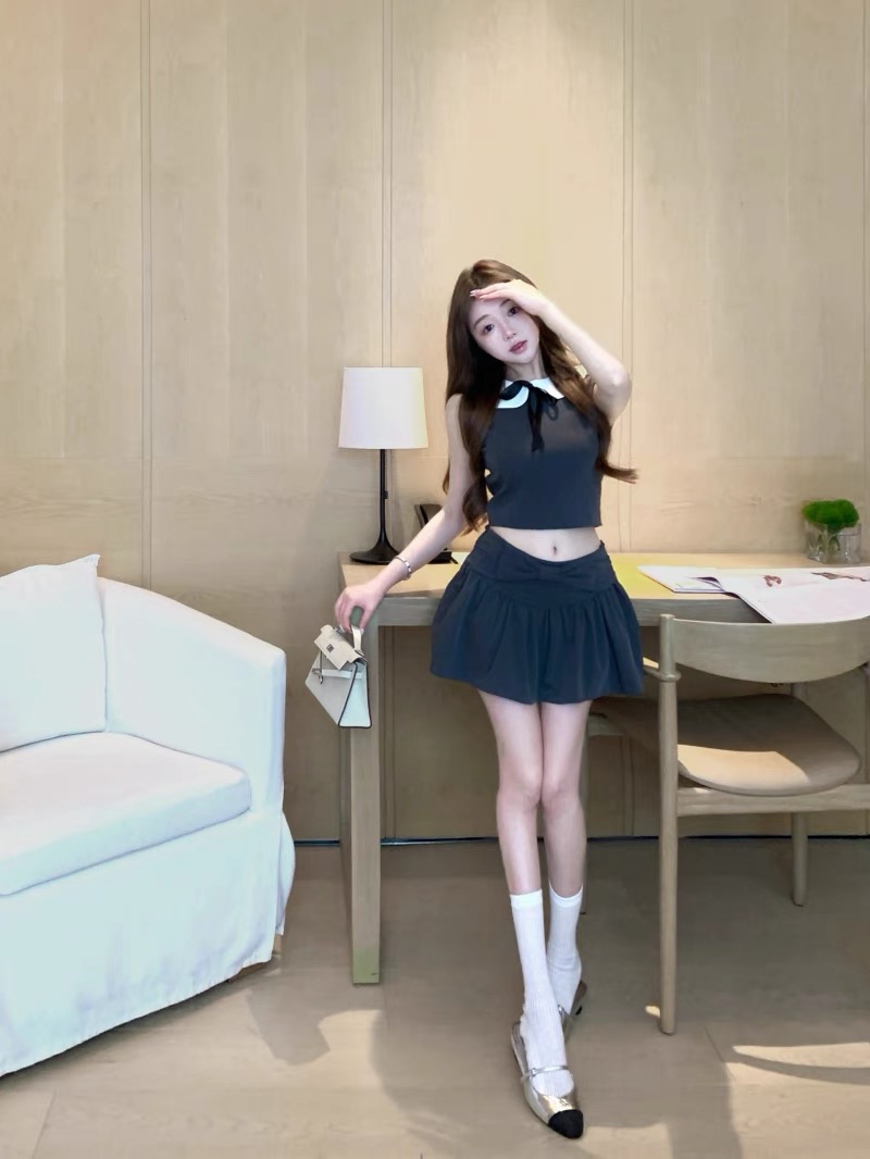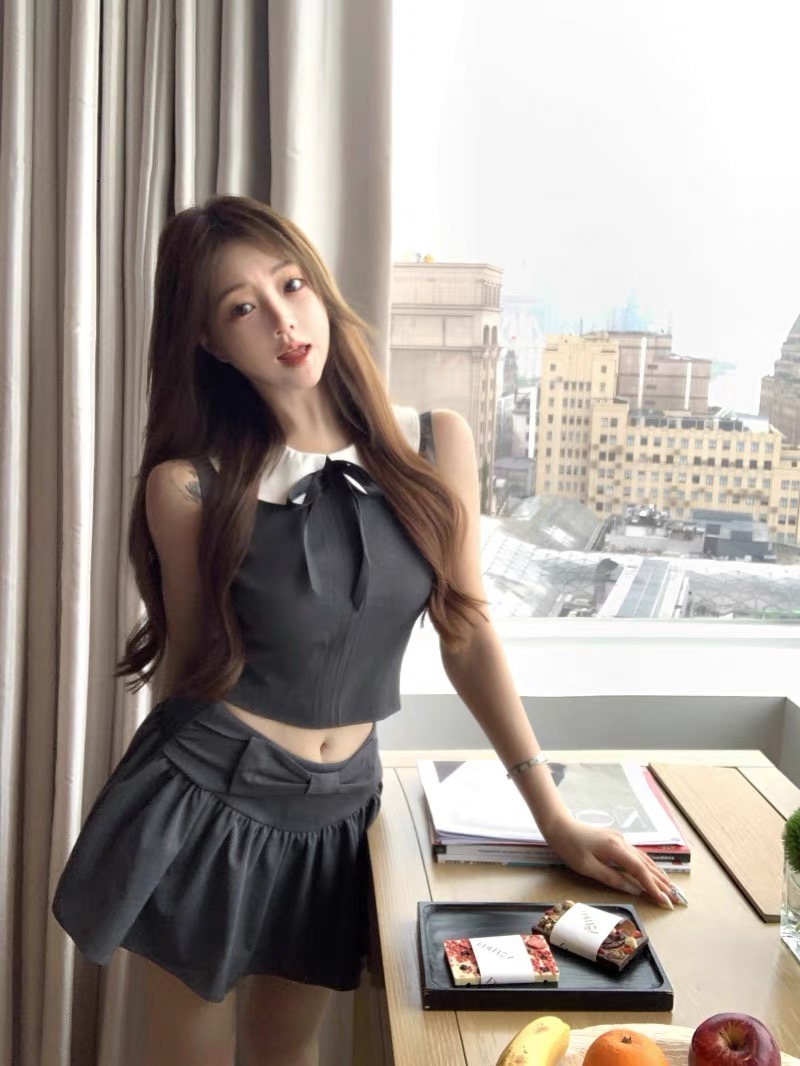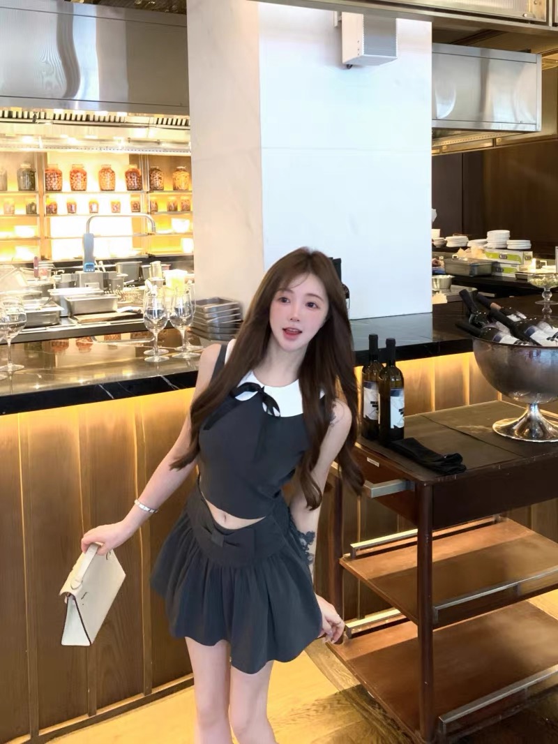 miu 부서 코치 착용 가져 가라. 세트 배색 베이비 칼라 민소매 조끼 여성 여름 나비 매듭 반신 스커트 투피스 세트