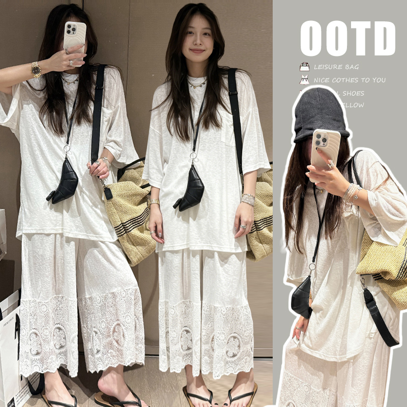 느긋한 바람 티셔츠 세트 여름 새로운 슬림해 보이는 레이스 방귀 커튼 긴 바지 임산부 투피스 세트
