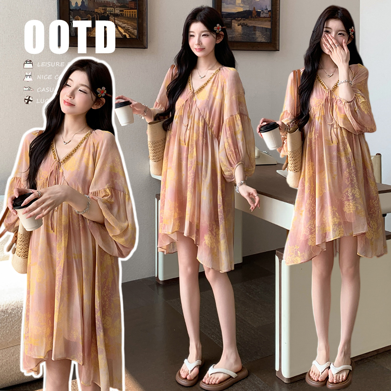 실사 새로운 분위기 센스 벌룬 소매 V넥 임산부 드레스