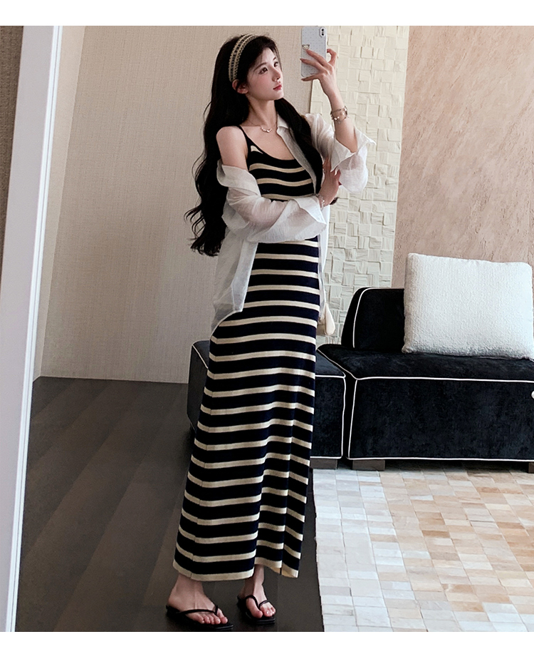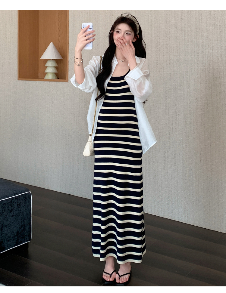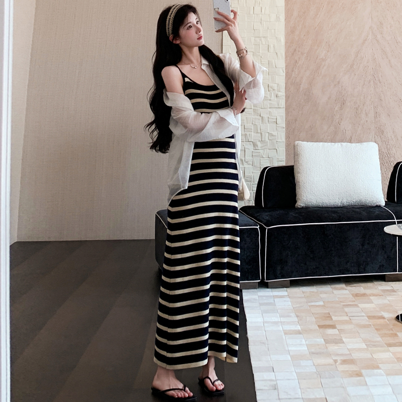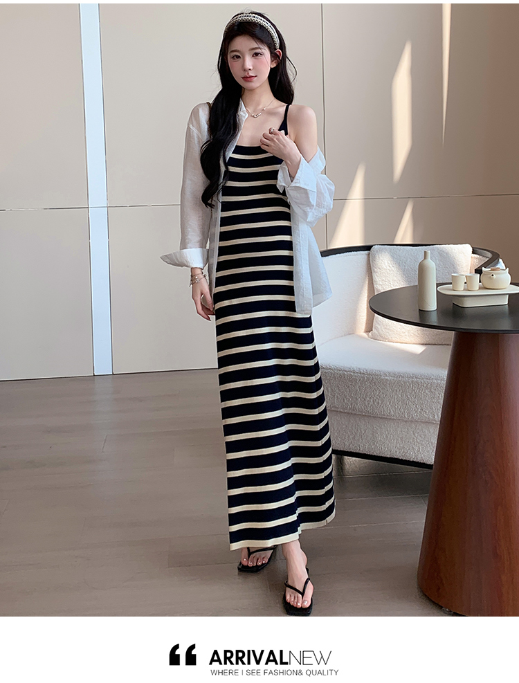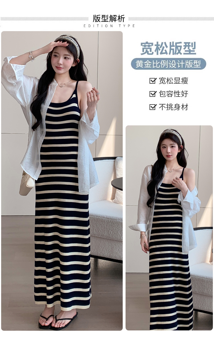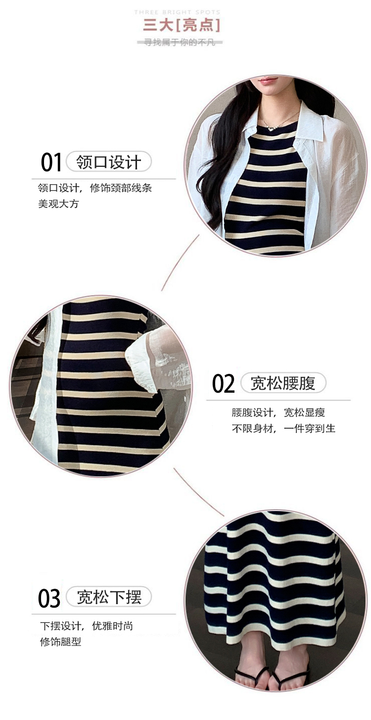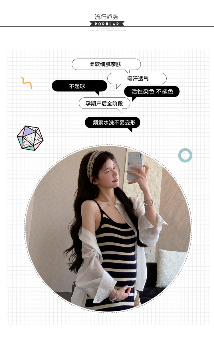 실사 여름 새로운 작은 샤넬 스타일 스트라이프 니트 조끼 슬림해 보이는 품격 임산부 드레스