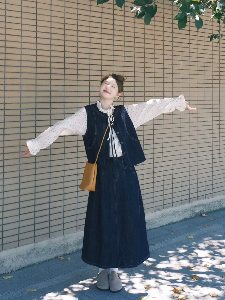 봄 드레스 코디 전체 집합 한 부서 착용 가져 가라. 도트 무늬 쉬폰 셔츠 스택 착용 데님 베스트 반신 스커트 세 조각 세트