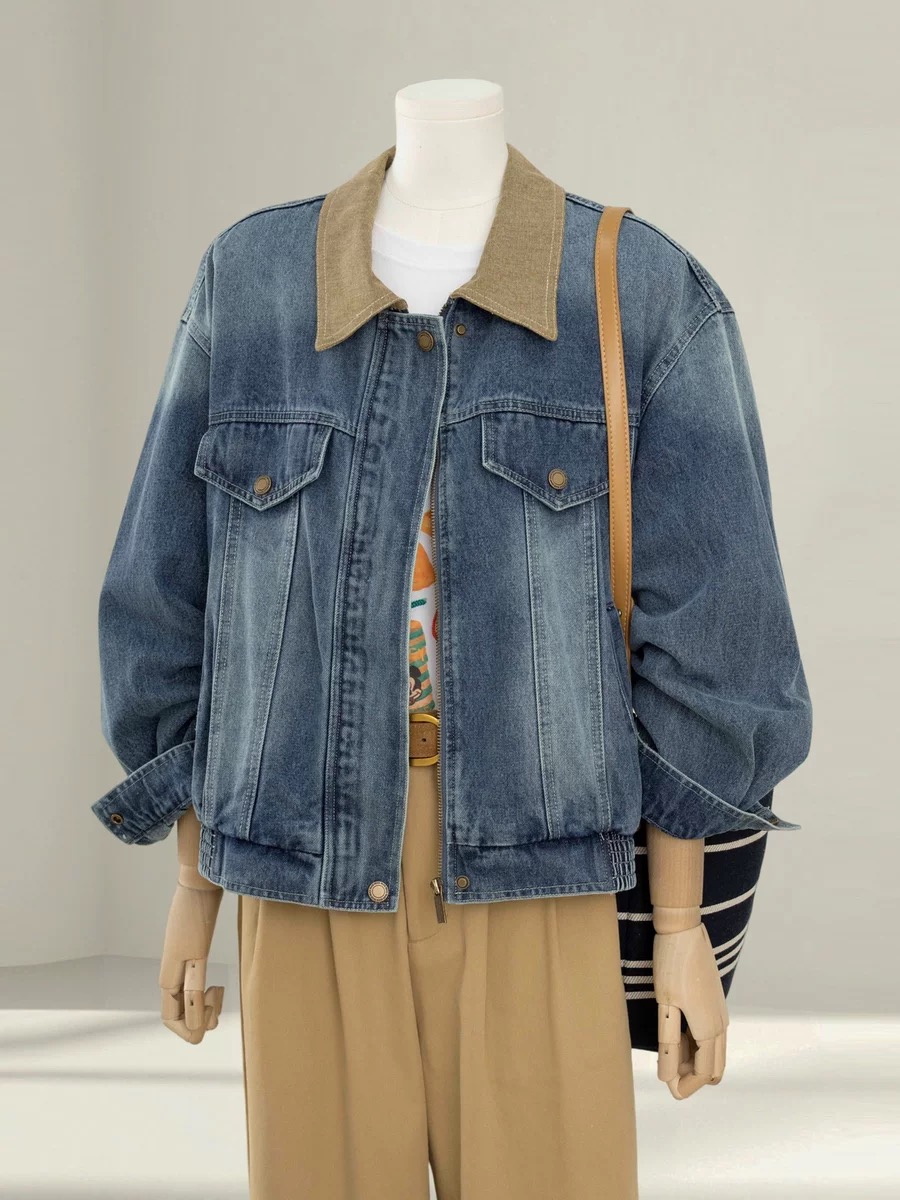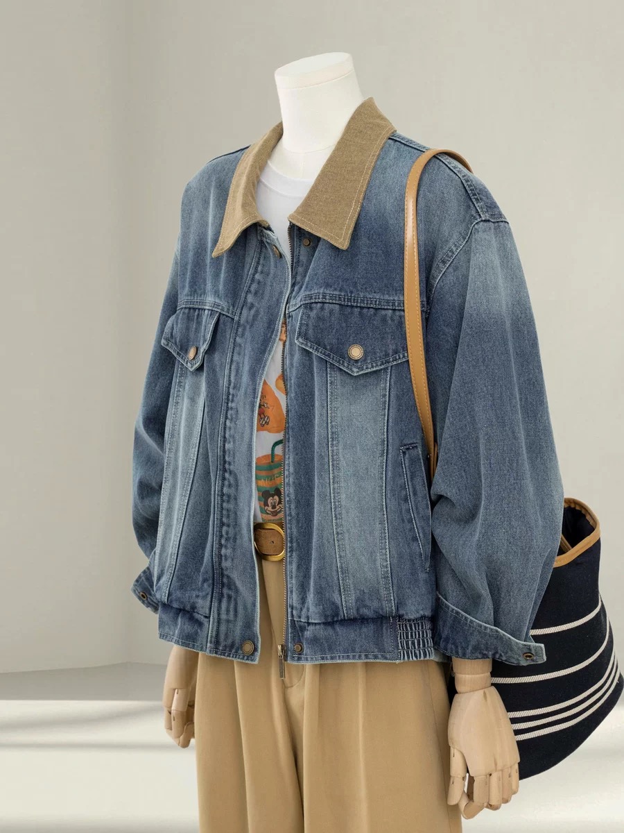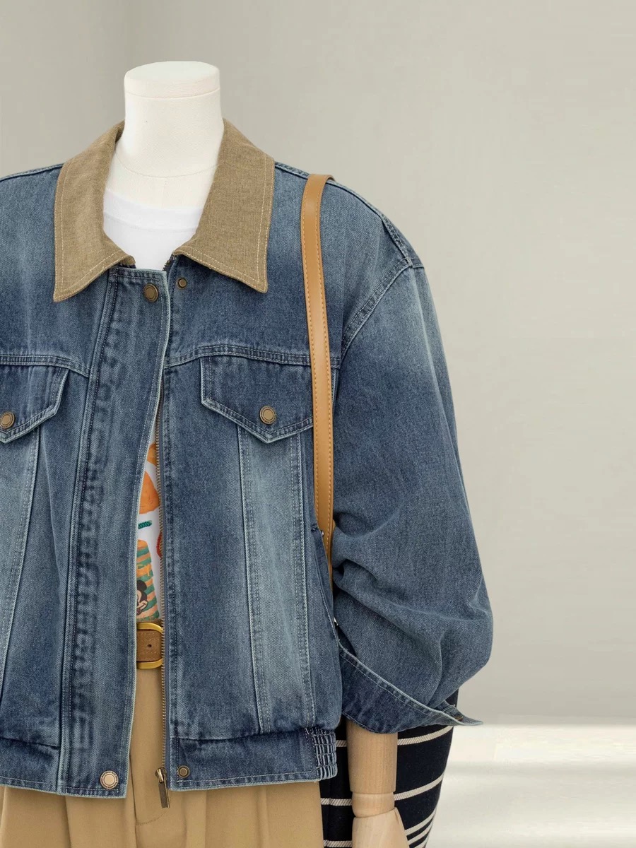 자이언트 잘 생긴 이른 봄 전체 집합 감기 느슨함 센스 miu 부서 착용 가져 가라. 파란색 데님 야구 유니폼 와이드 레그 팬츠 세트
