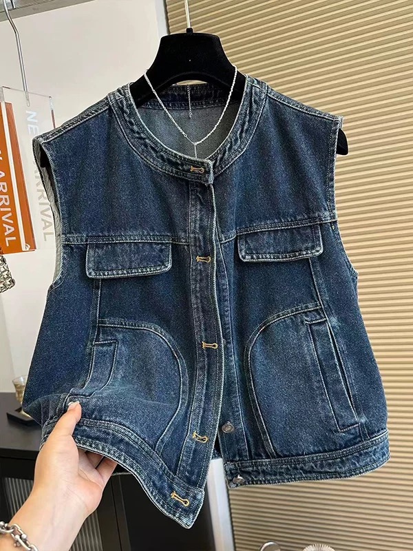 고급 센스 라운드 넥 데님 베스트 여성 봄 새로운 어깨 조끼 패션 외국 가스 작은 키 민소매 재킷