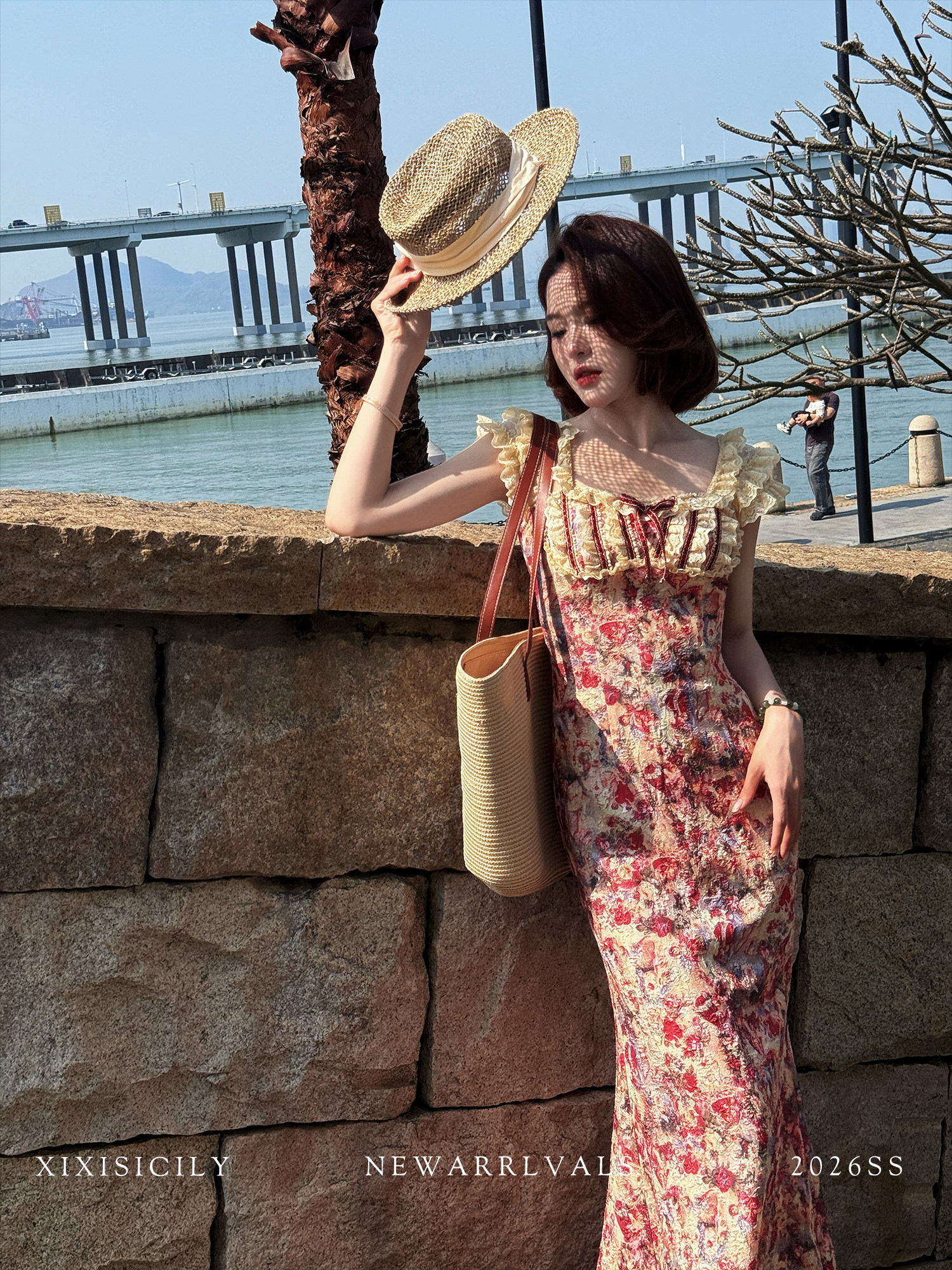 세븐 작은 세븐 sicily 일몰 꽃 거울 프랑스식 꽃무늬 광장 칼라 드레스 여름 아름다운 밝은 품격 롱 스커트