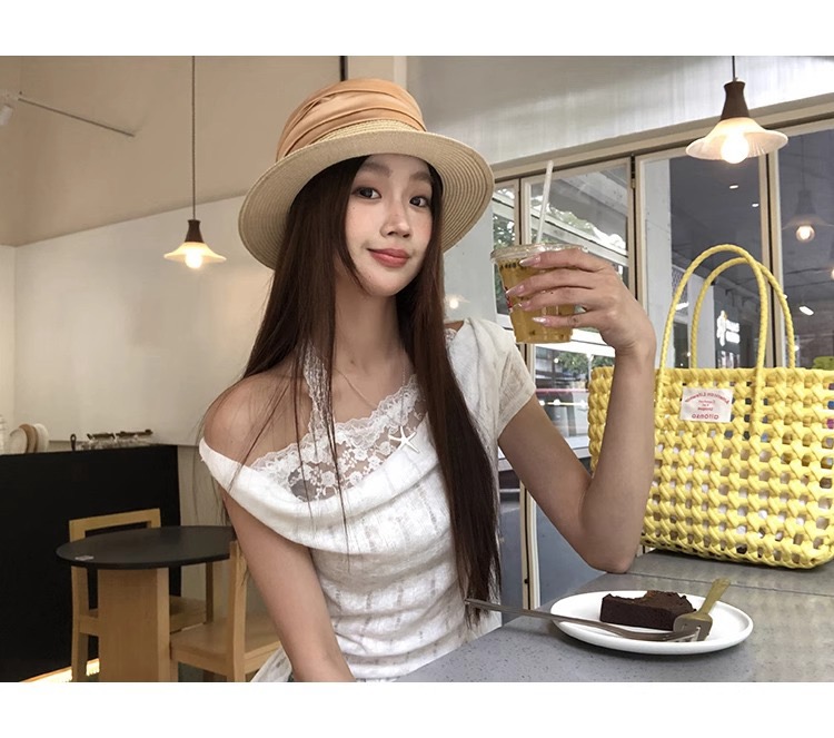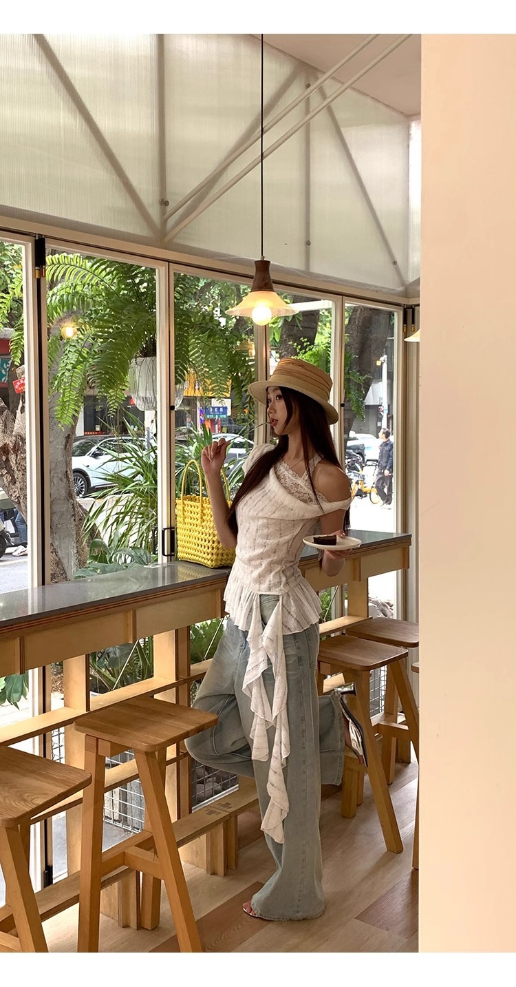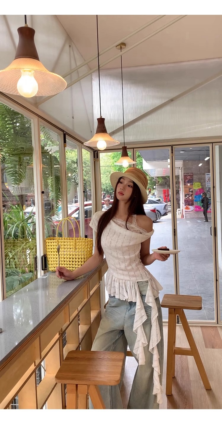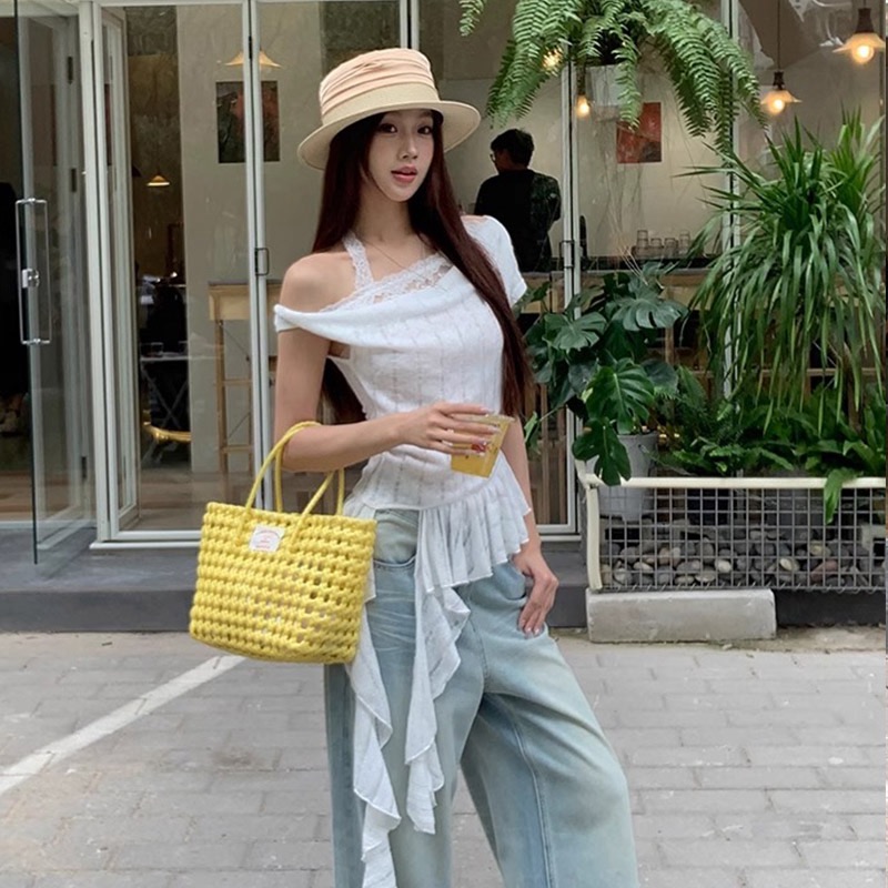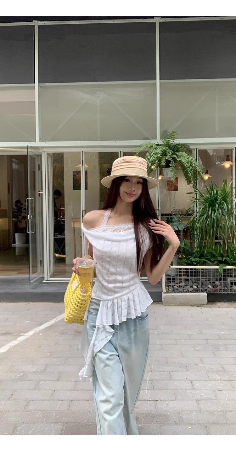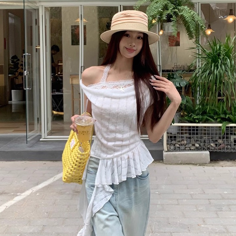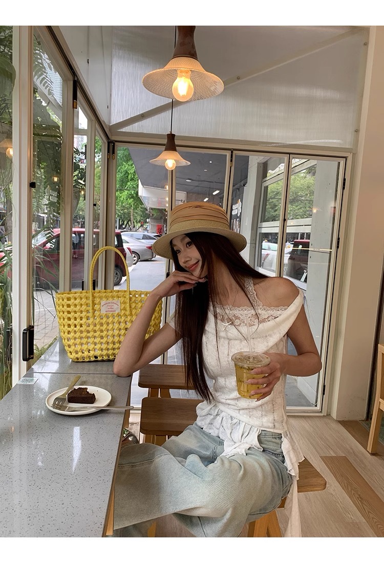 한국 스타일 순수한 욕망 불규칙 레이스 오프숄더 반팔 티셔츠 여성 여름 새로운 몸매 가꾸기 슬림해 보이는 맨위