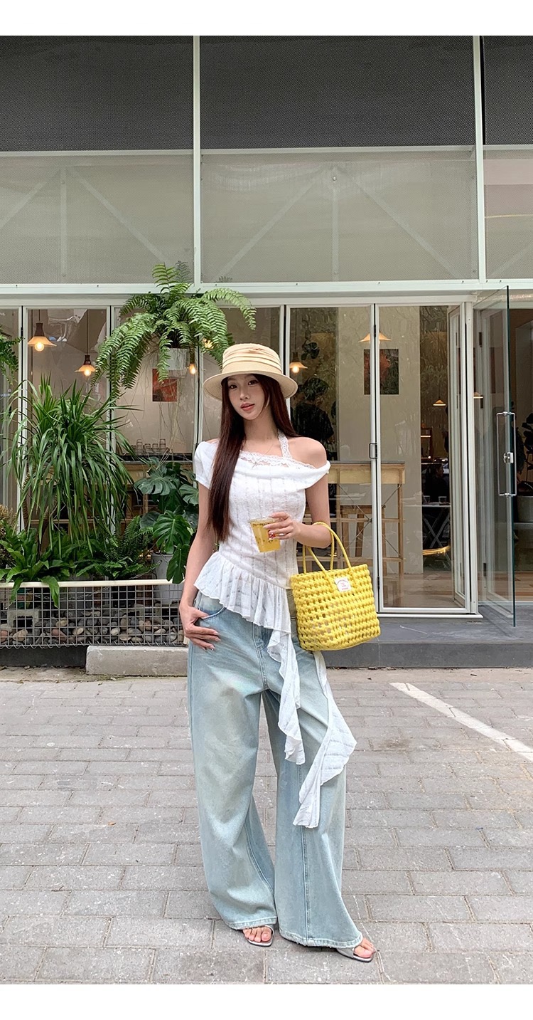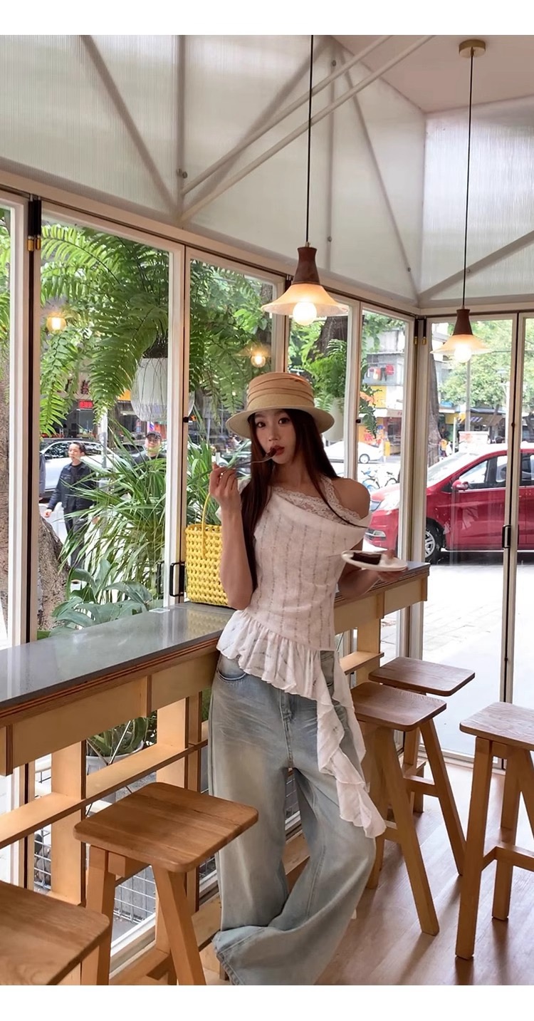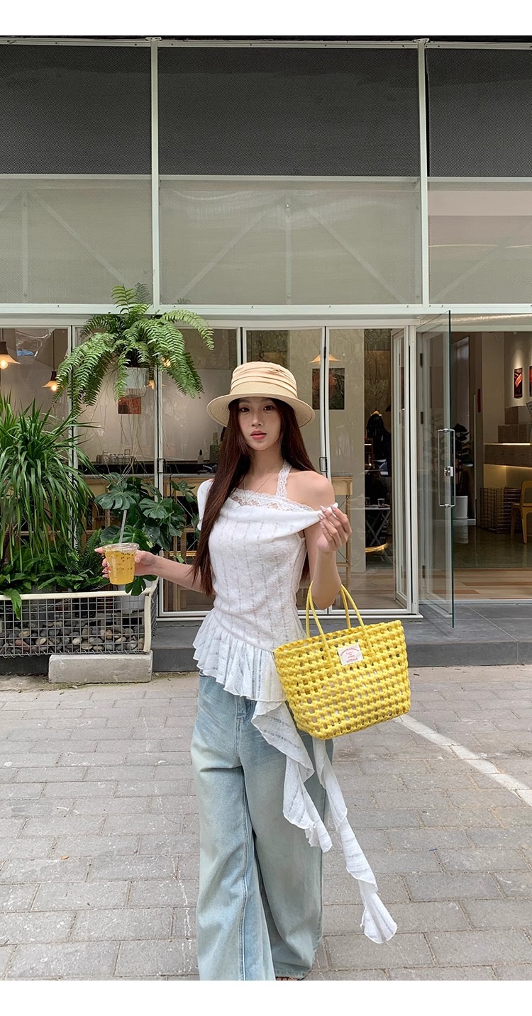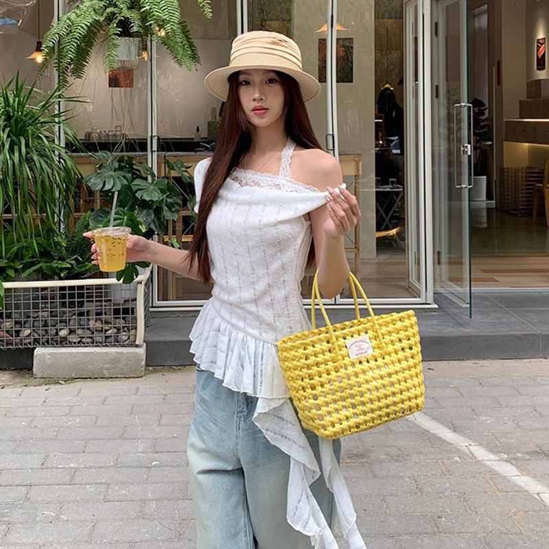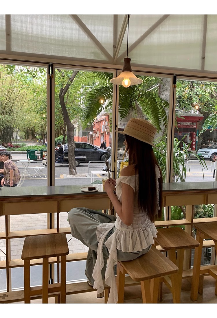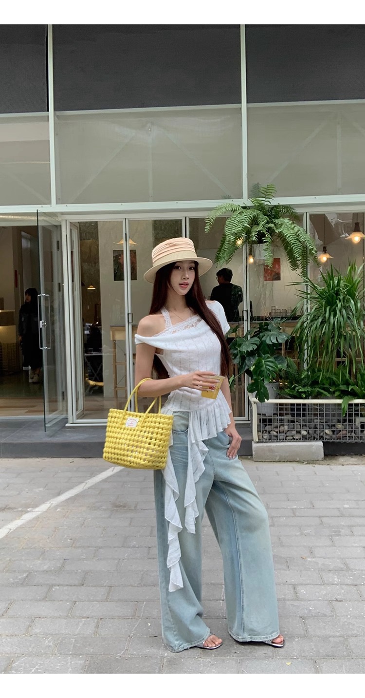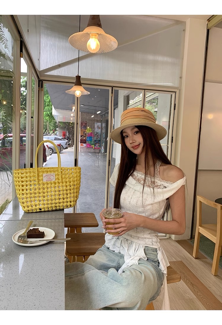 한국 스타일 순수한 욕망 불규칙 레이스 오프숄더 반팔 티셔츠 여성 여름 새로운 몸매 가꾸기 슬림해 보이는 맨위