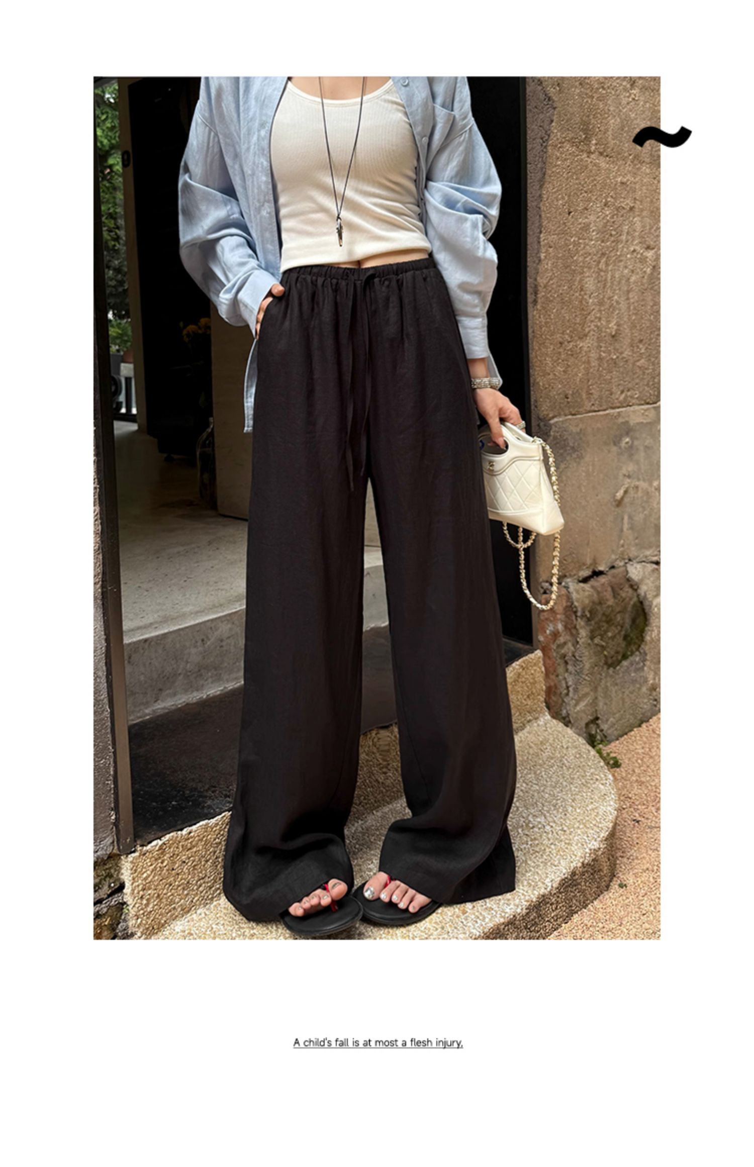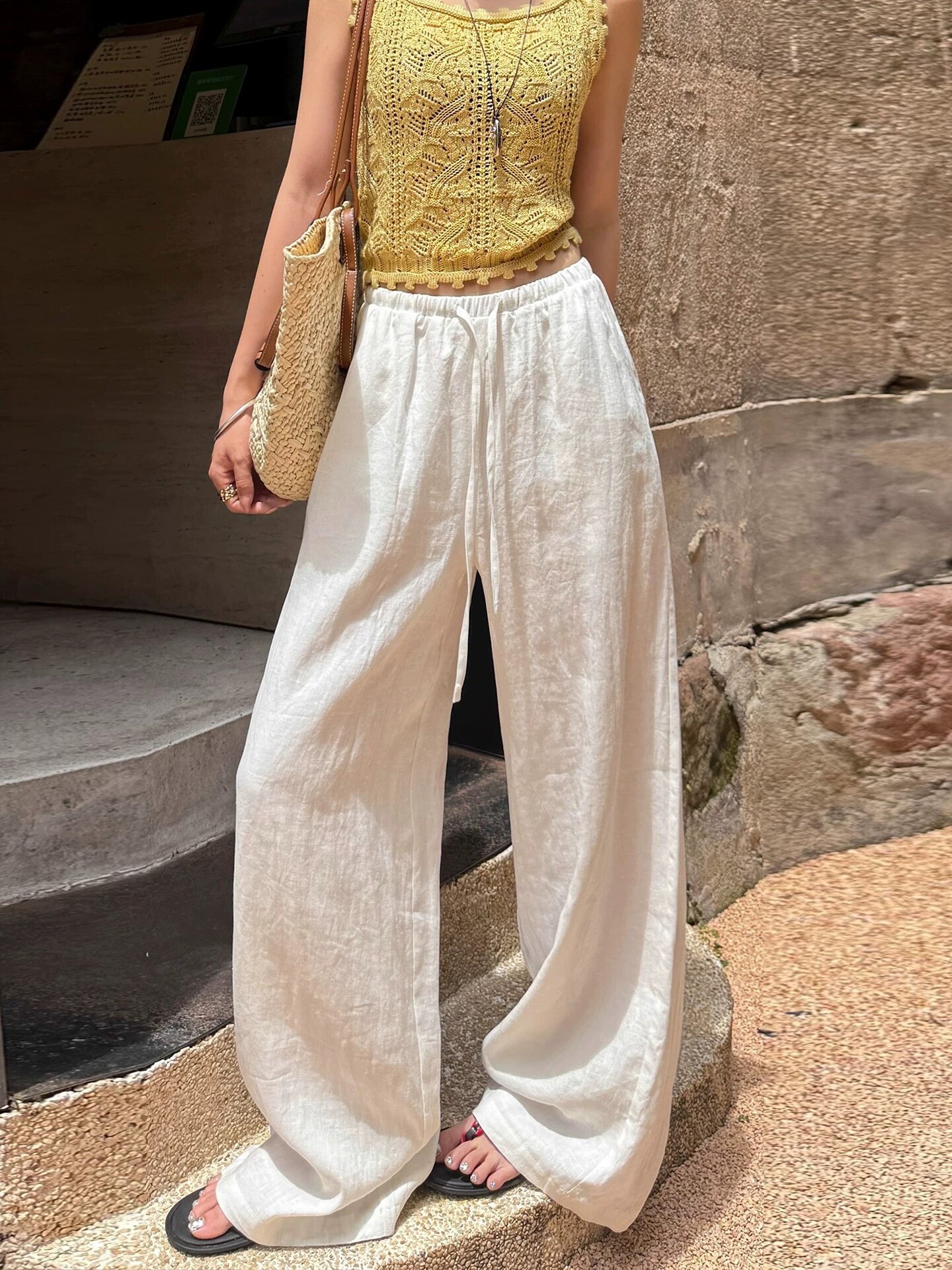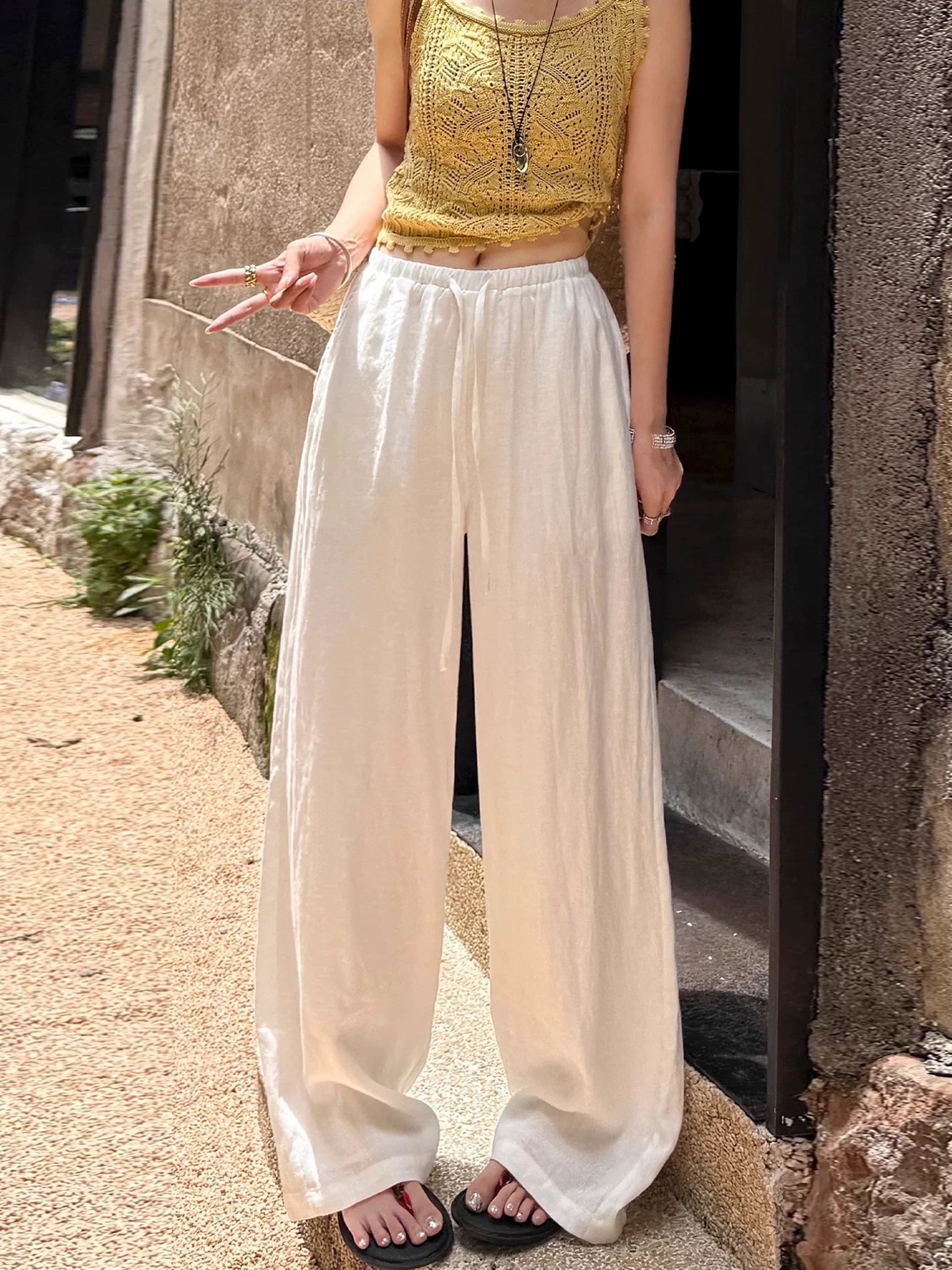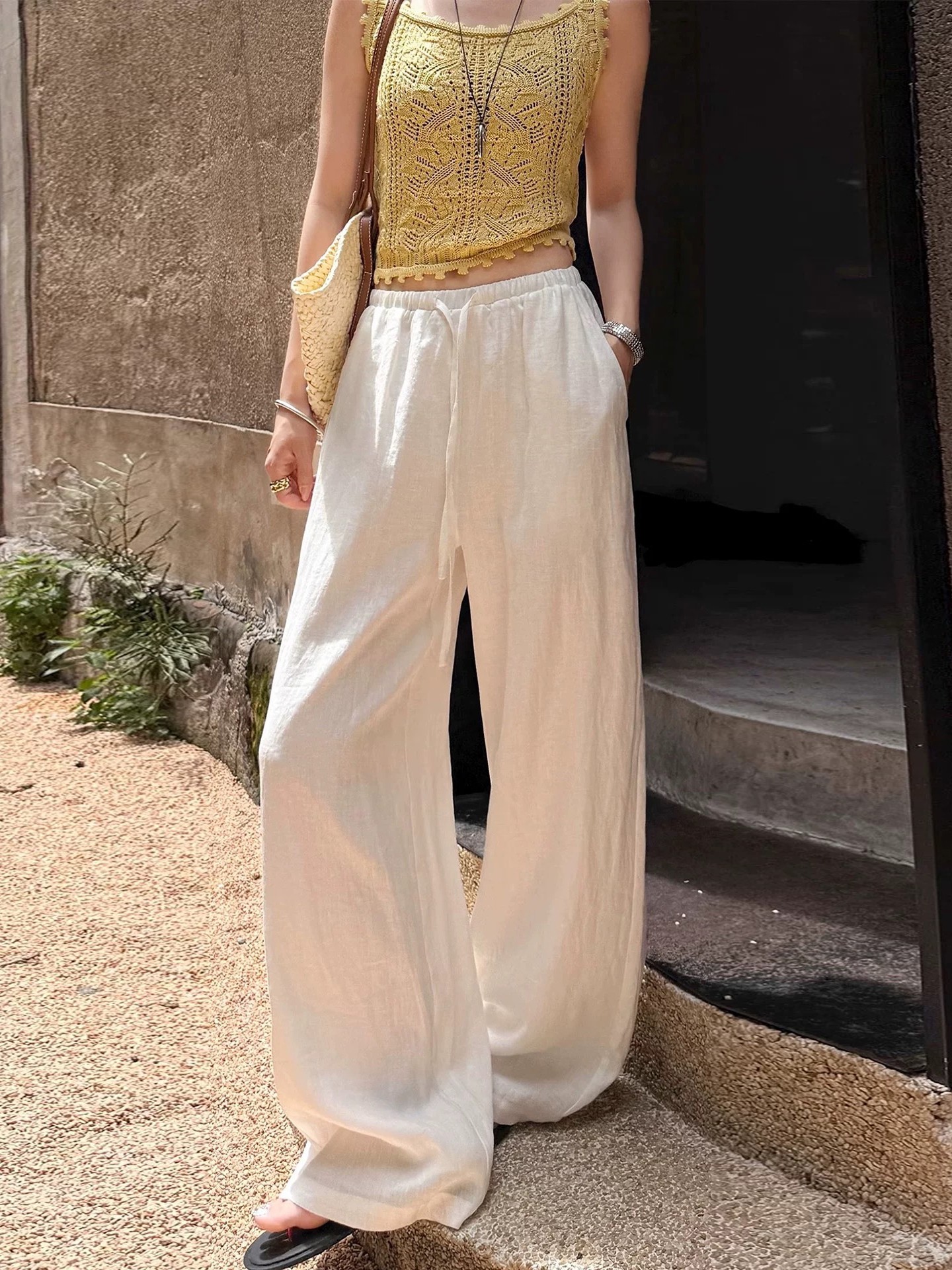 오래된 돈 바람 느긋한 마 재료 화이트 바지 여름 얇은 루즈핏 캐주얼 면 린넨 리 아마 센스 얼음 실크 와이드 레그 팬츠