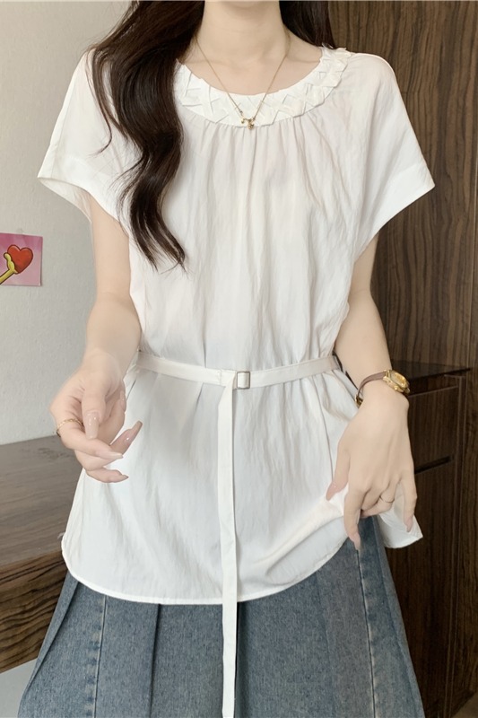 프랑스식 화이트 V넥 긍정적 인 어깨 반팔 여성 셔츠 여름 빅 사이즈 지방 mm 스트랩 허리 수축 불규칙 리본 맨위