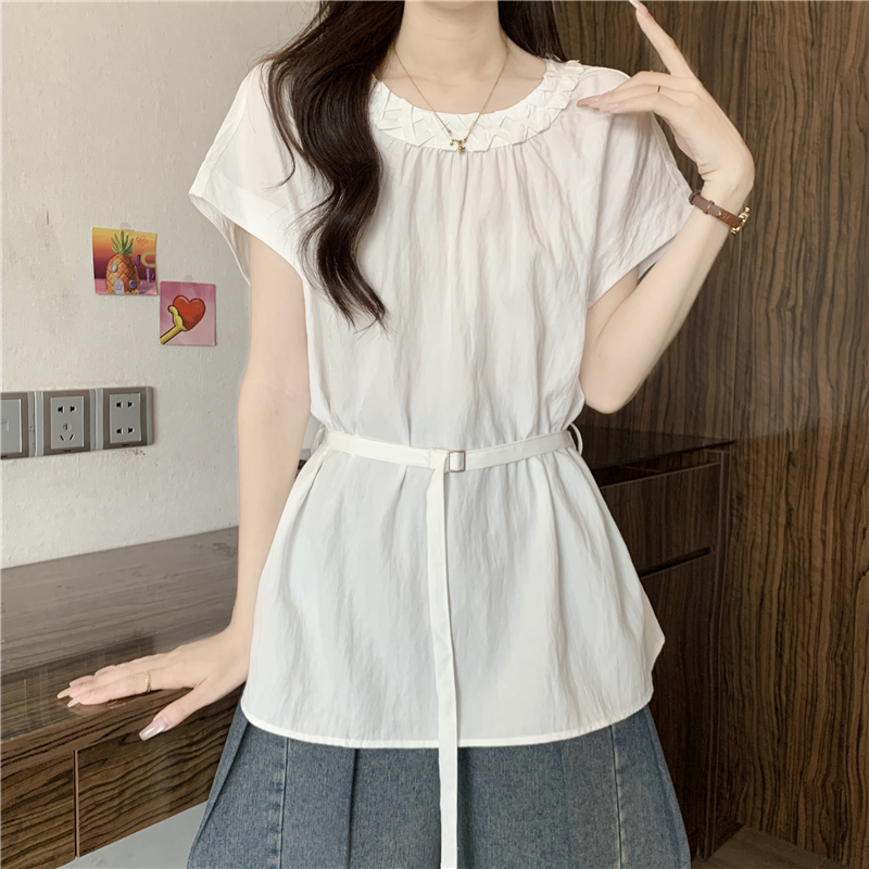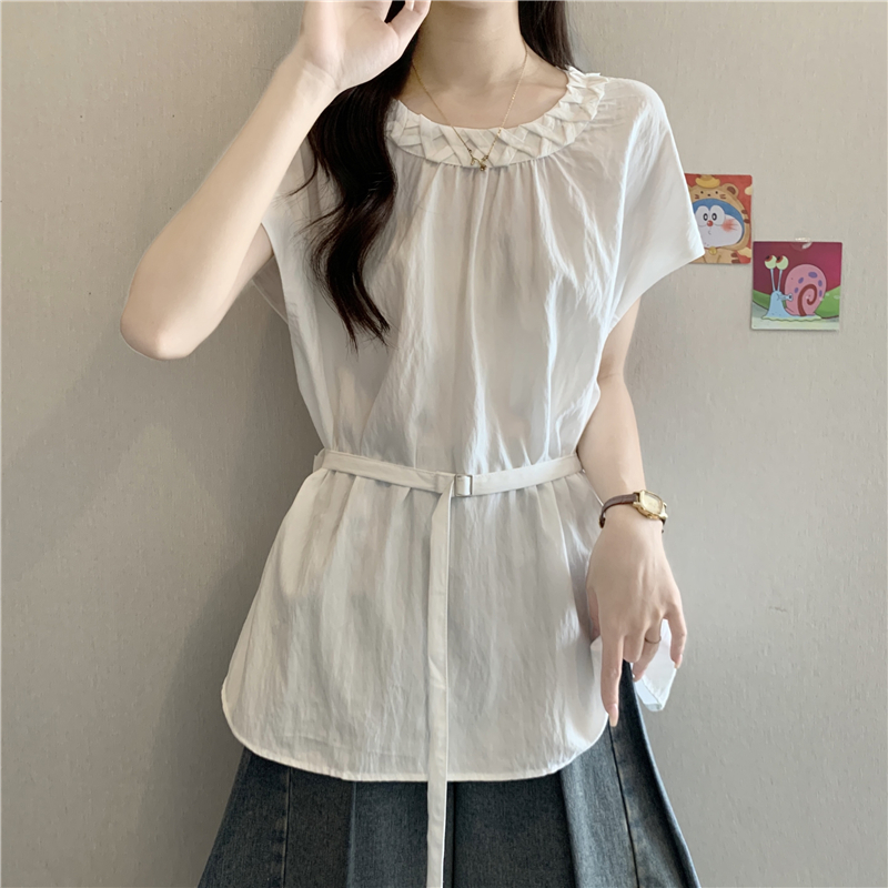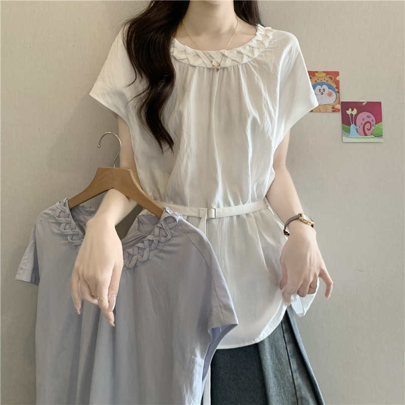 프랑스식 고급 센스 주름 V넥 반팔 여성 셔츠 2026 여름 지방 mm 벨트 허리 수축 표지 고기 슬림해 보이는 맨위