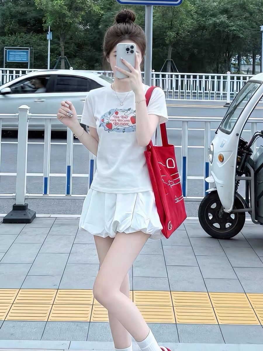 아메리칸 한 부서 알파벳 전체 인쇄 도트 무늬 화이트 반팔 티셔츠 여성 여름 달콤한 스타일 몸매 가꾸기 슬림해 보이는 쇼트 스타일 맨위