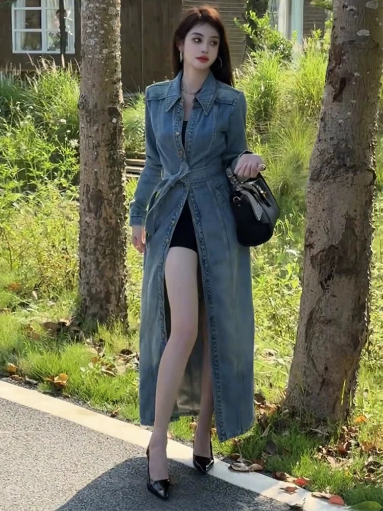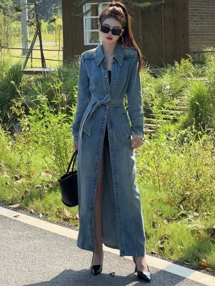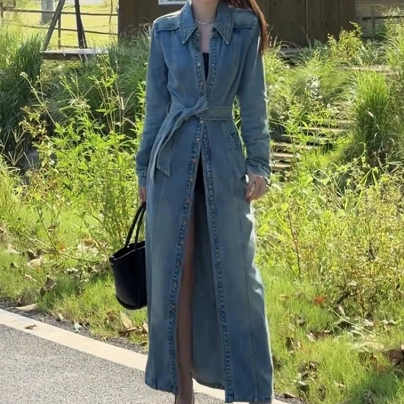 레트로 싱글 줄 버튼 롱 코트 폴로 칼라 데님 바람막이 여성 코트 가을 겨울 새로운 레이스업 허리 수축 슬림해 보이는 품격 코트