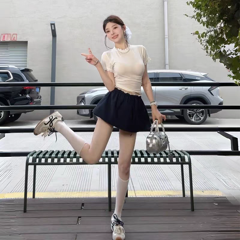 한 부서 자이언트 잘 생긴 프릴 화이트 V넥 반팔 여성 셔츠 여름 새로운 허리 수축 셔츠 맨위 반신 스커트