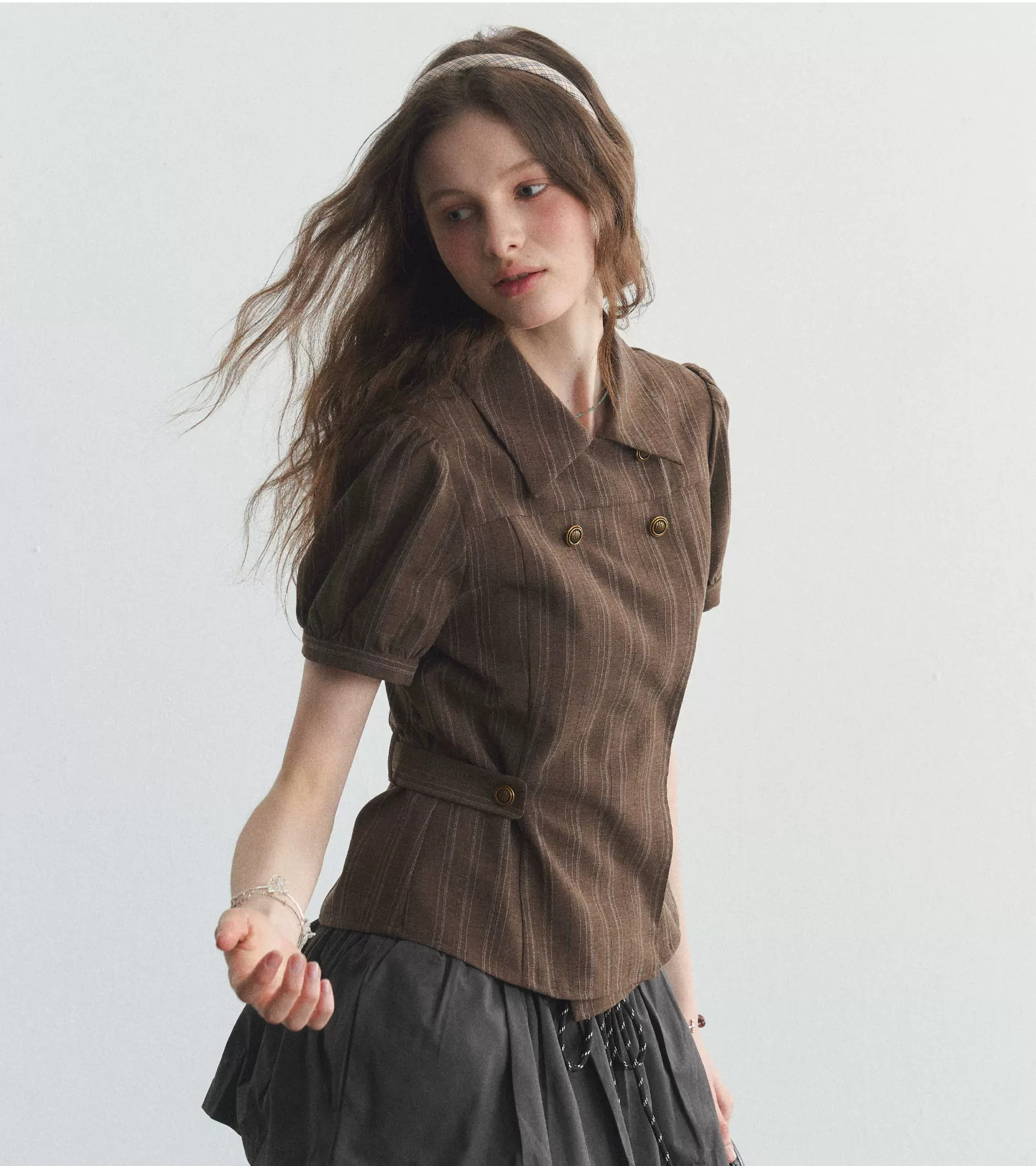 커피 샵 스트라이프 이중 버튼 셔츠 수 있습니다. 조정 허리 수축 거품 소매 티셔츠 반팔