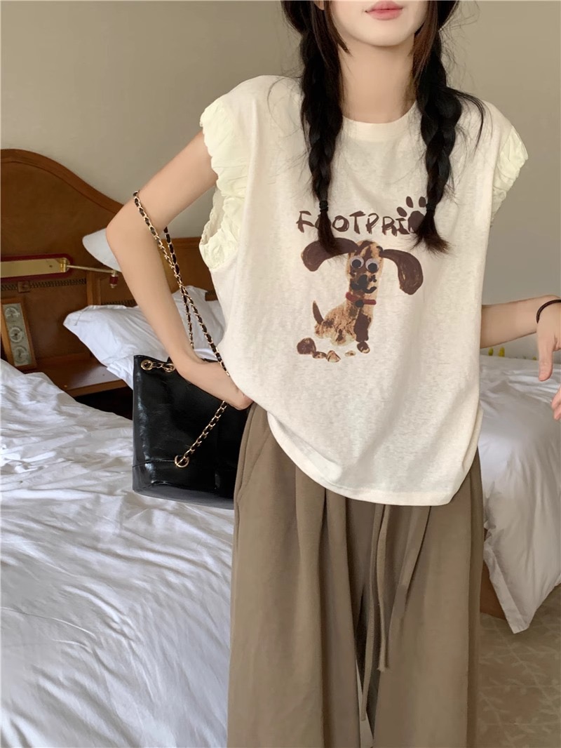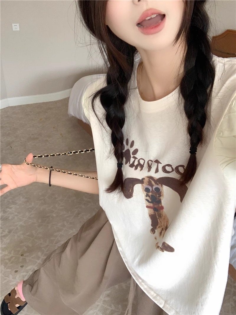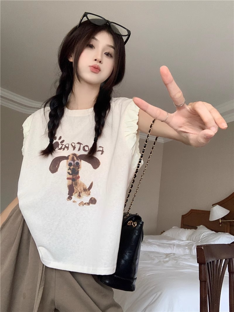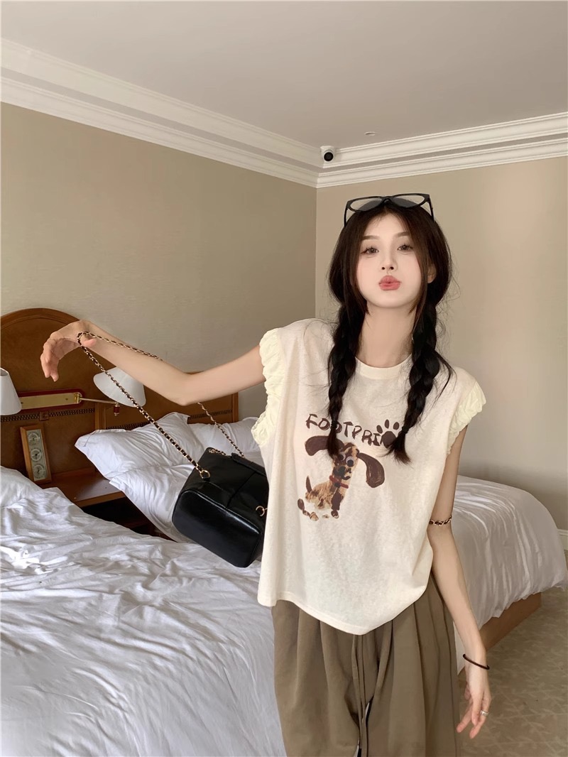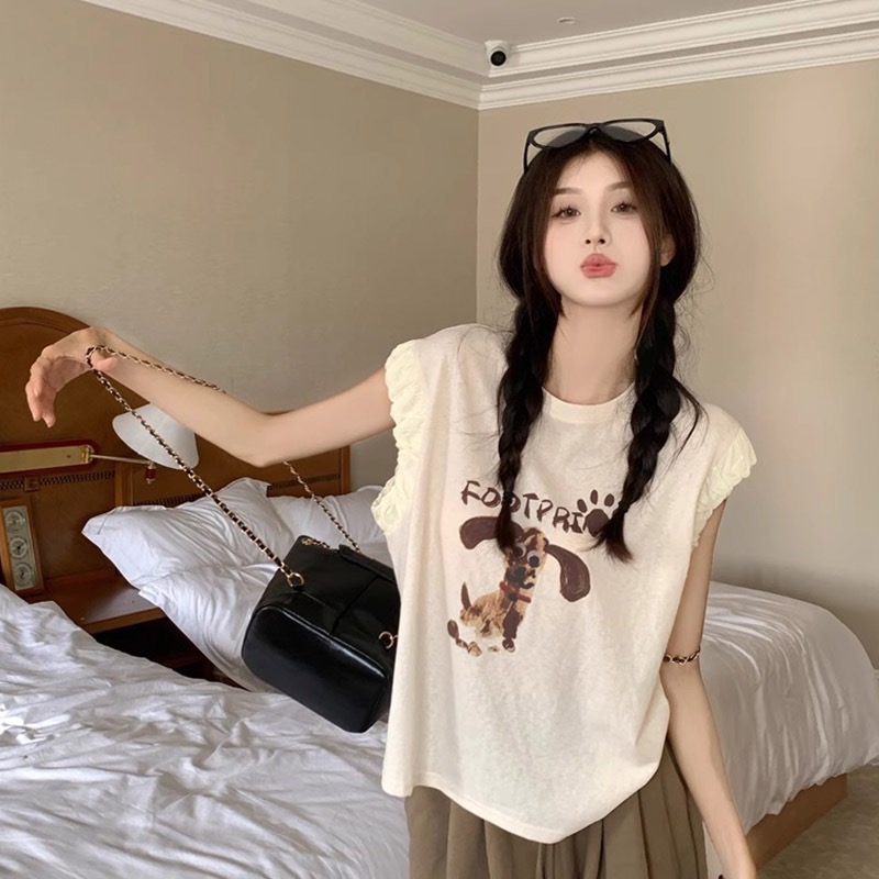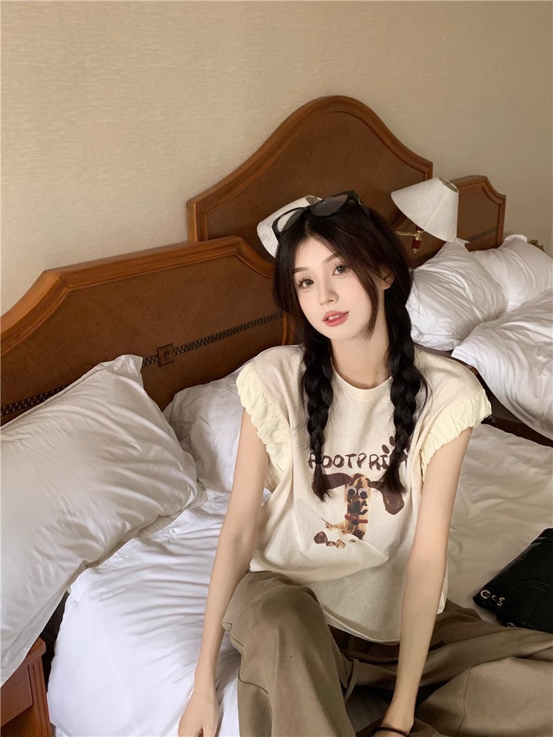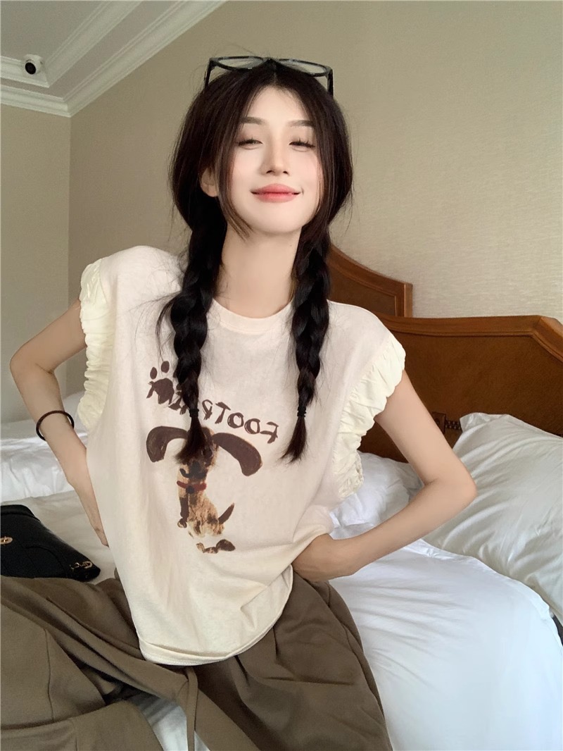 경관 그림 정가 아메리칸 레트로 프린트 반팔 여성 티셔츠 여름 새로운 루즈핏 작은 대중 긍정적 인 어깨 작은 날다 소매 맨위