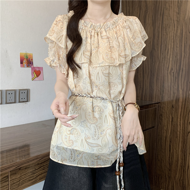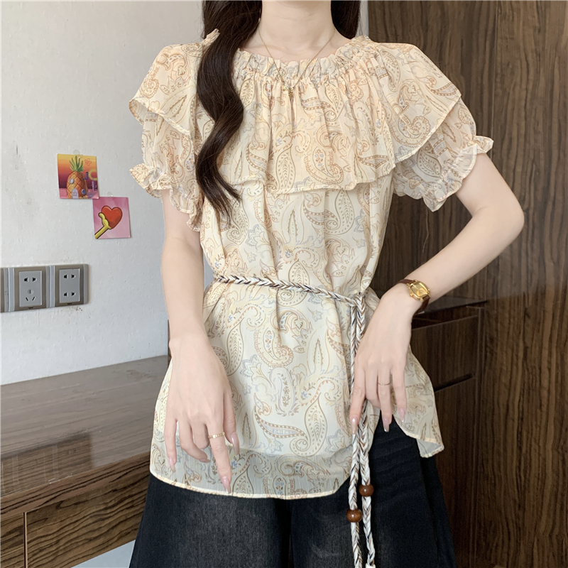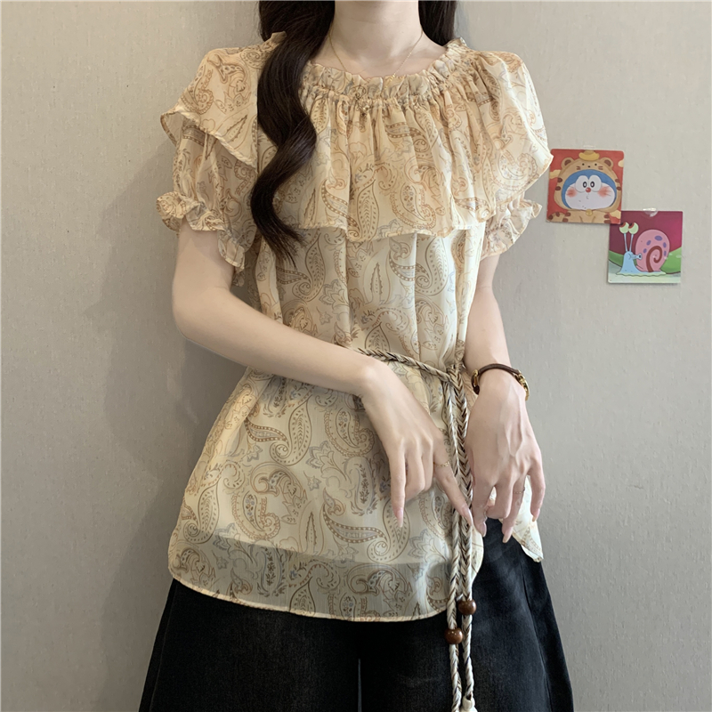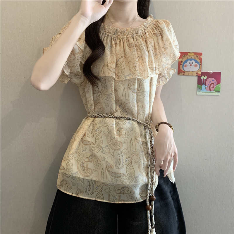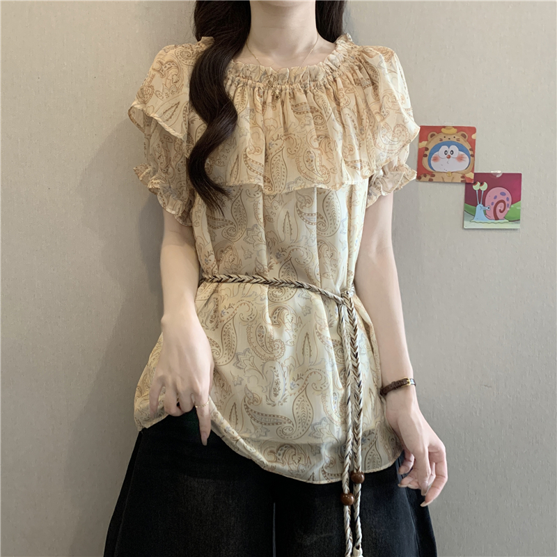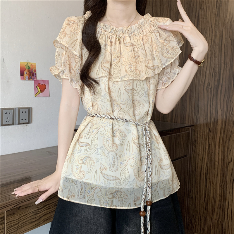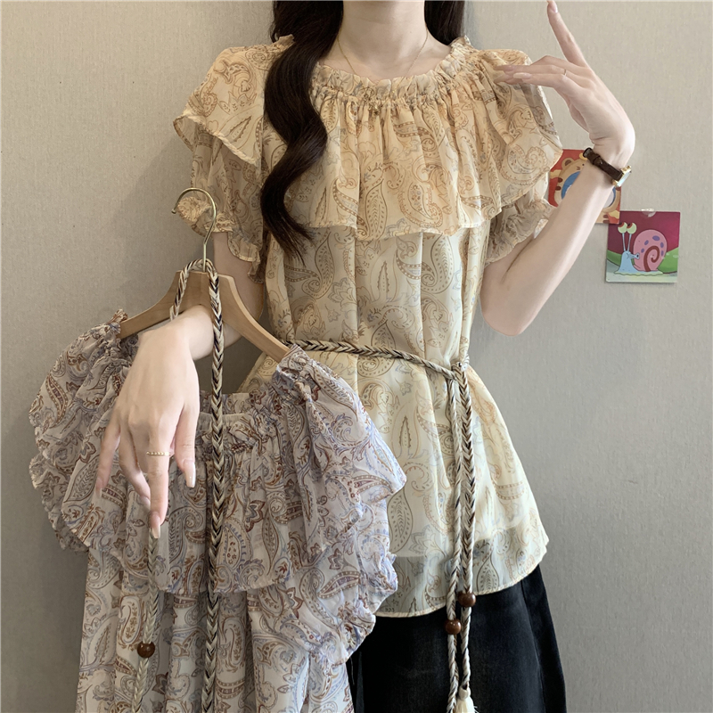 레트로 디자인 센스 나비 프린트 반팔 여성 셔츠 여름 지방 mm 루즈핏 표지 배 펌프 로프 허리 수축 Chic 맨위