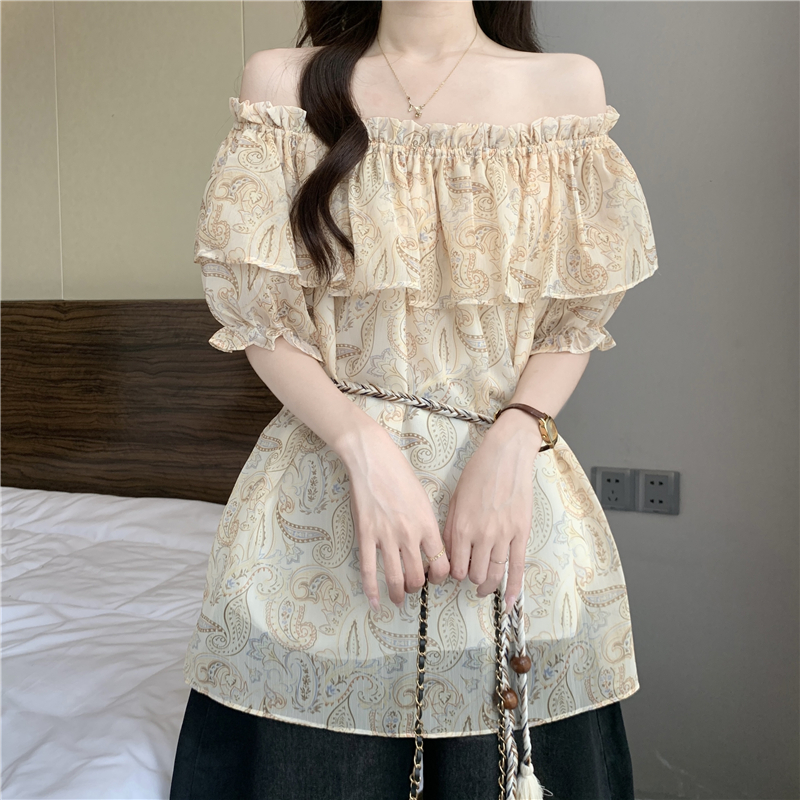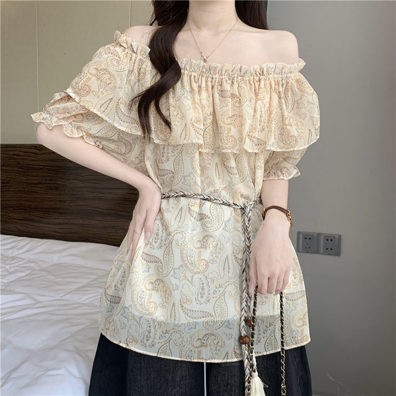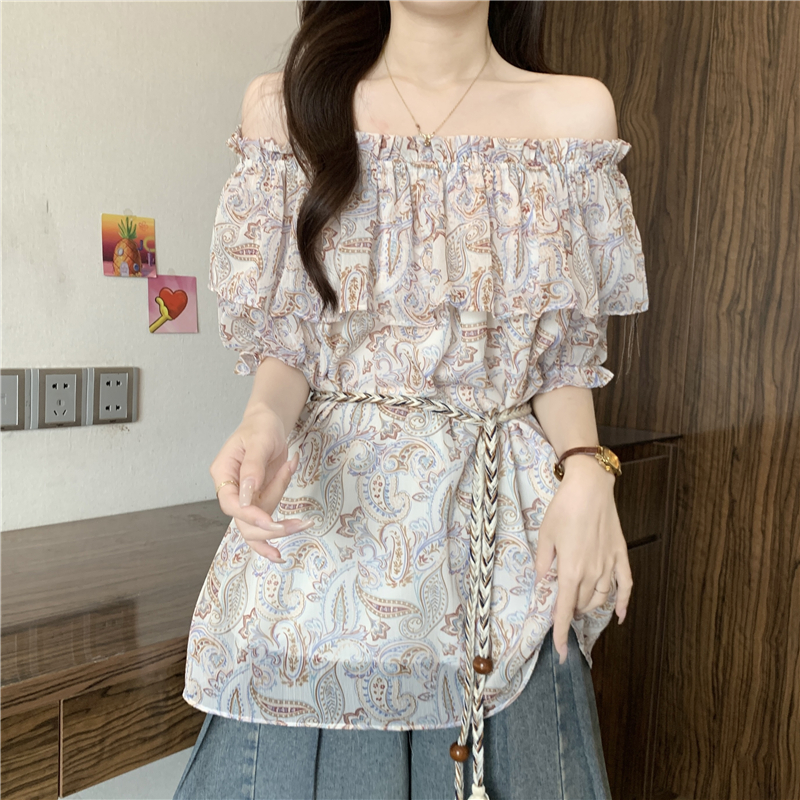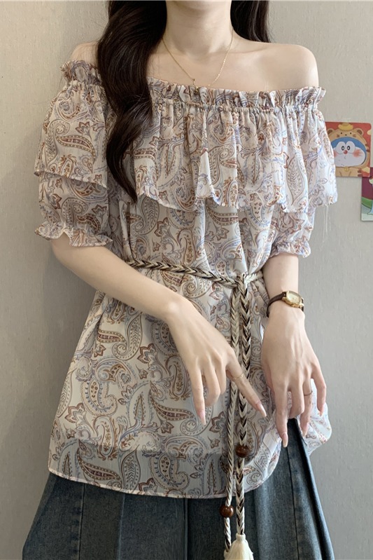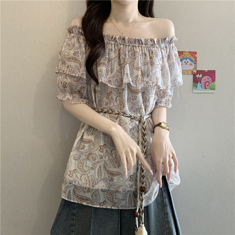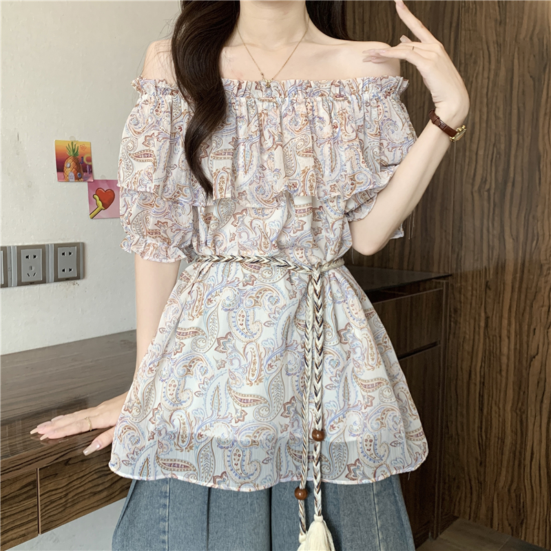 레트로 꽃무늬 보트넥 반팔 여성 셔츠 여름 2026 빅 사이즈 지방 mm 슬림해 보이는 레이스업 허리 수축 오프숄더 맨위