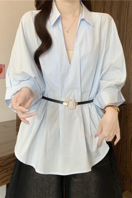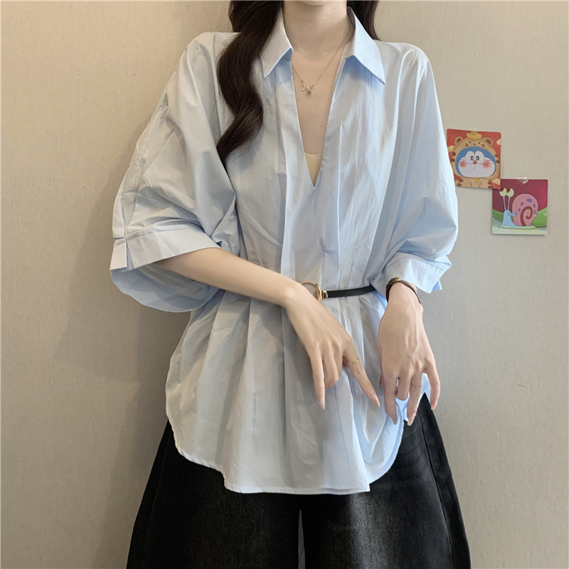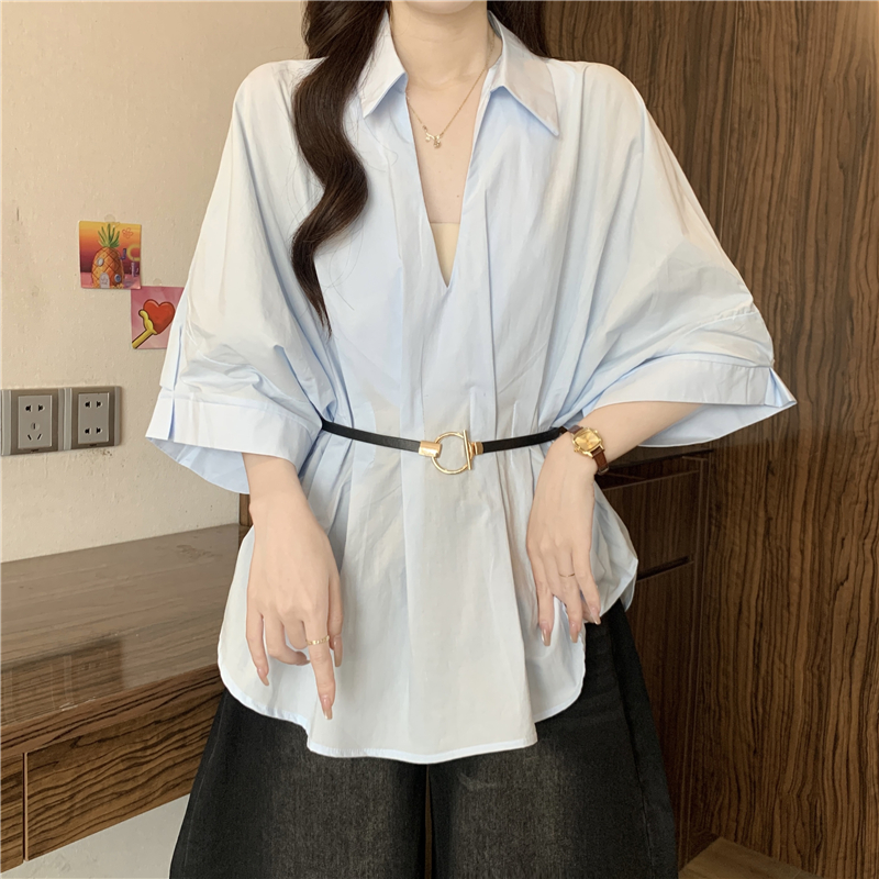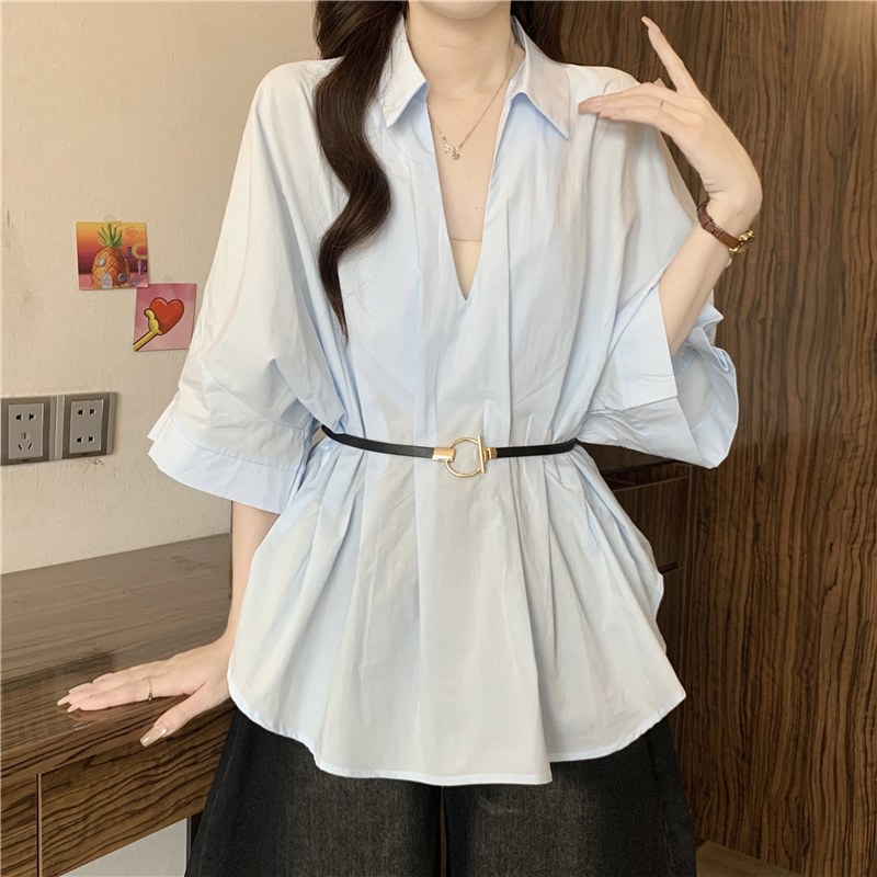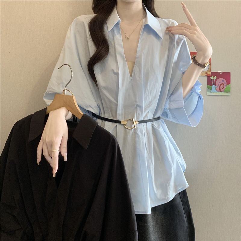 프랑스식 화이트 V넥 긍정적 인 어깨 반팔 여성 셔츠 여름 빅 사이즈 지방 mm 스트랩 허리 수축 불규칙 리본 맨위