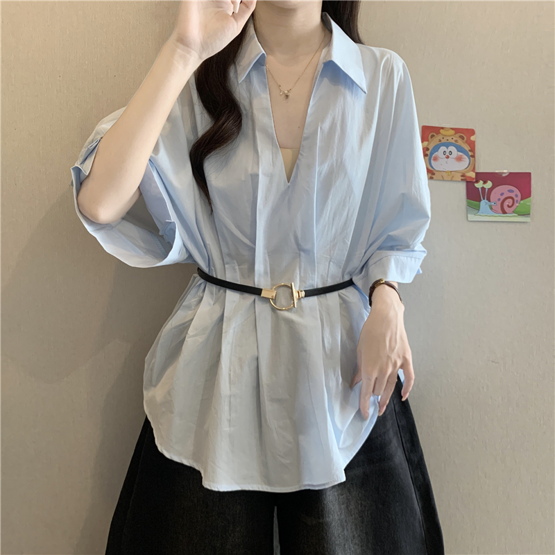 프랑스식 고급 센스 주름 V넥 반팔 여성 셔츠 2026 여름 지방 mm 벨트 허리 수축 표지 고기 슬림해 보이는 맨위