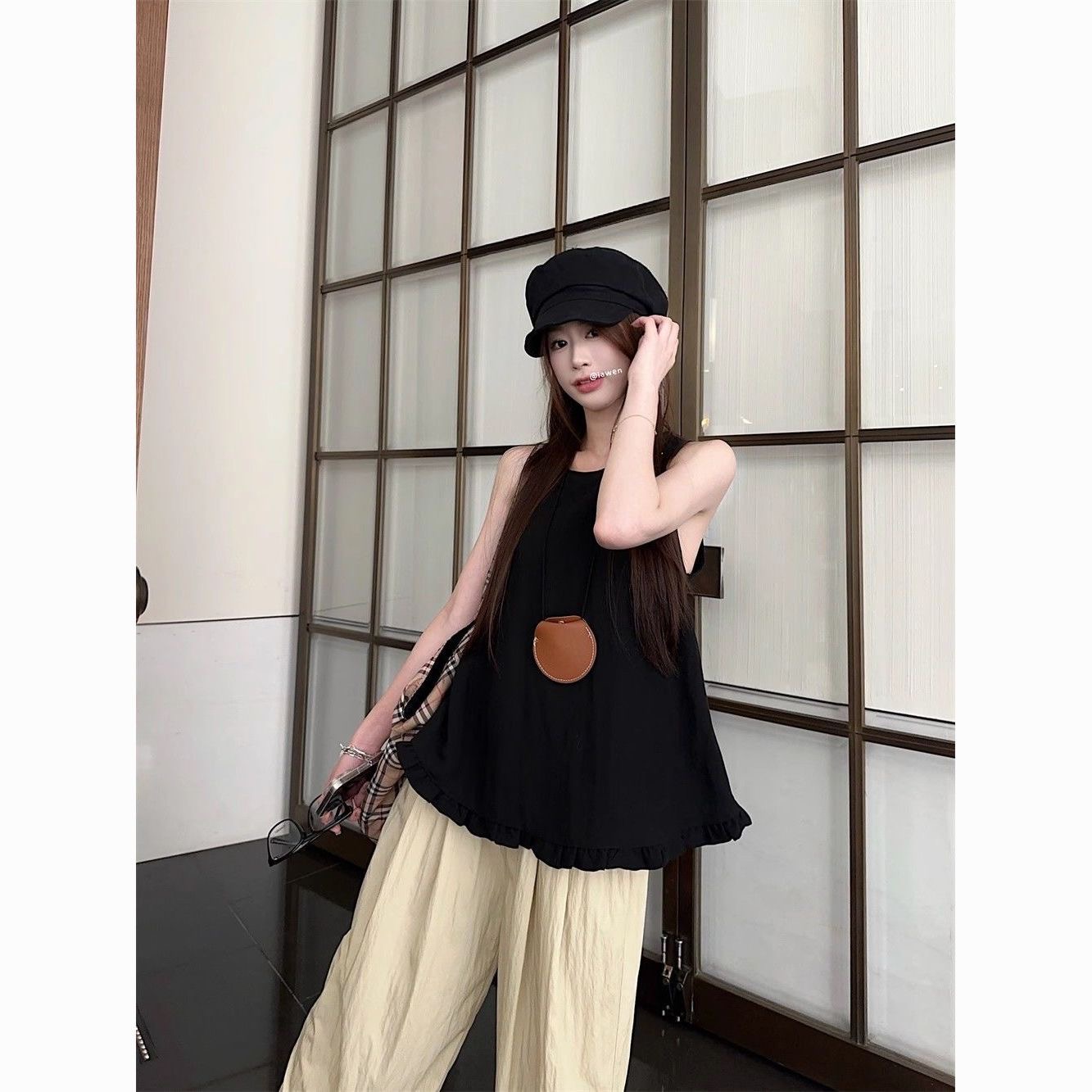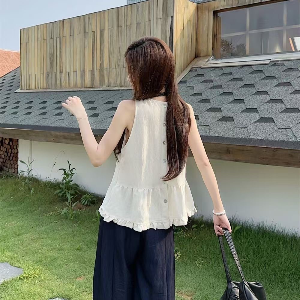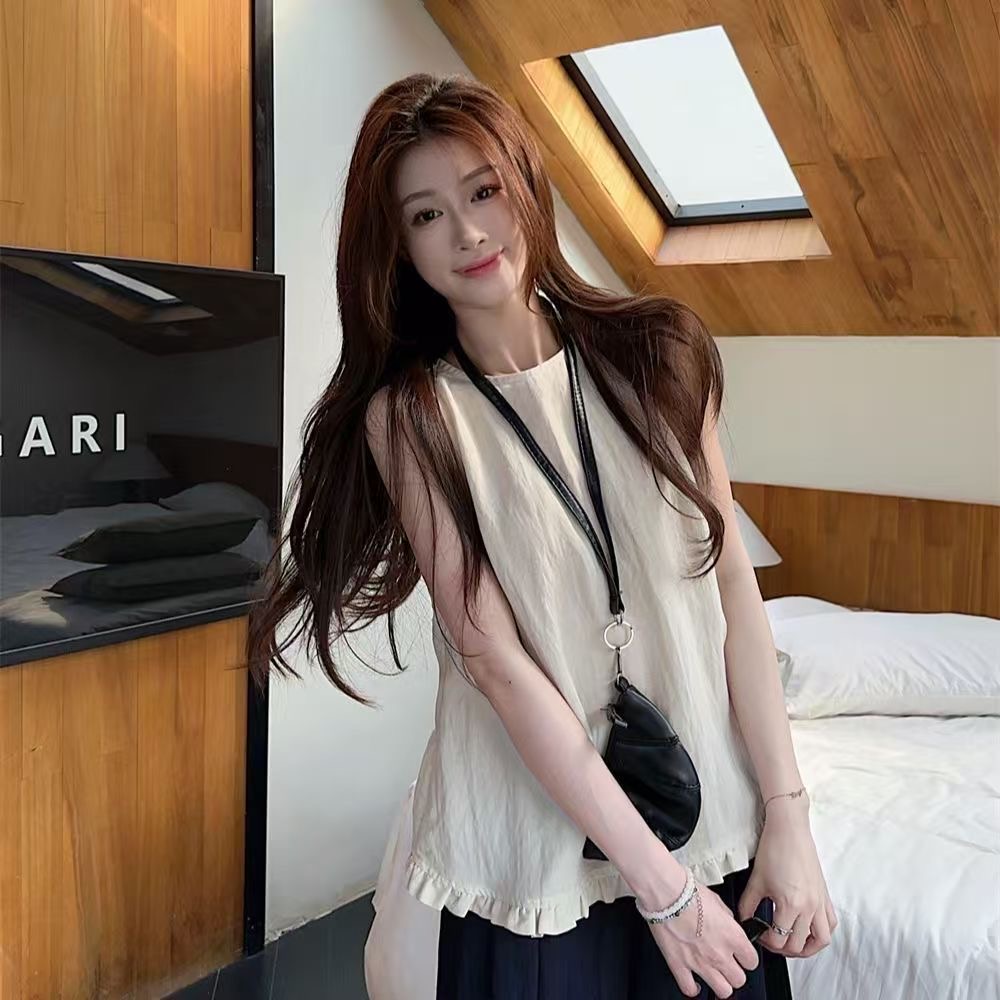 패션 디자인 프릴 단색 민소매 조끼 여성 여름 2025 새로운 면 센스 루즈핏 슬림해 보이는 슬립 맨위