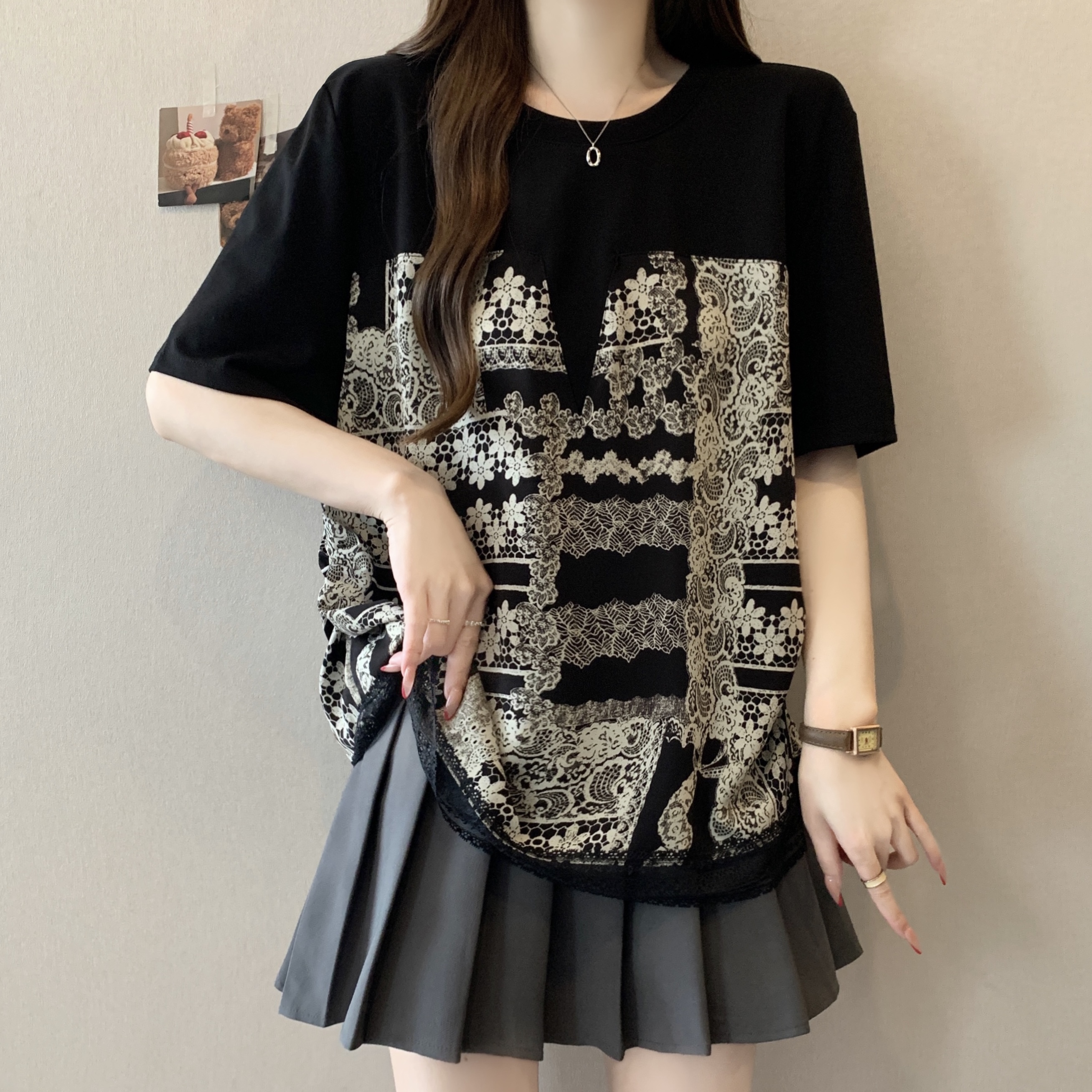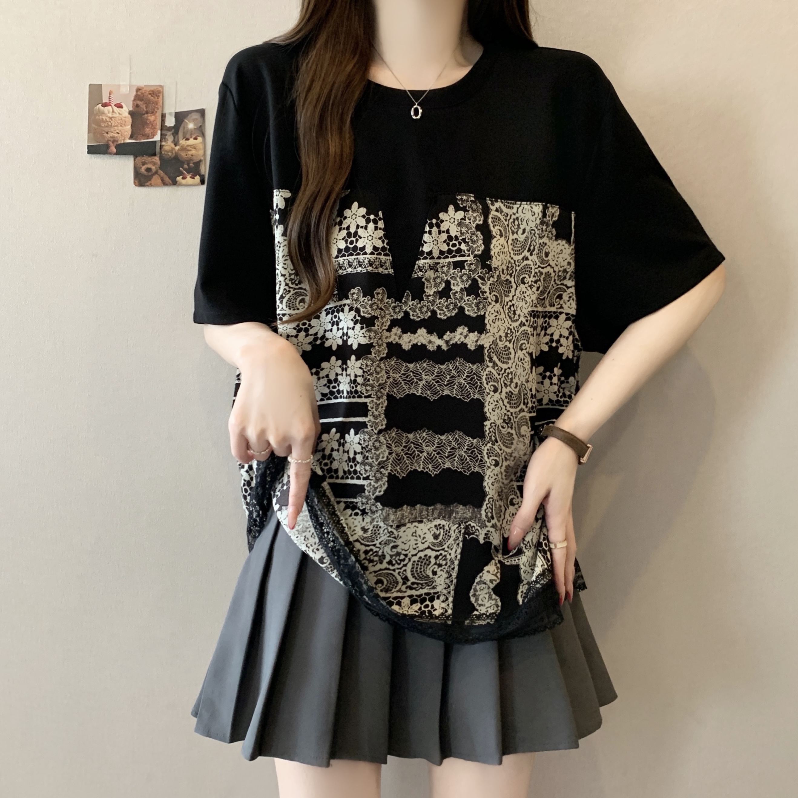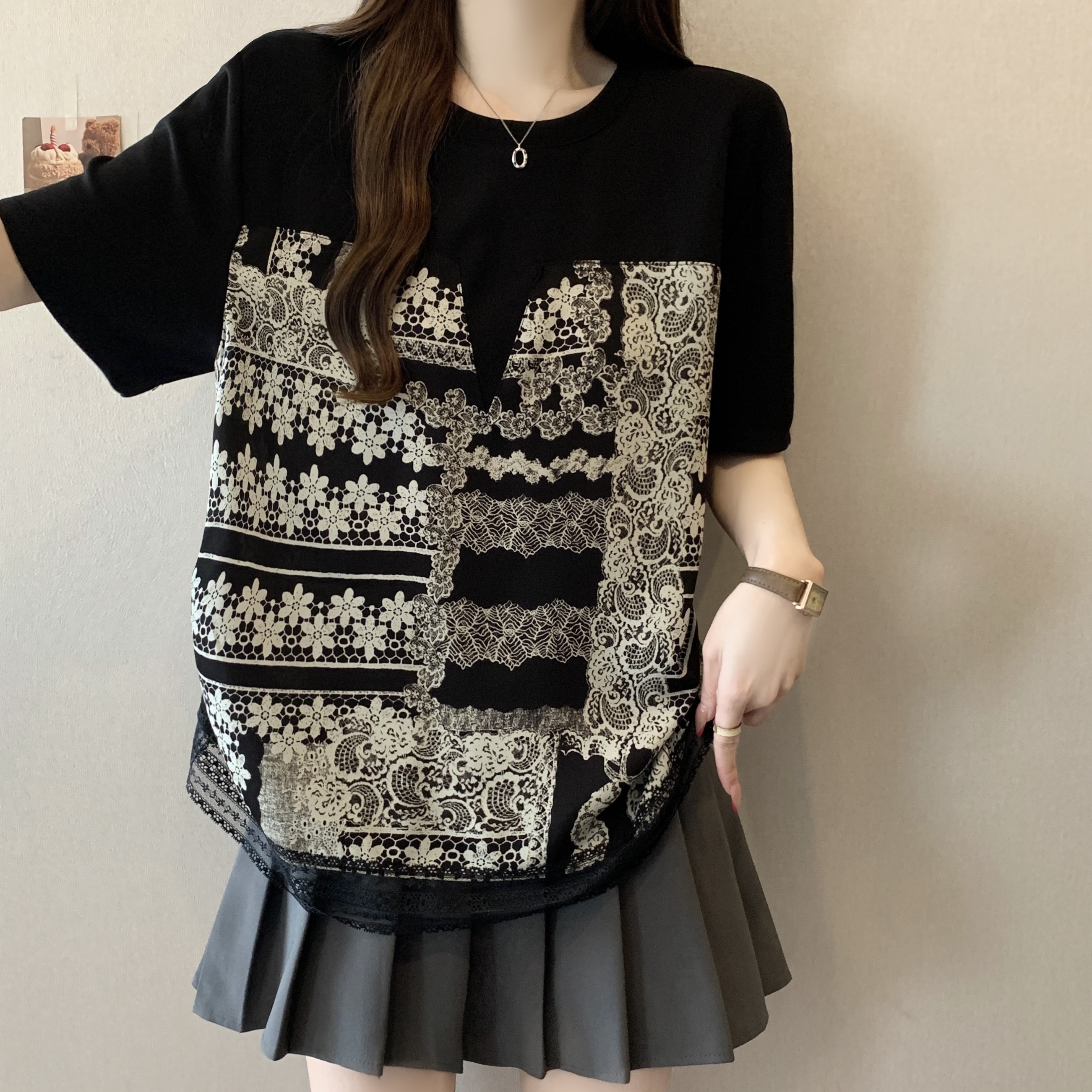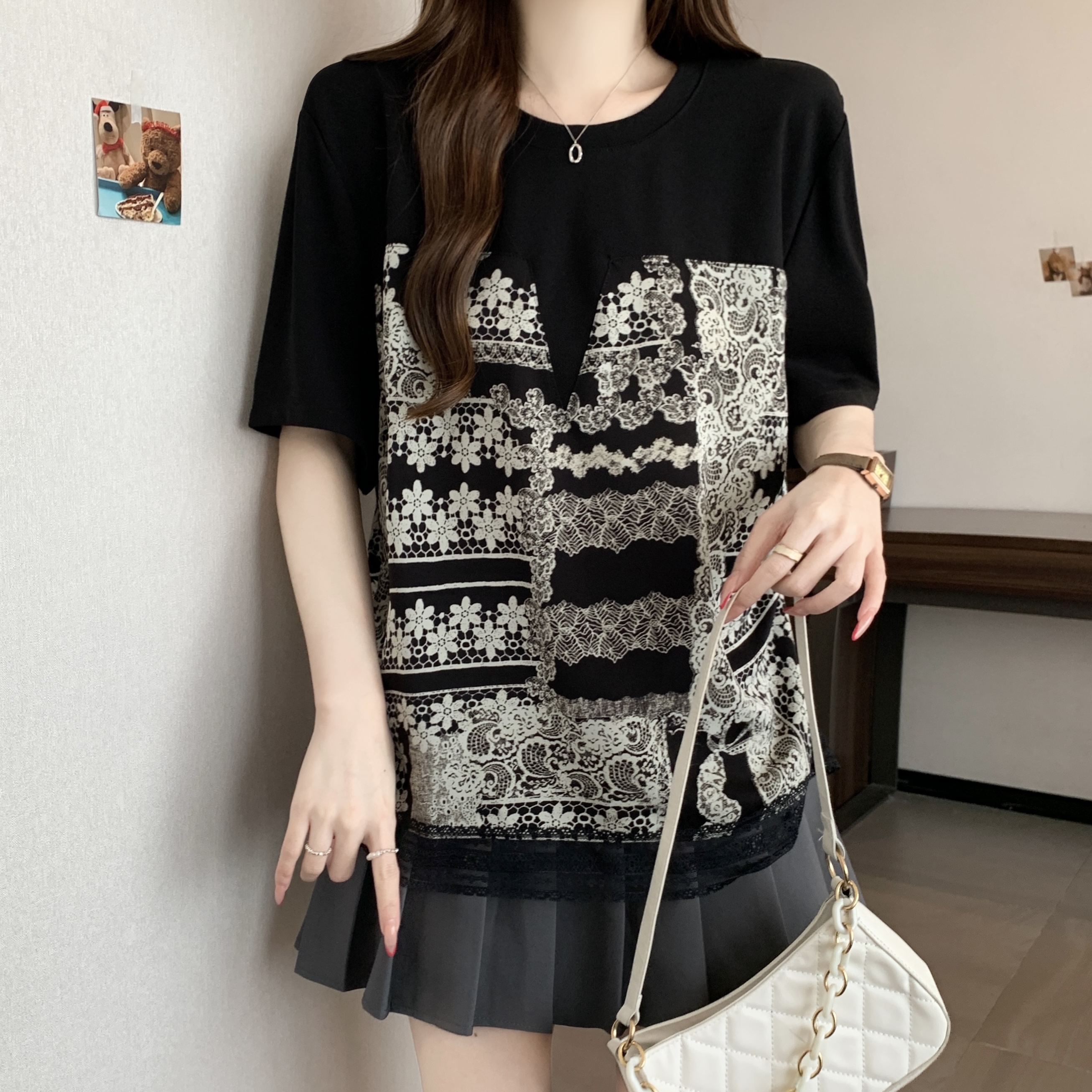 지방 mm 검정색 반팔 티셔츠 여성 2026 새로운 표지 배 슬림해 보이는 프릴 망사 패치워크 품격 맨위