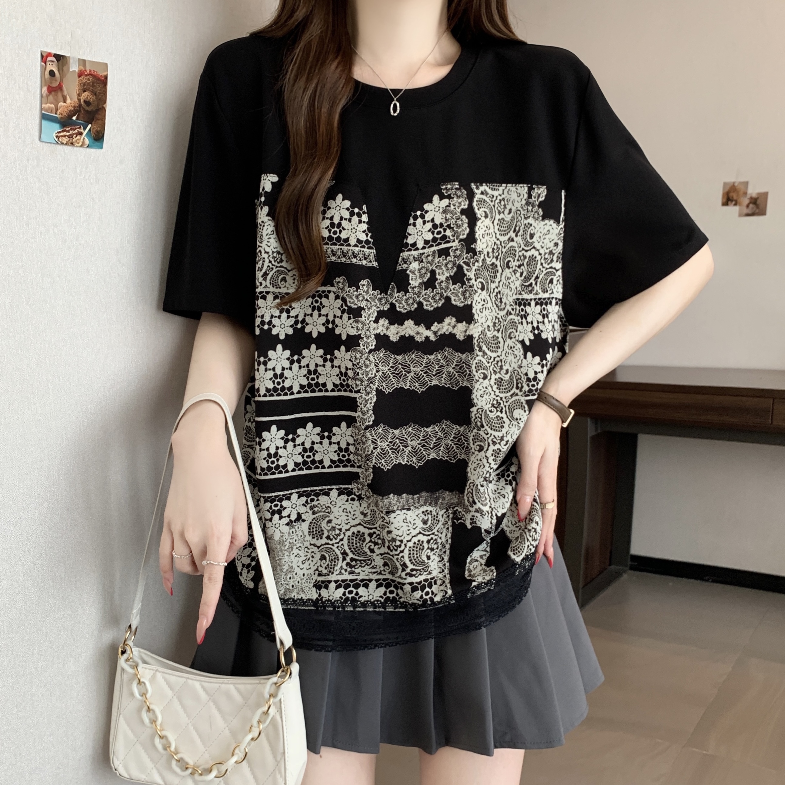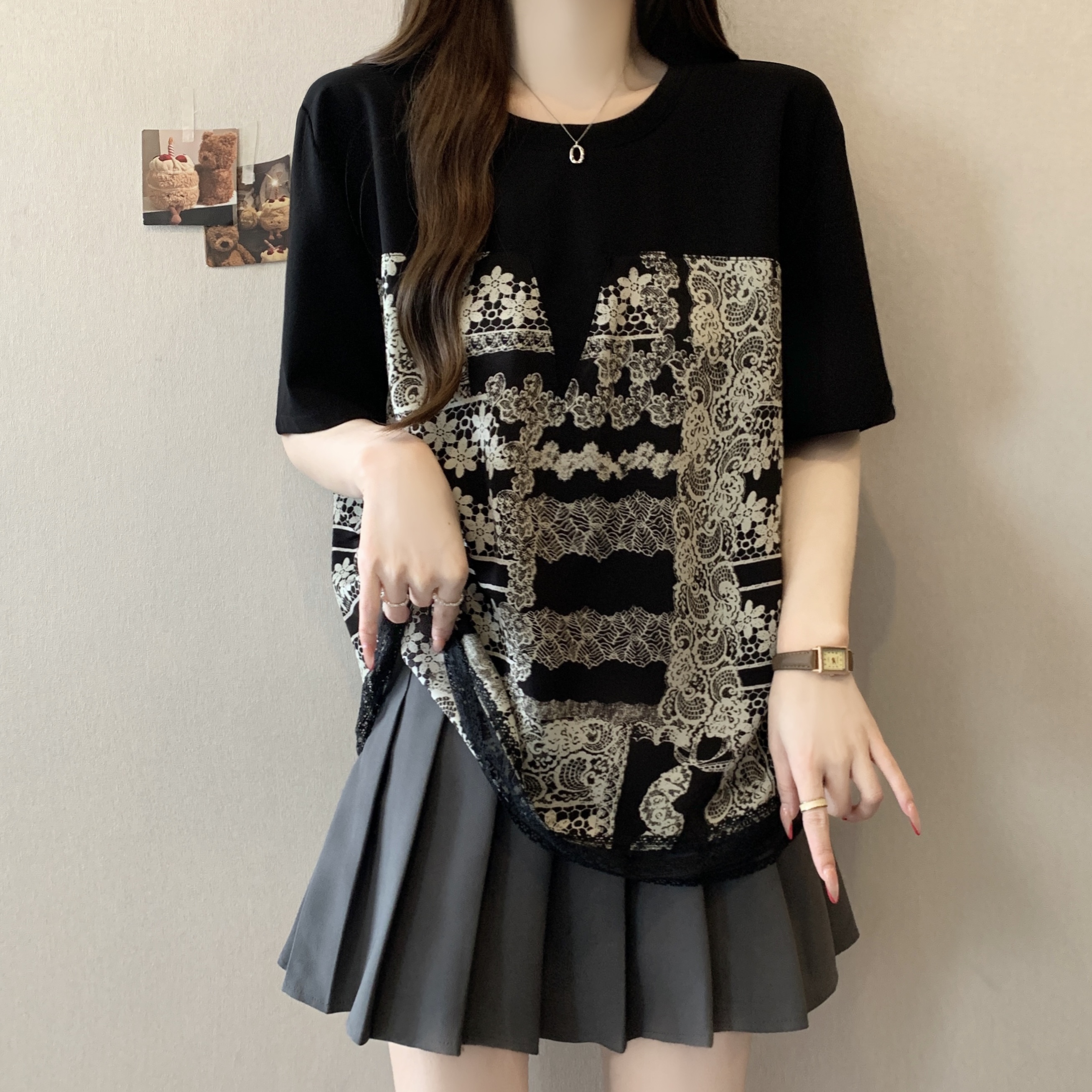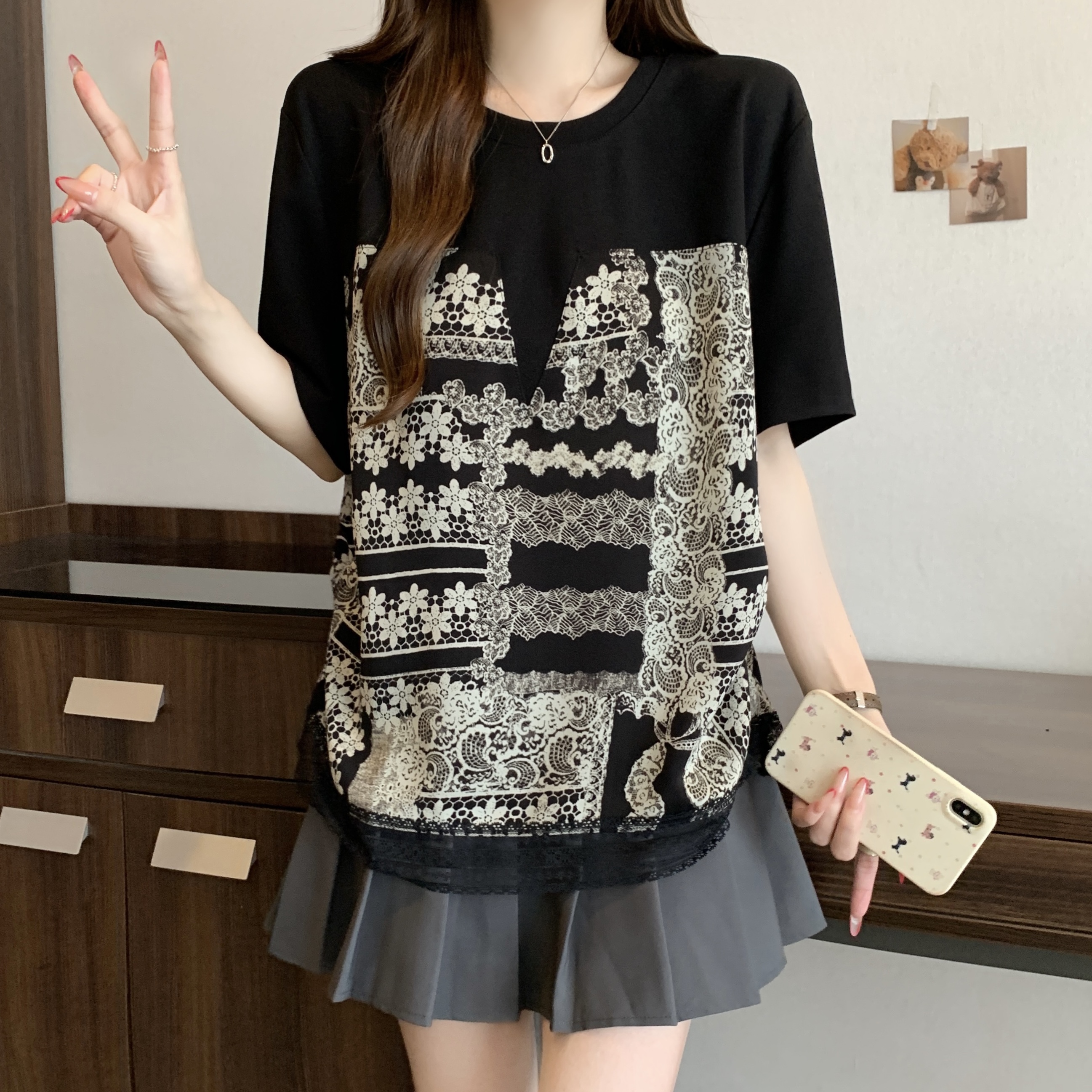지방 mm 검정색 반팔 티셔츠 여성 2026 새로운 표지 배 슬림해 보이는 프릴 망사 패치워크 품격 맨위