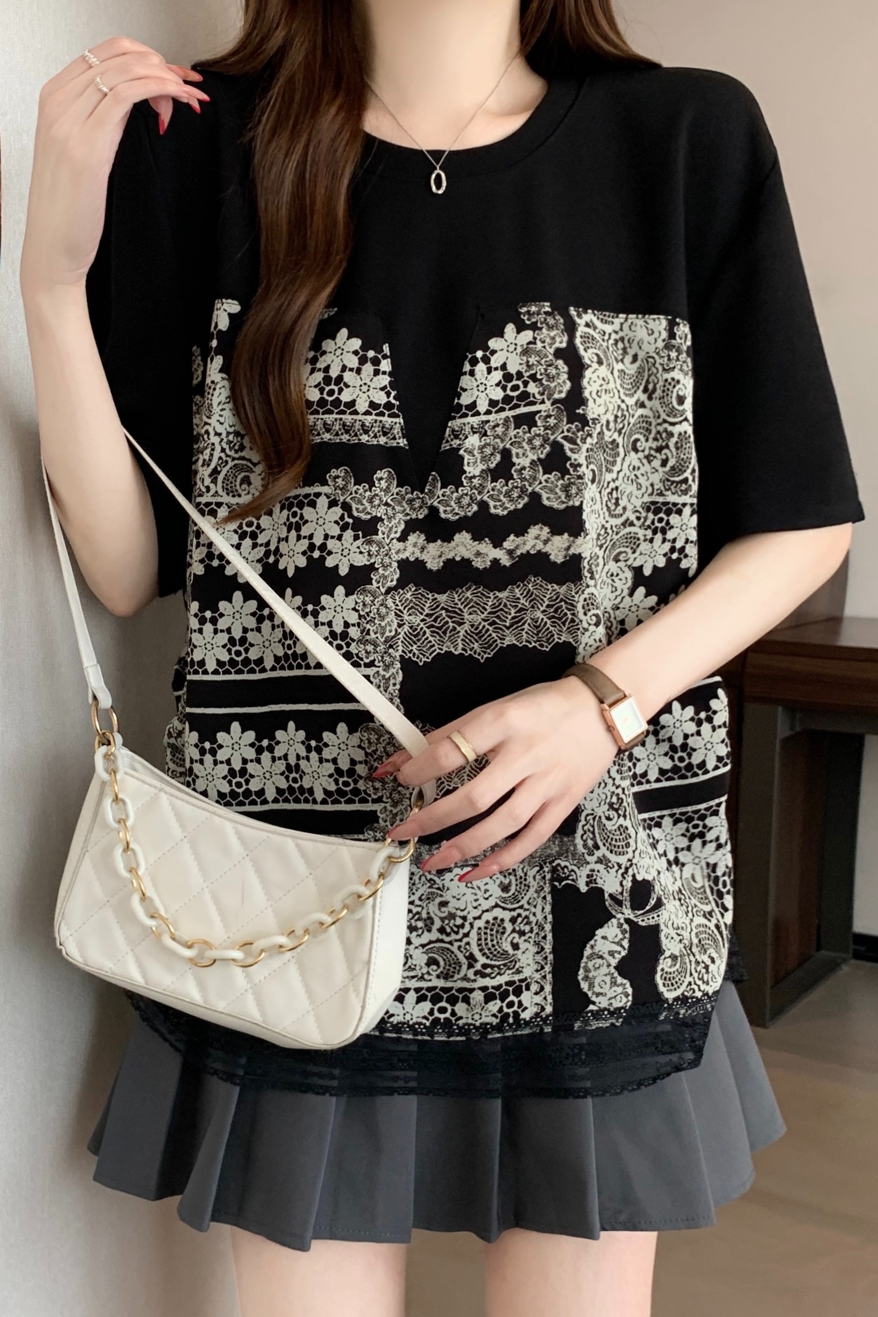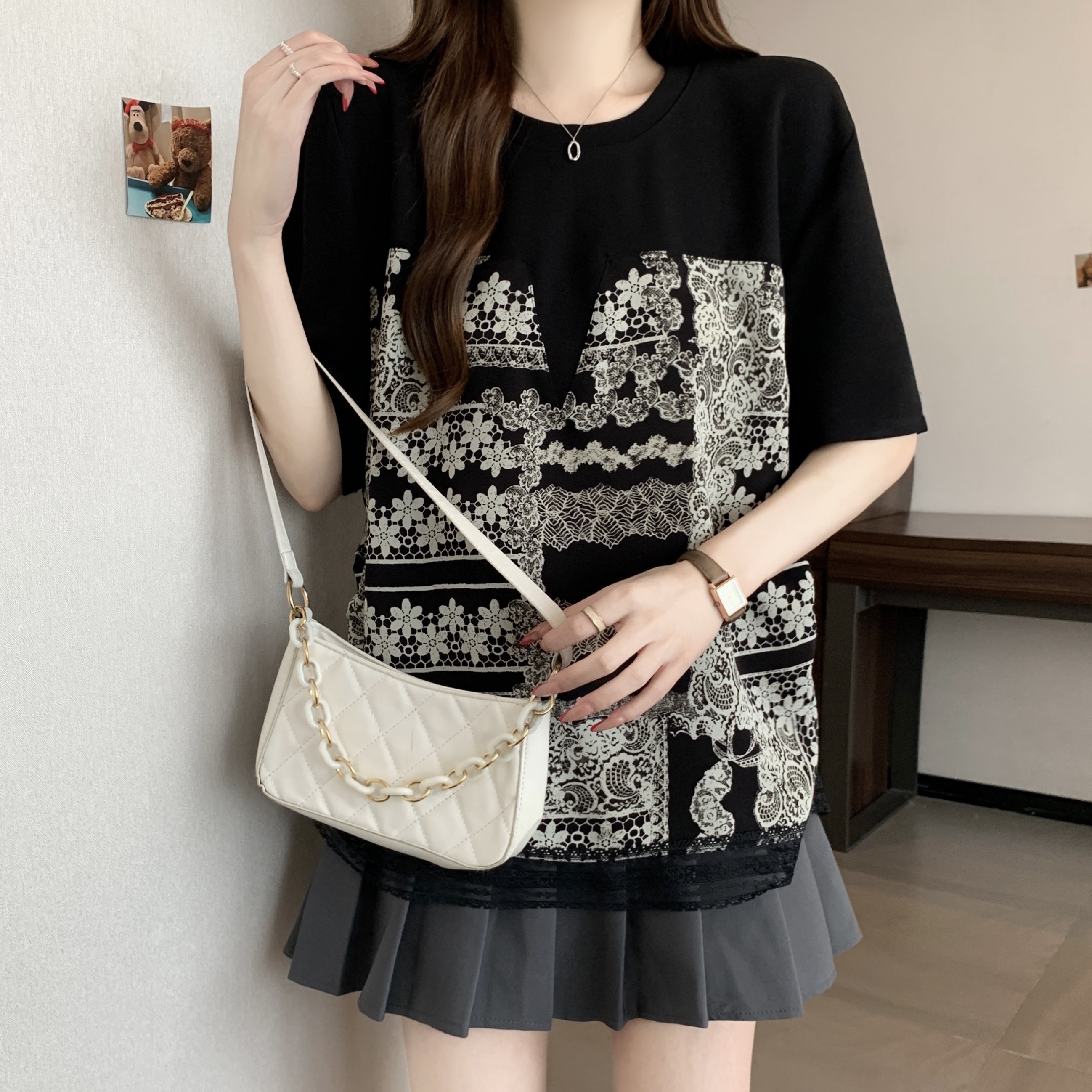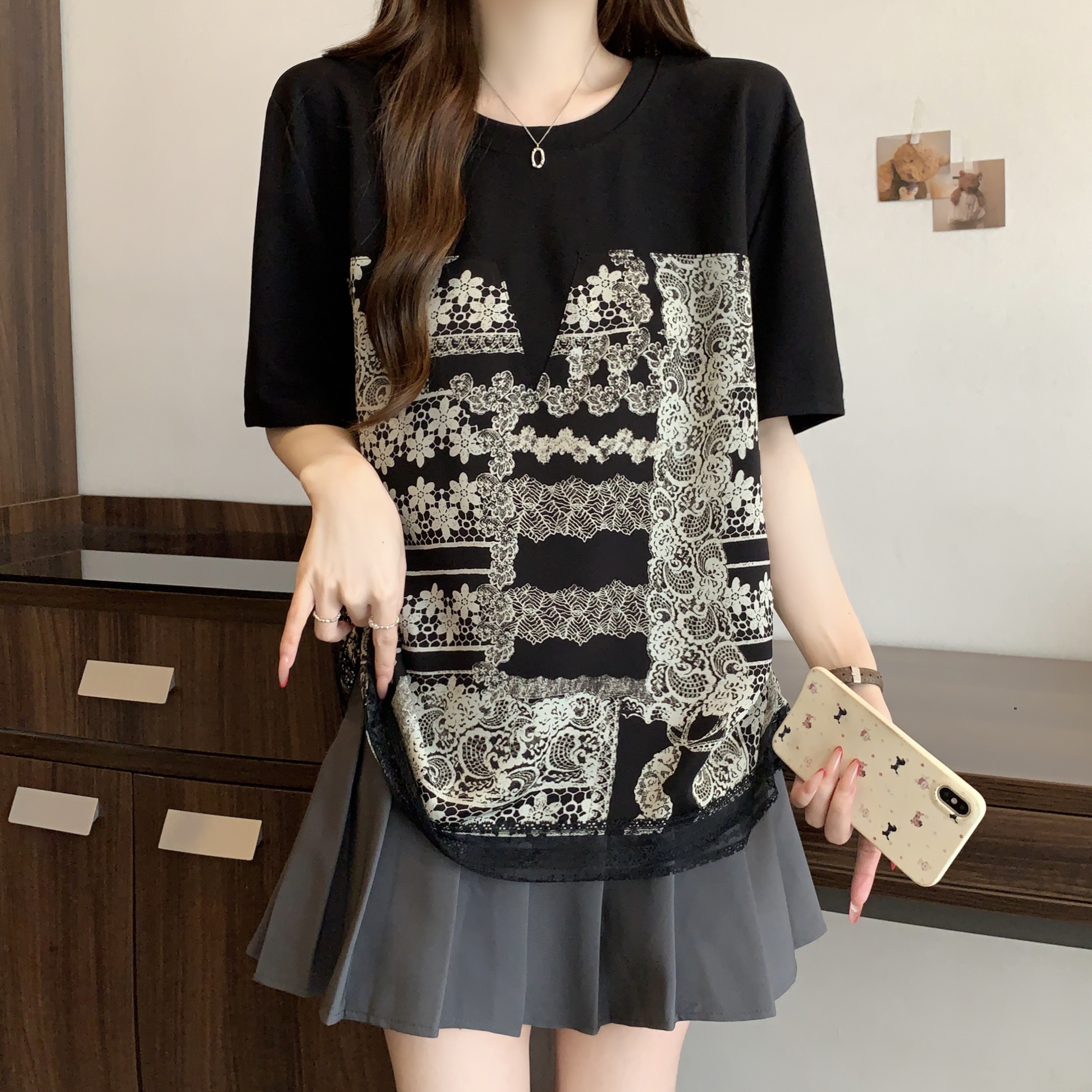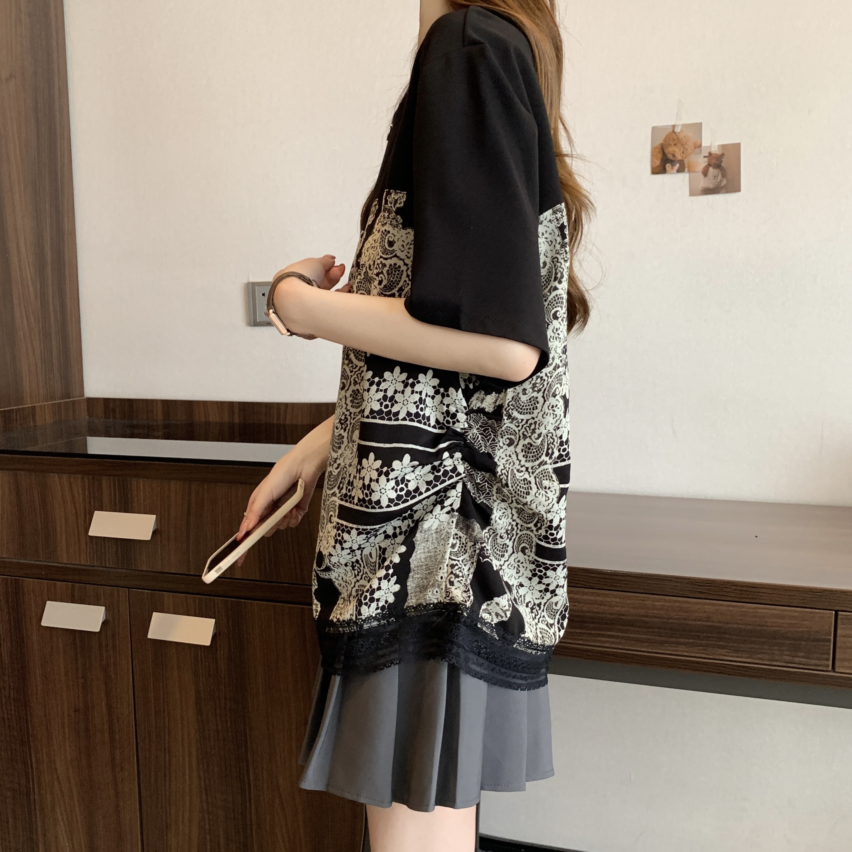 지방 mm 검정색 반팔 티셔츠 여성 2026 새로운 표지 배 슬림해 보이는 프릴 망사 패치워크 품격 맨위