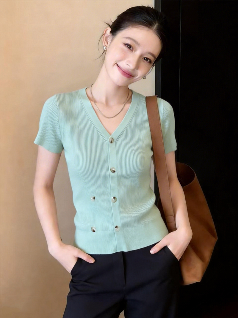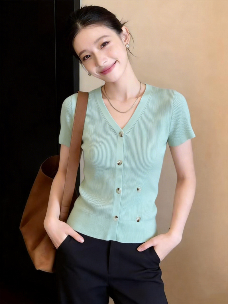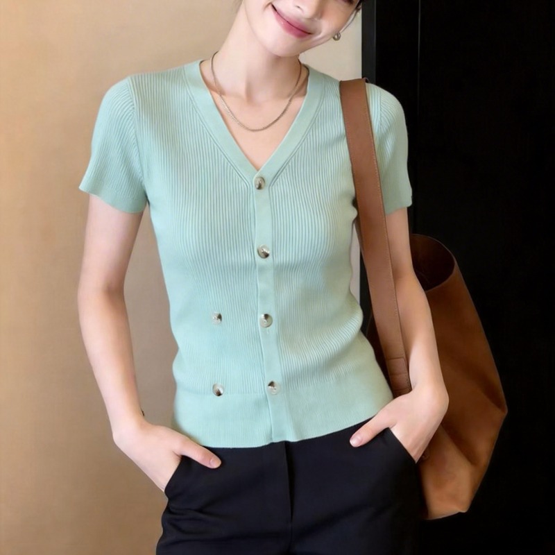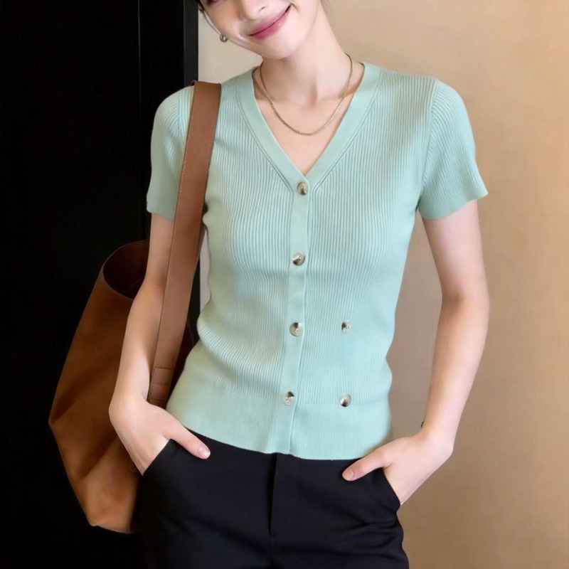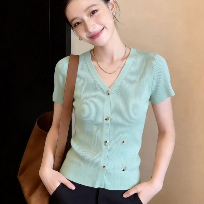 작은 샤넬 스타일 핑크색 숄 V넥 니트 얼음 실크 반팔 티셔츠 여성 여름 슈퍼 잘 생긴 부드러운 고유 한 쇼트 스타일 맨위