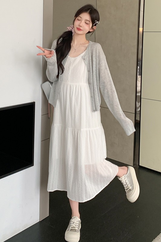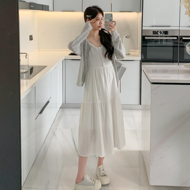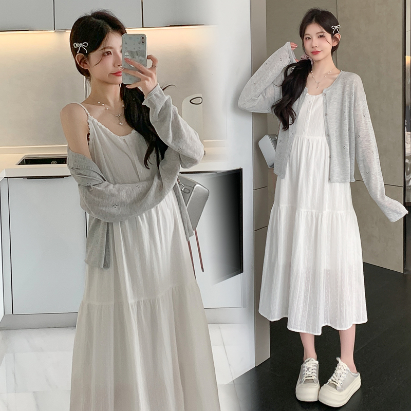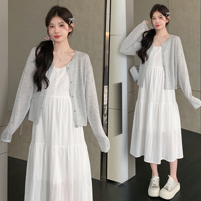 지금 실사 2026 여름 새로운 임산부 레이스 슬립 드레스 홀로우 아웃 니트 자외선 차단 오픈 가디건