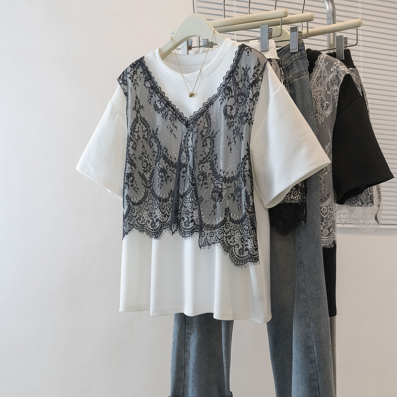 실사 빅 사이즈 여성 의류 한국 스타일 새로운 디자인 작은 대중 레이스 조각 슬림해 보이는 캐주얼 루즈핏 다용도 맨위