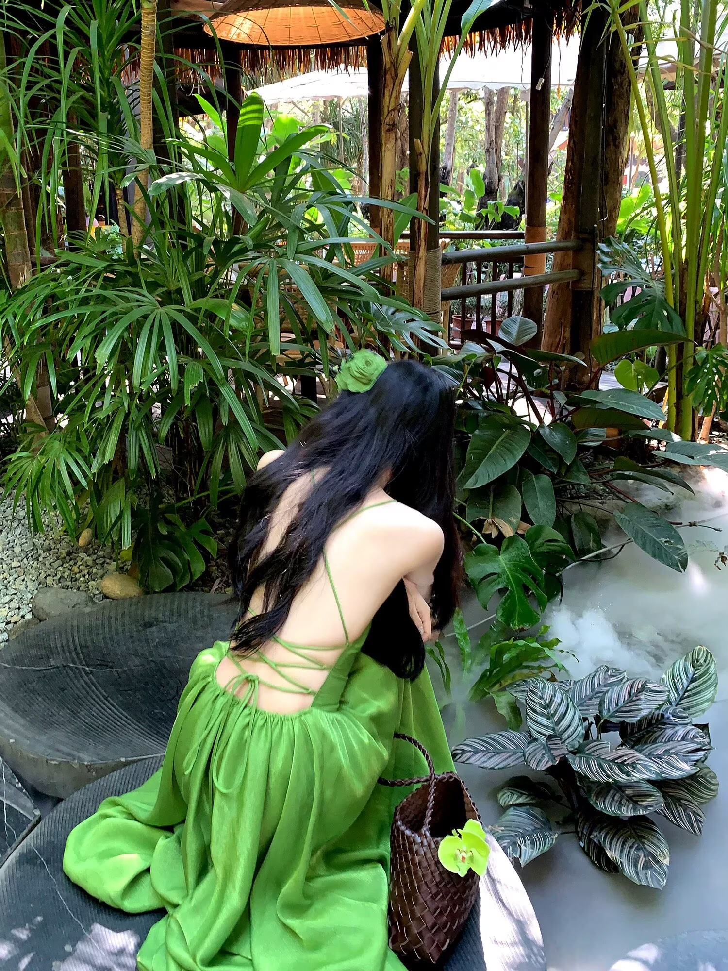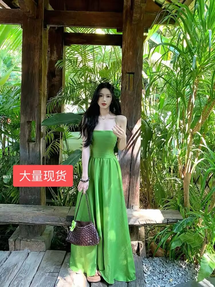 하나 달콤한 복숭아 yikett 인간 그린 필드 여름 휴가 백리스 슬립 여성 드레스 품격 롱 스커트
