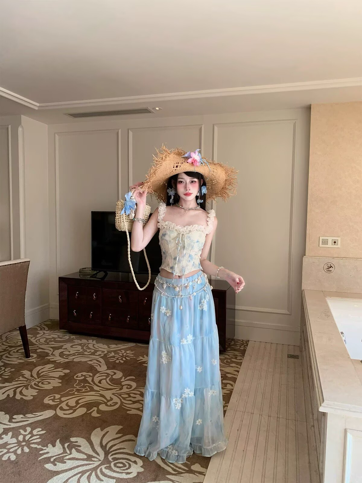 gege shop 꽃무늬 레이스 레이스 캐미솔 파란색 꽃 롱 코트 반신 스커트 휴가 착용 가져 가라.