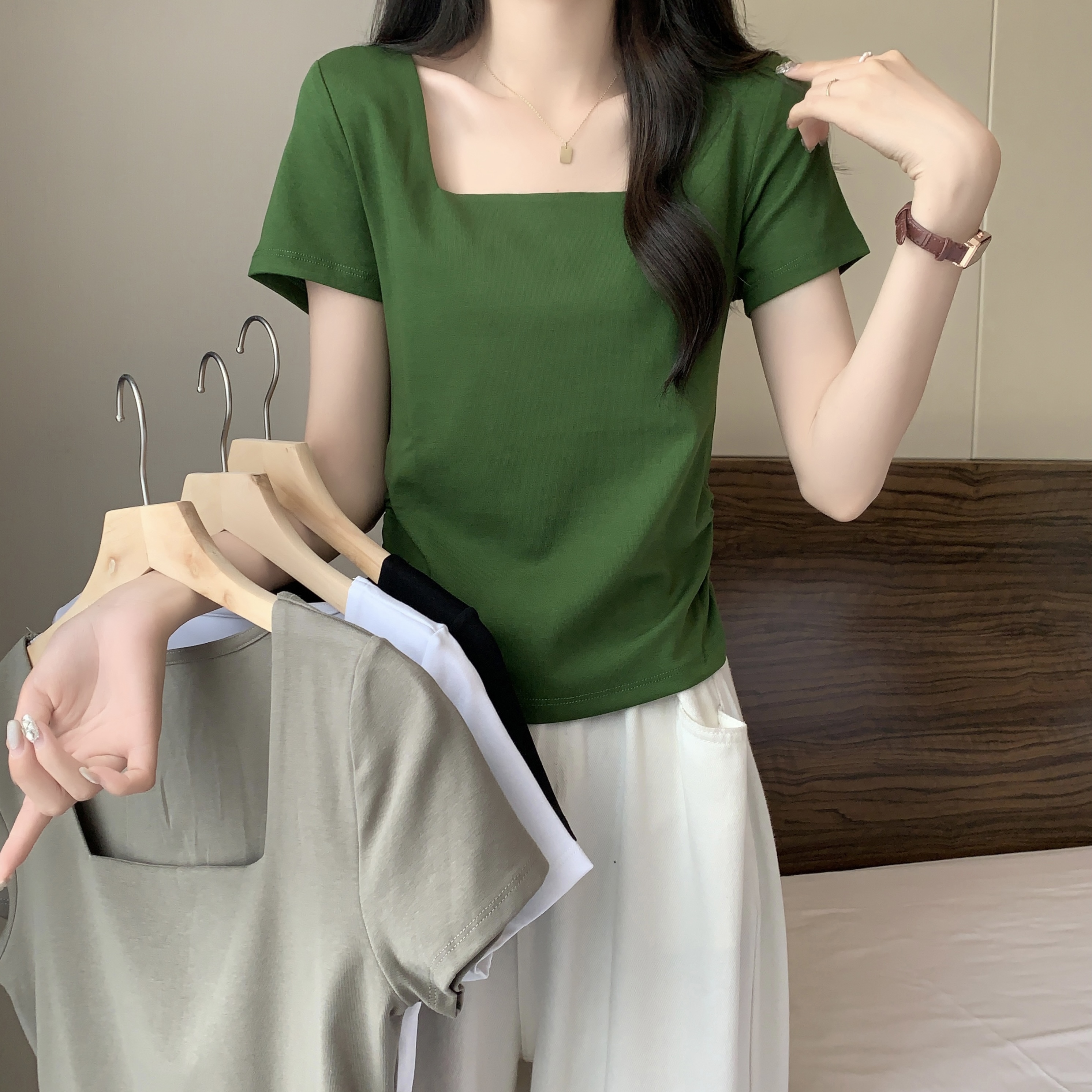 실사 빅 사이즈 지방 mm 새로운 디자인 센스 달콤한 스타일 광장 칼라 미니멀리즘 다용도 반팔 슬림해 보이는 표지 고기 맨위 여성