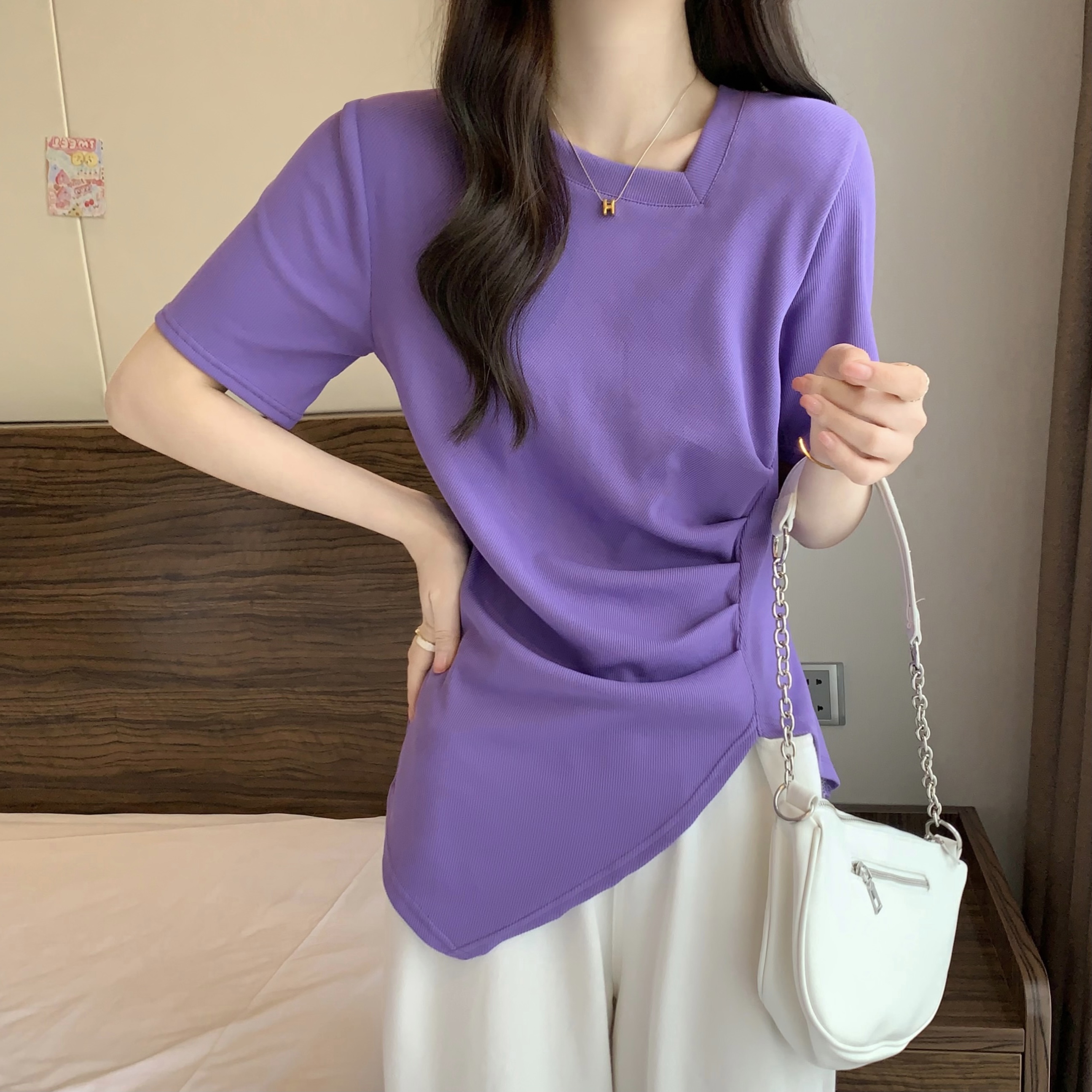 실사 빅 사이즈 새로운 디자인 센스 불규칙 긍정적 인 어깨 지방 mm 표지 고기 슬림해 보이는 패션 반팔 티셔츠 여성