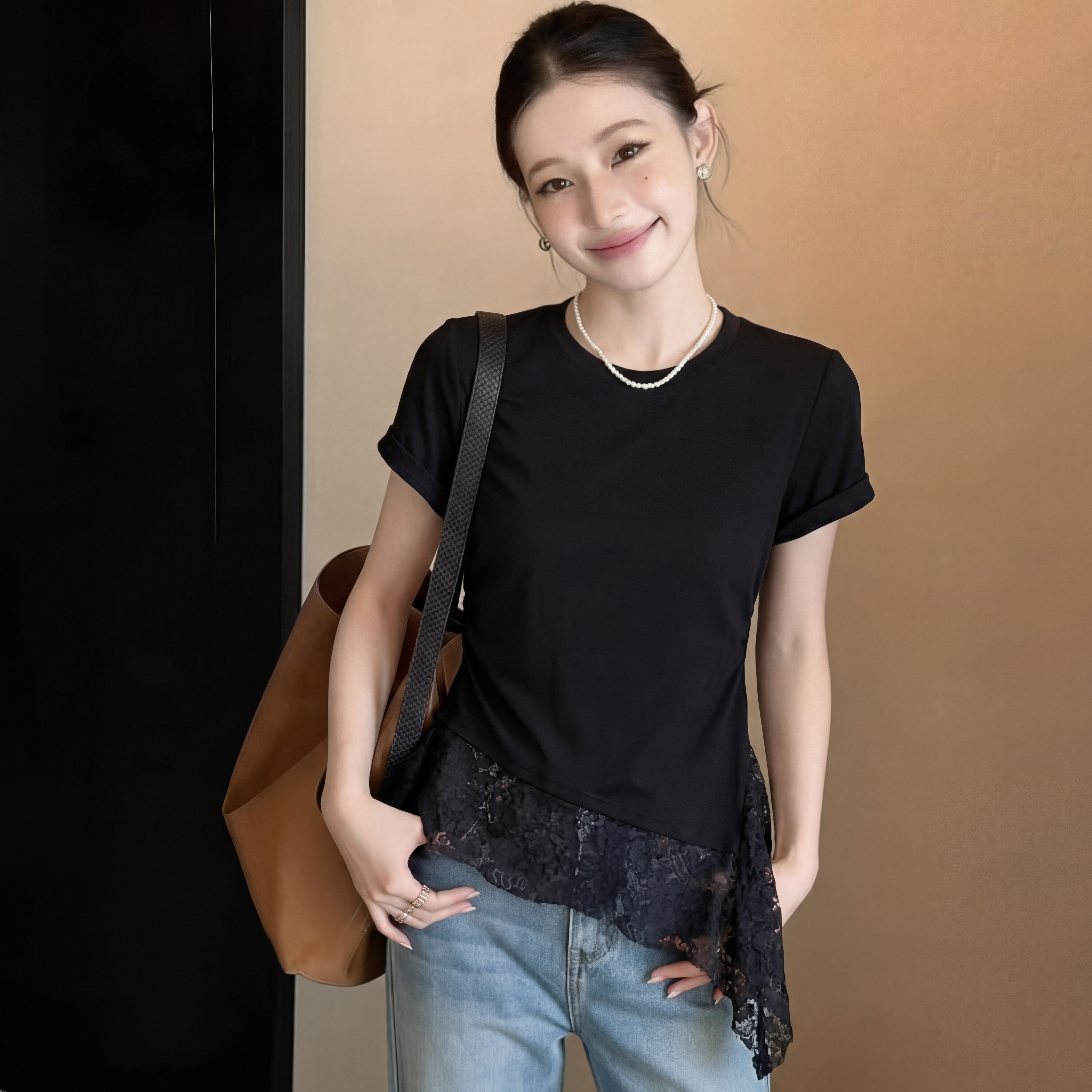 실사 빅 사이즈 새로운 디자인 센스 지방 mm 레이스 밑단 불규칙 패치워크 맨위 슬림해 보이는 다용도 티셔츠 여성