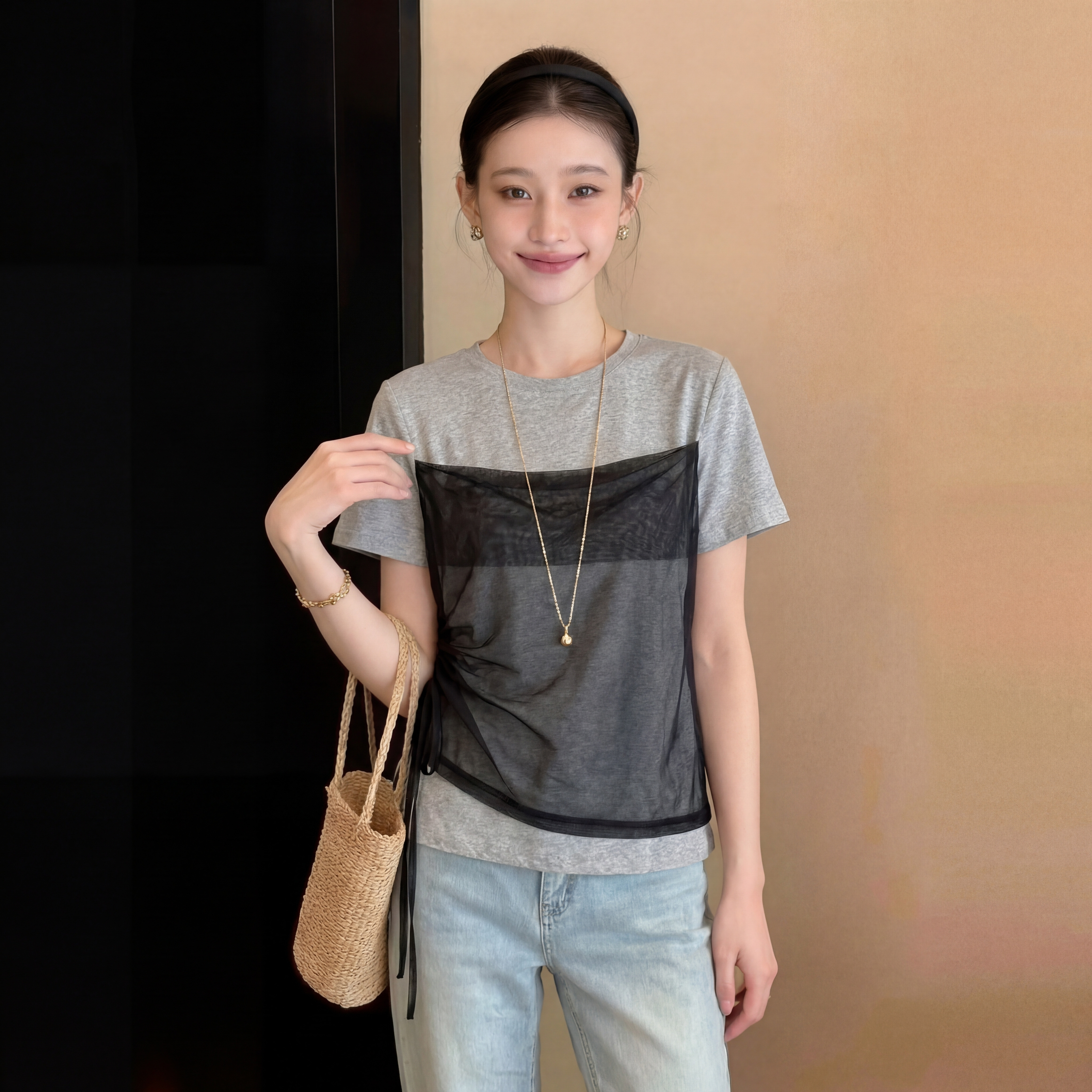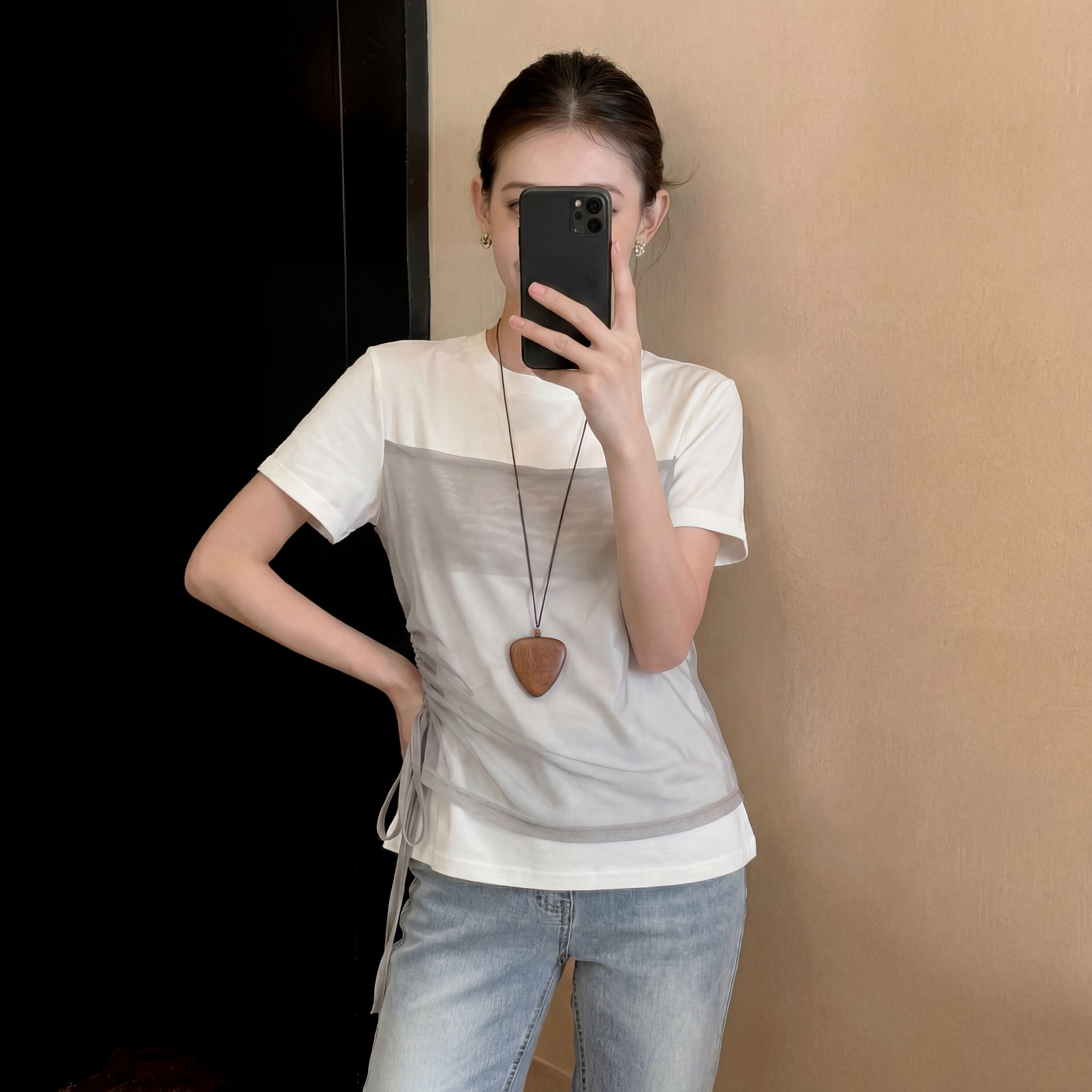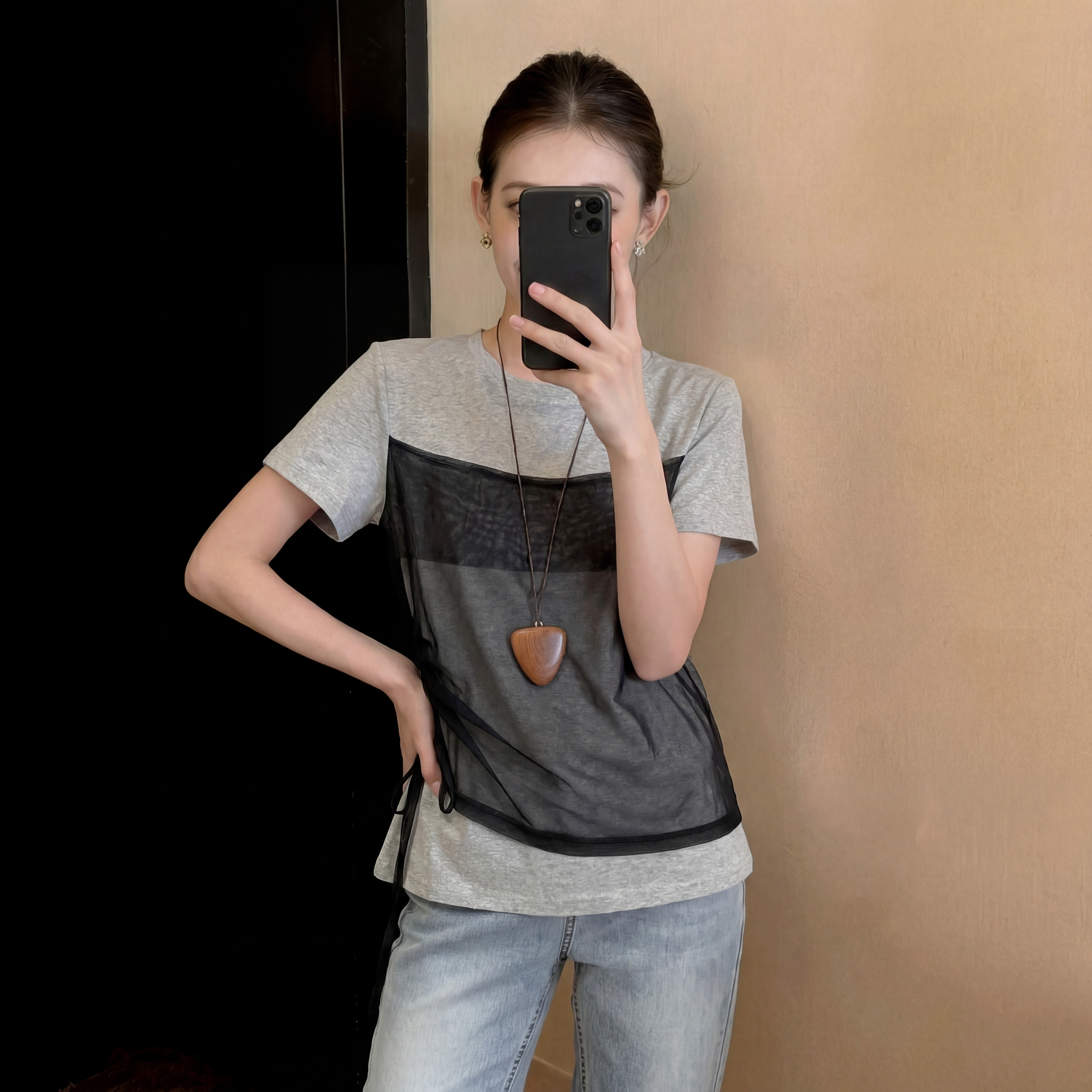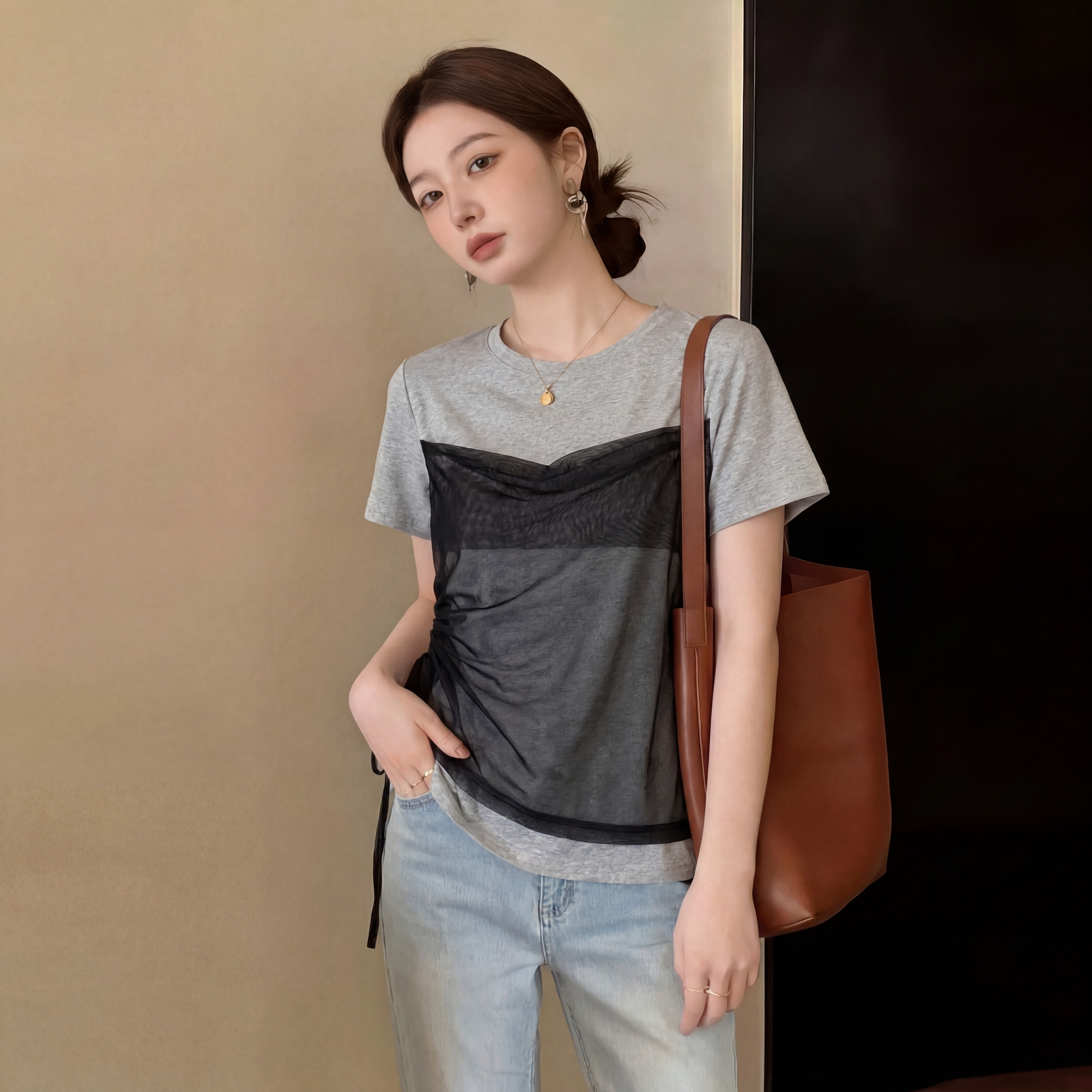 실사 빅 사이즈 새로운 디자인 센스 지방 mm 캐주얼 루즈핏 망사 패치워크 페이크 레이어드 슬림해 보이는 다용도 티셔츠 여성