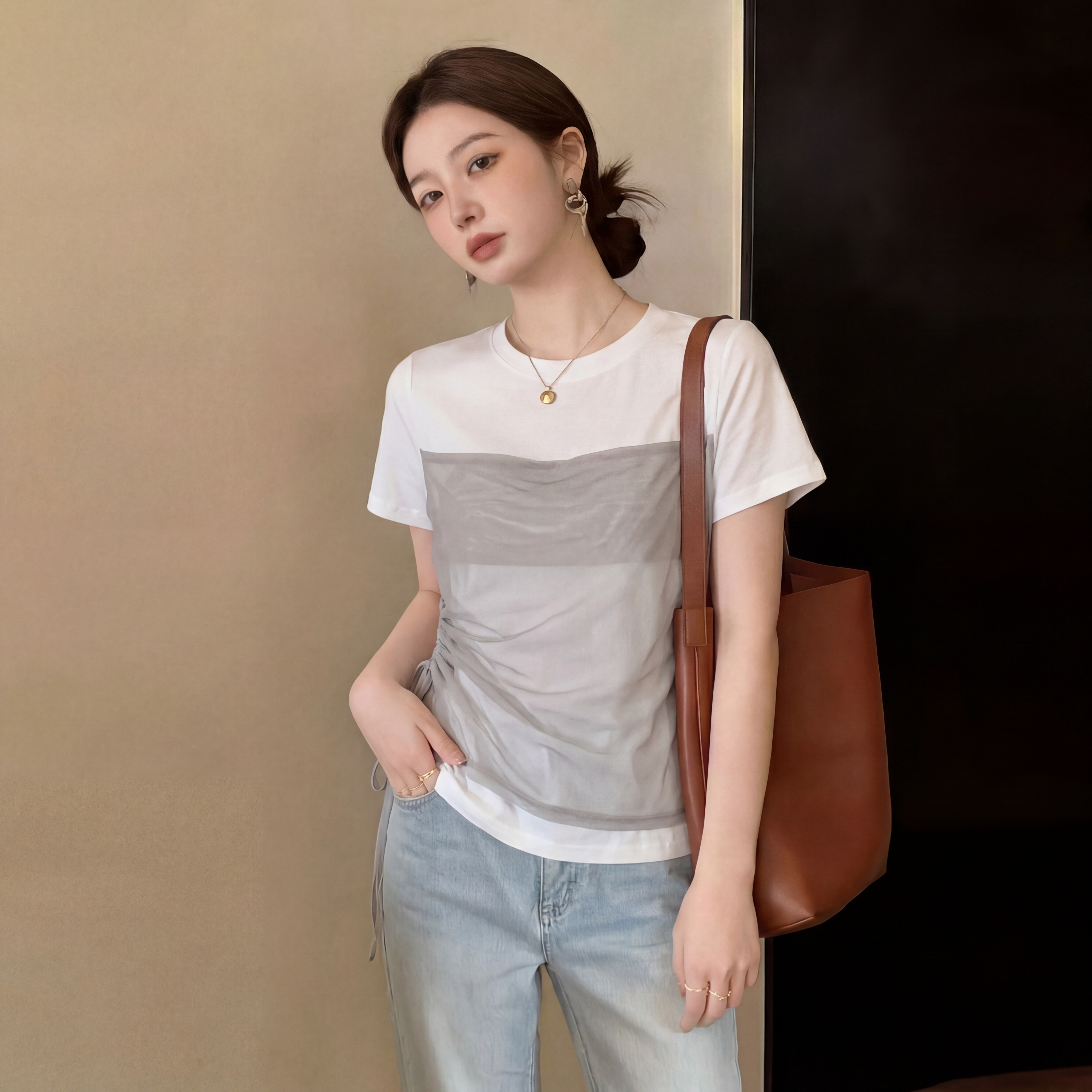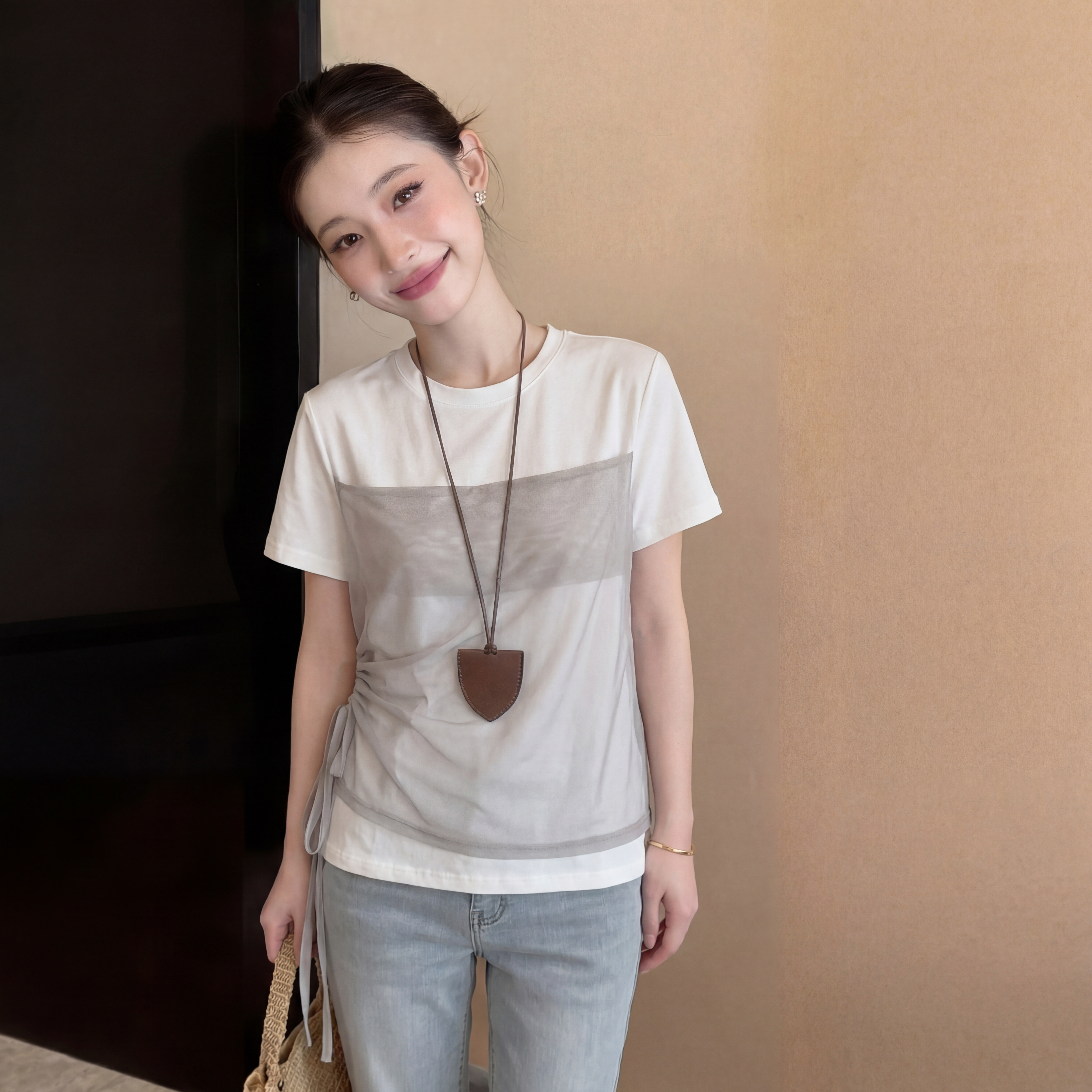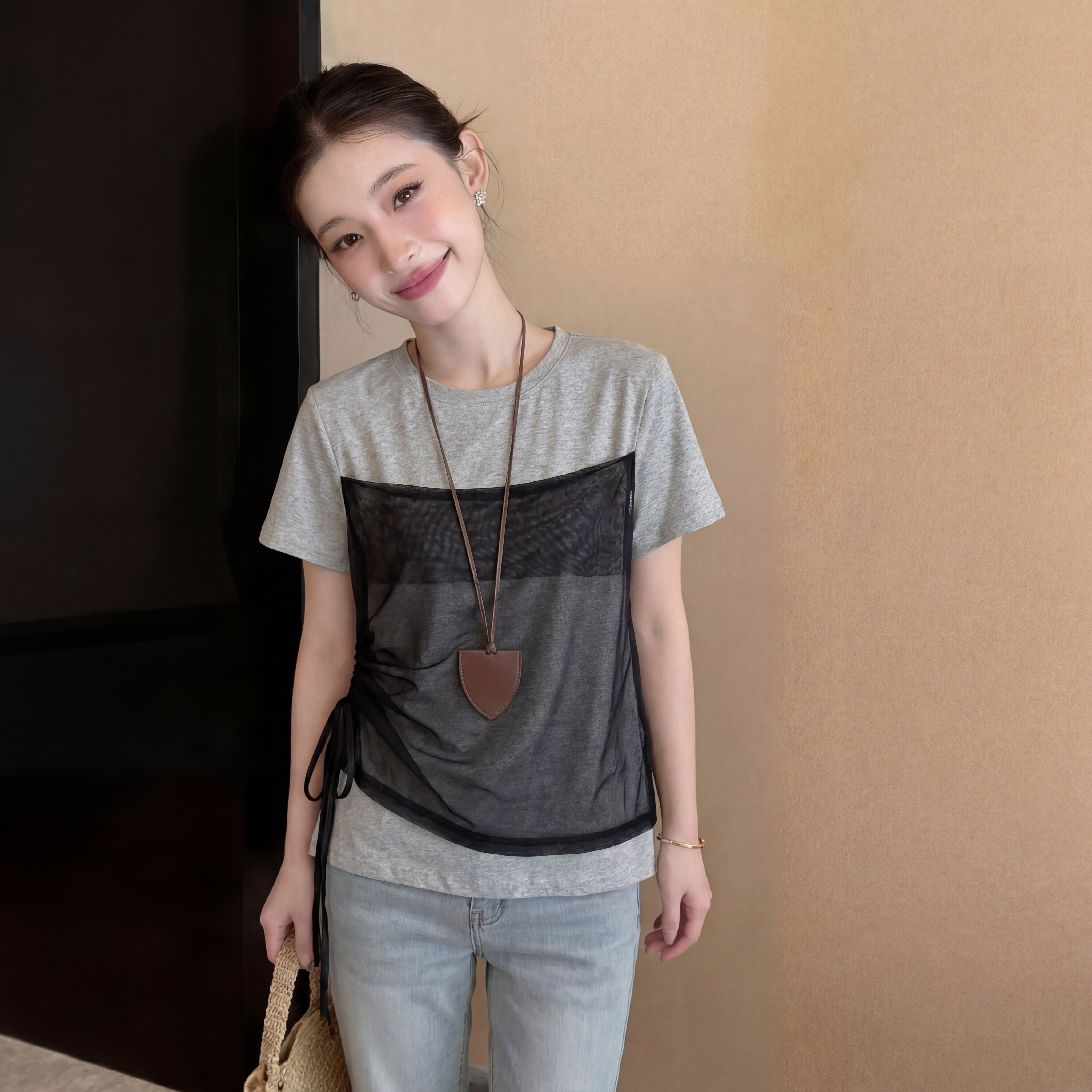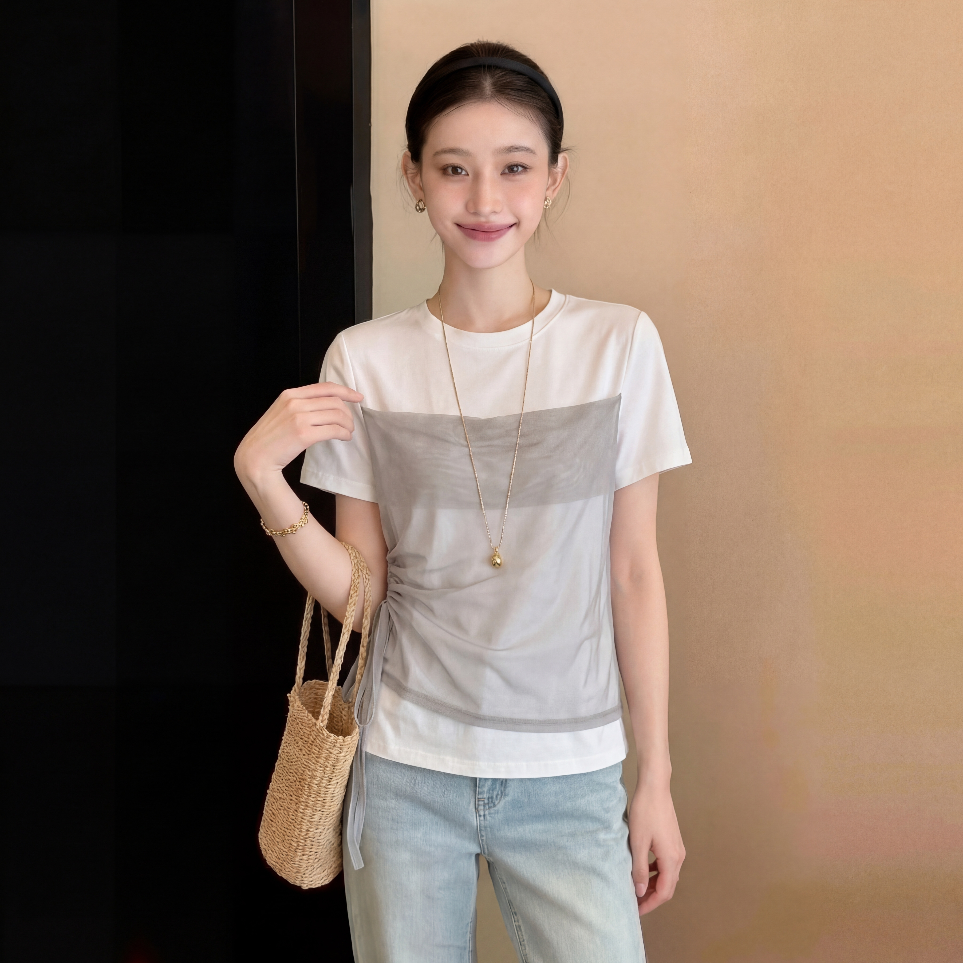실사 빅 사이즈 새로운 디자인 센스 지방 mm 캐주얼 루즈핏 망사 패치워크 페이크 레이어드 슬림해 보이는 다용도 티셔츠 여성