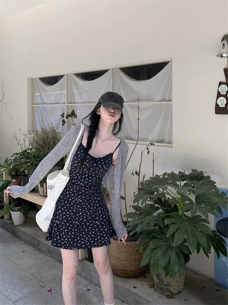 달콤한 핫걸 세트 얇은 스타일 긴팔 회색 카디건 코트 여름 꽃무늬 슬립 드레스 미니 스커트 투피스 세트