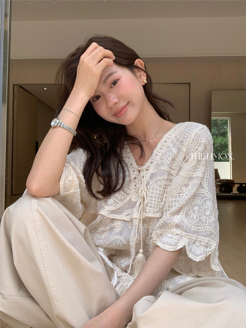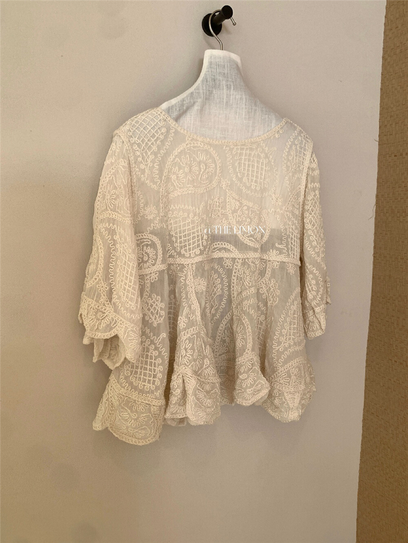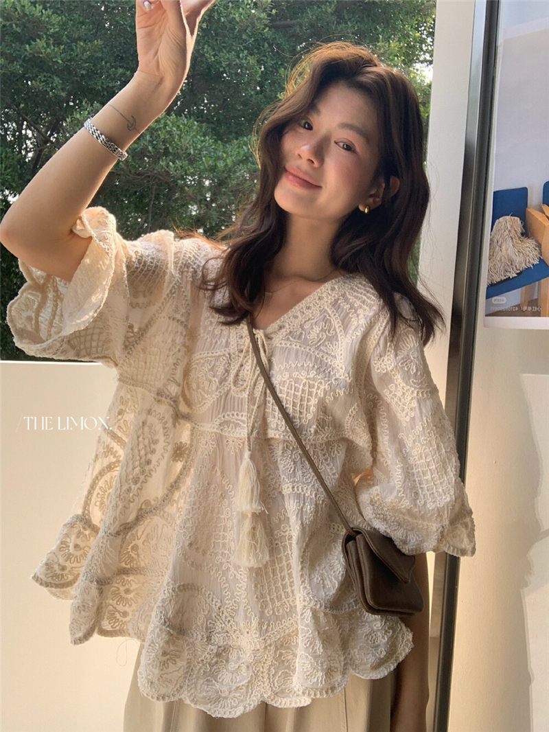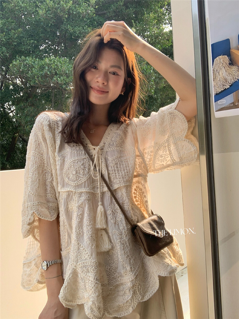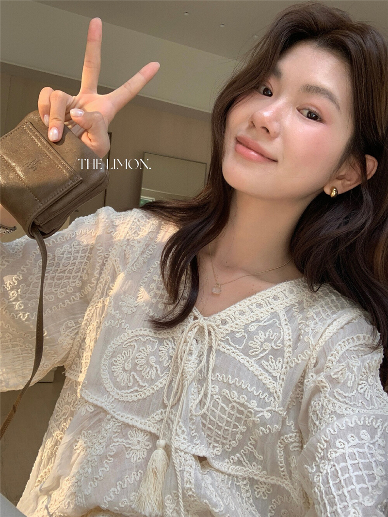 Mingyan 아름다움 대 주요 추진력 높은 품질 전체 점수 모델링 고대 조기 달콤한 자매 분위기 자수 비스듬한 어깨 레이스 작은 셔츠