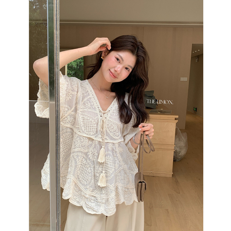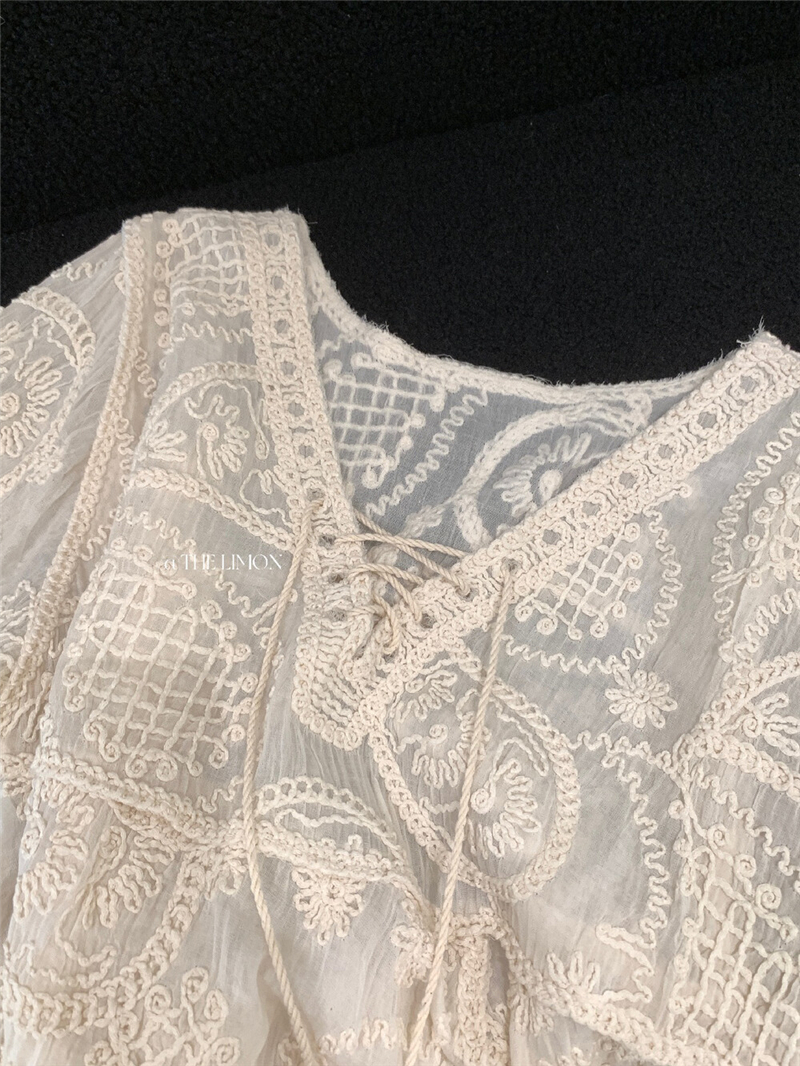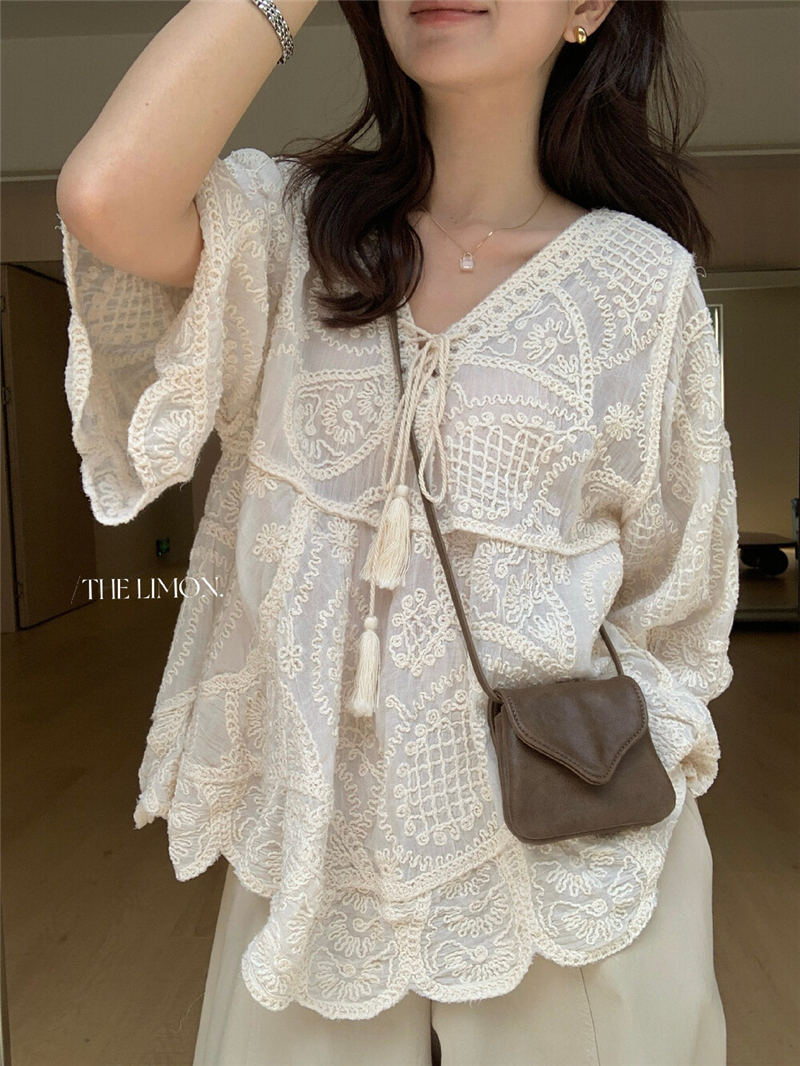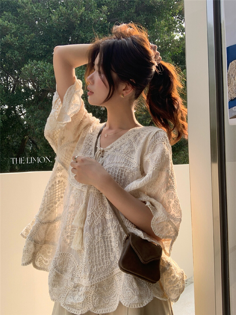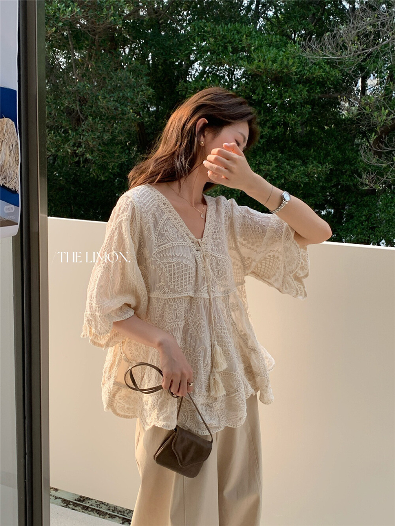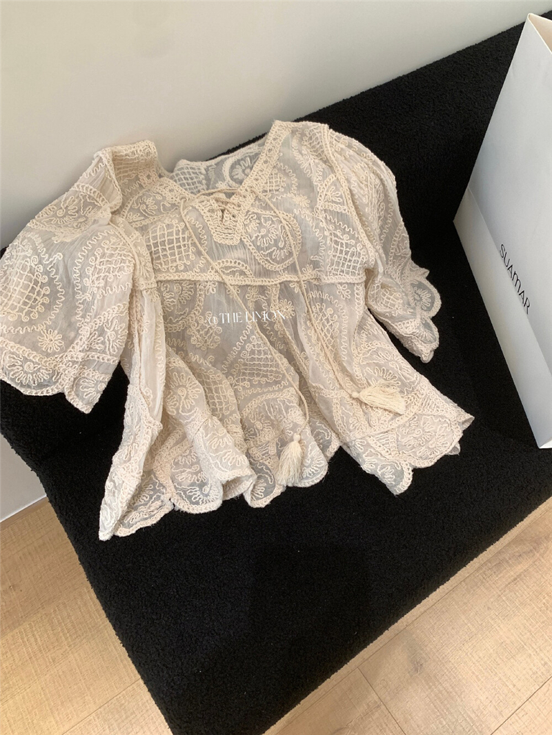 Mingyan 아름다움 대 주요 추진력 높은 품질 전체 점수 모델링 고대 조기 달콤한 자매 분위기 자수 비스듬한 어깨 레이스 작은 셔츠