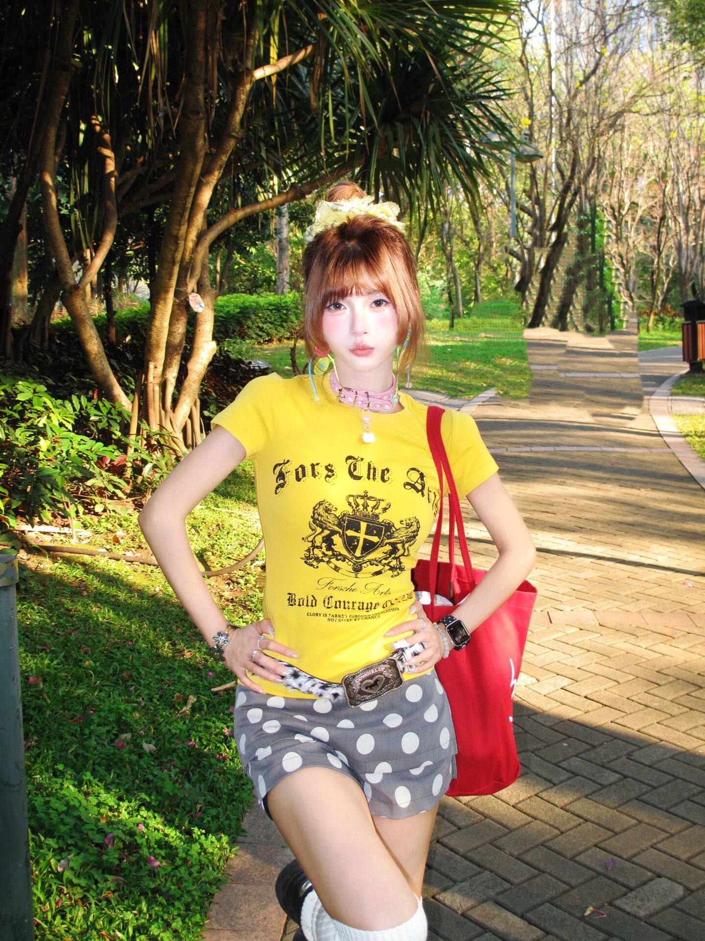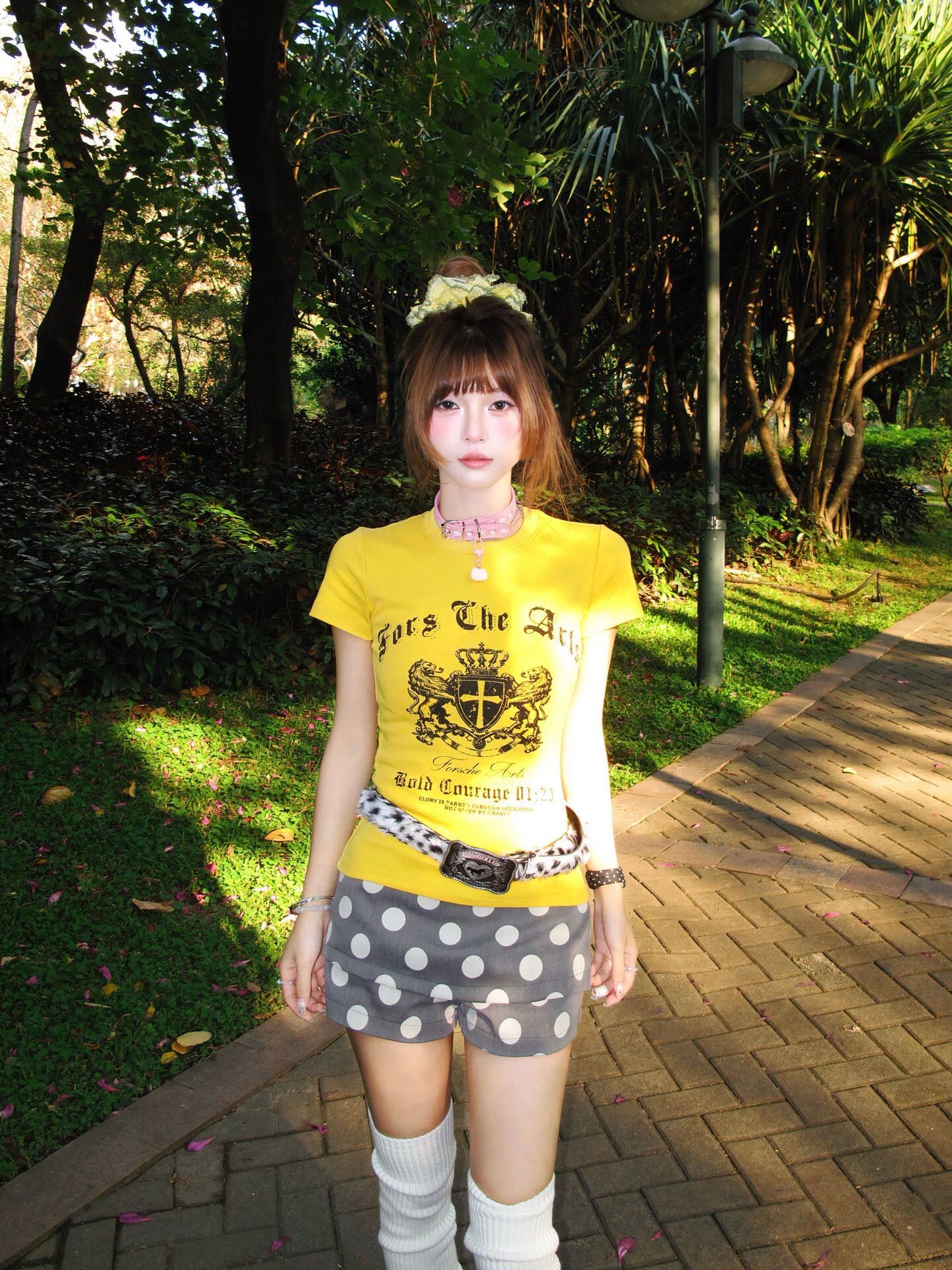 아메리칸 한 부서 알파벳 전체 인쇄 도트 무늬 화이트 반팔 티셔츠 여성 여름 달콤한 스타일 몸매 가꾸기 슬림해 보이는 쇼트 스타일 맨위