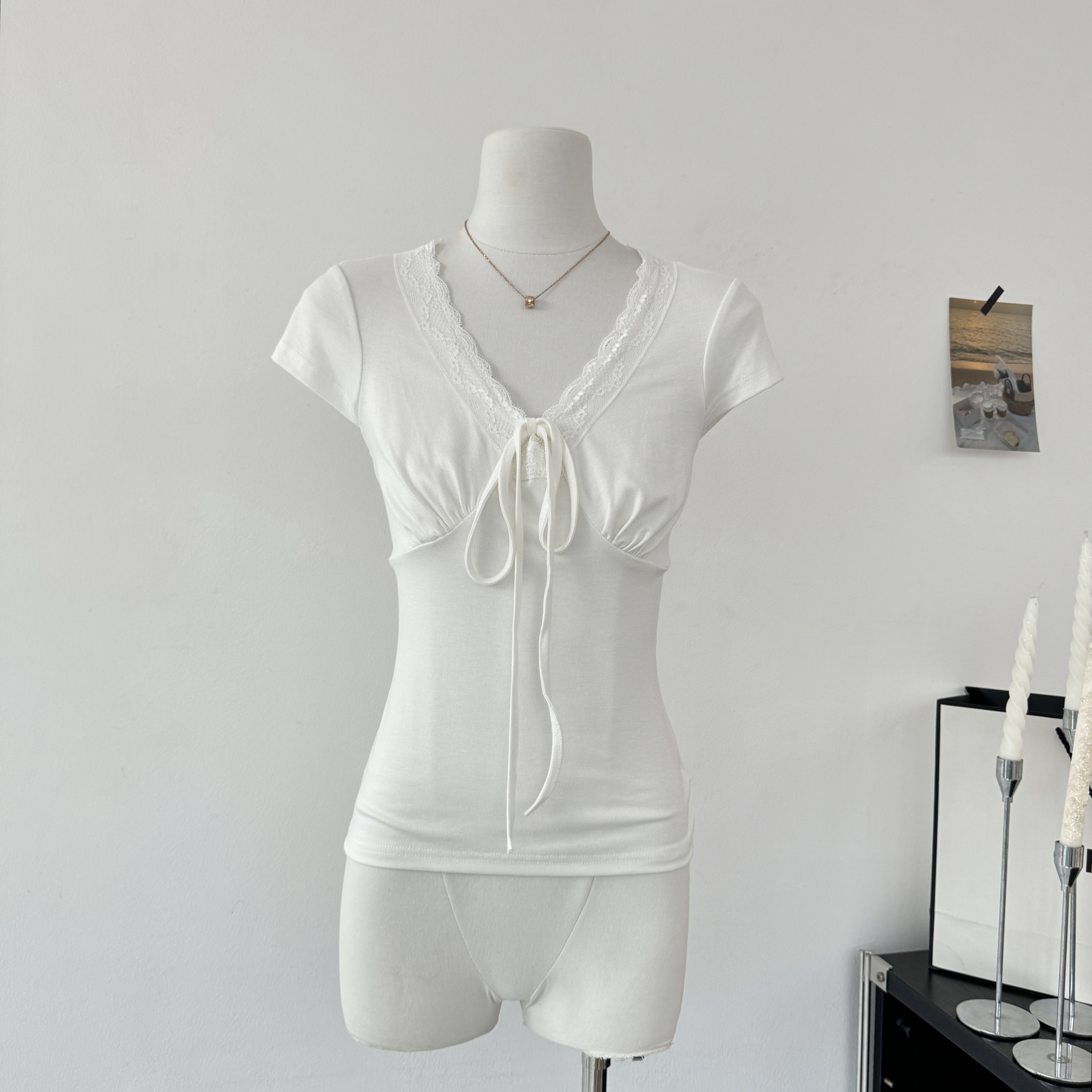 wuu2sweet 우 너무 달콤한 볶다 좋은 우는 소리 자매 주간 실크 레이스 레이스 반팔 티셔츠 여성 여름 나비 매듭 맨위
