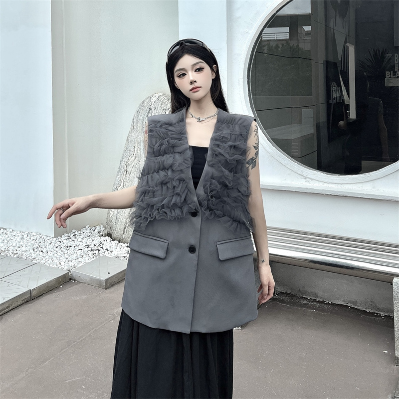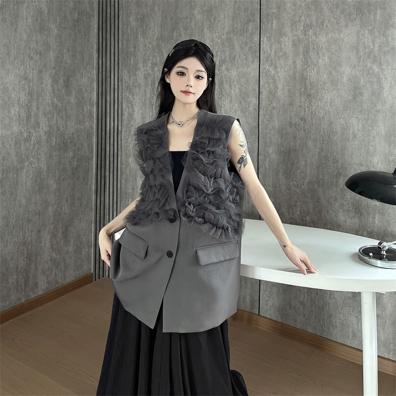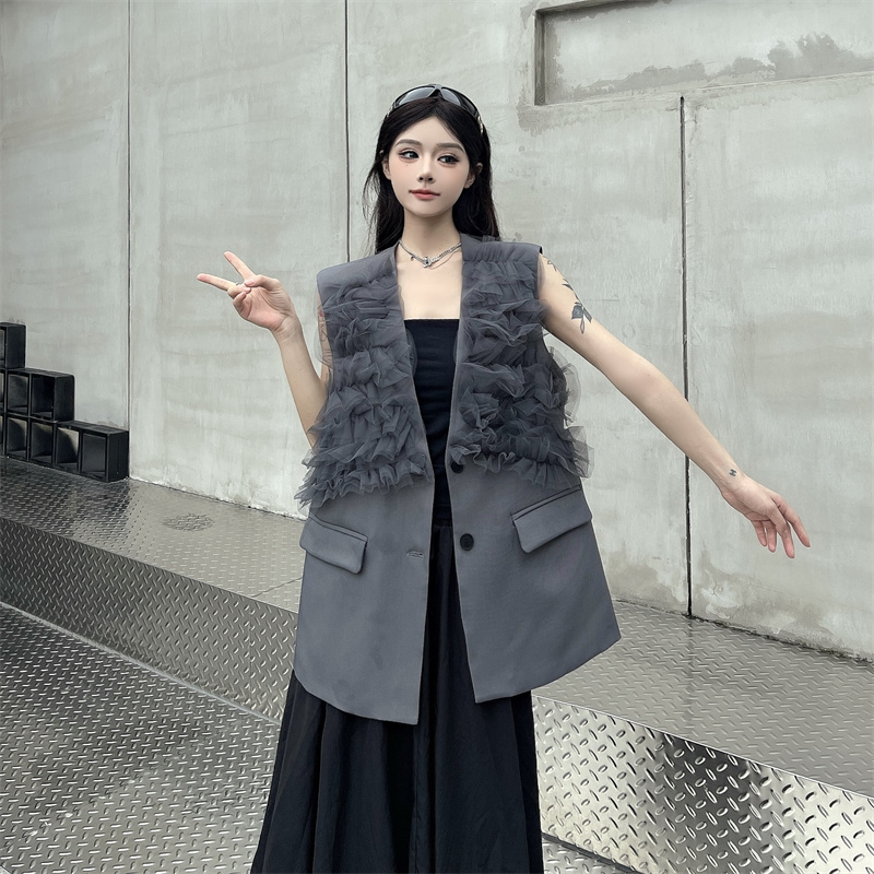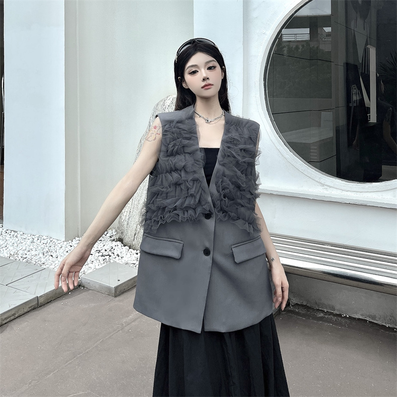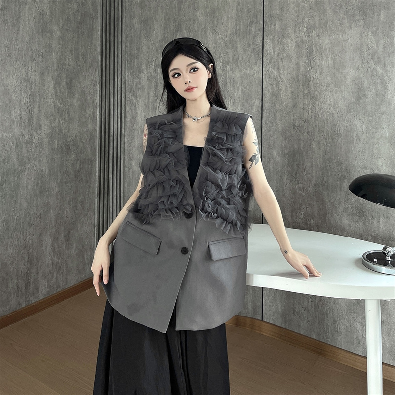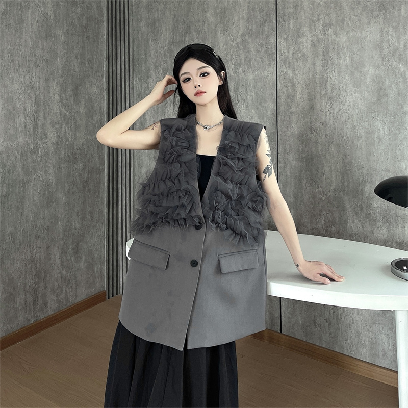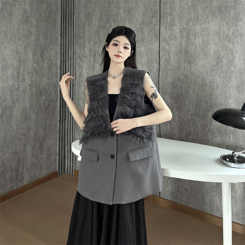 실사 한 부서 부드러운 바람 레이스 조각 정장 베스트 여름 얇은 스타일 민소매 정장 재킷