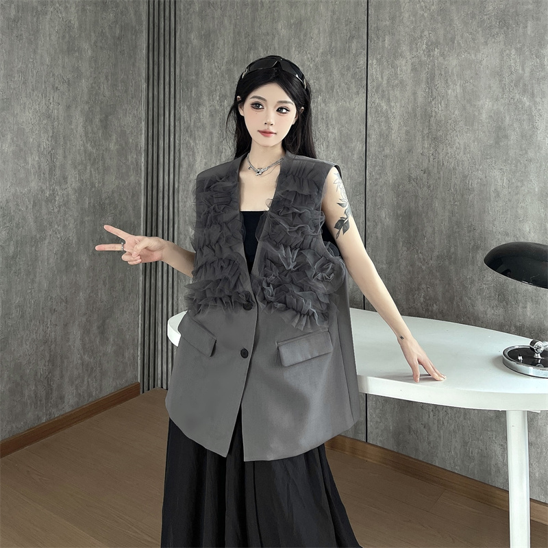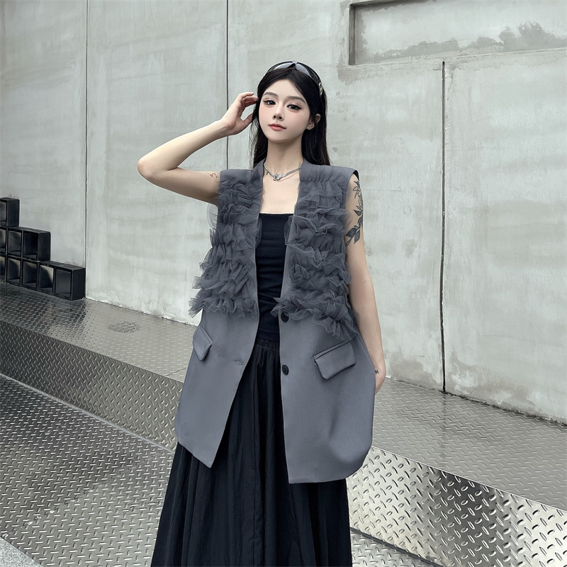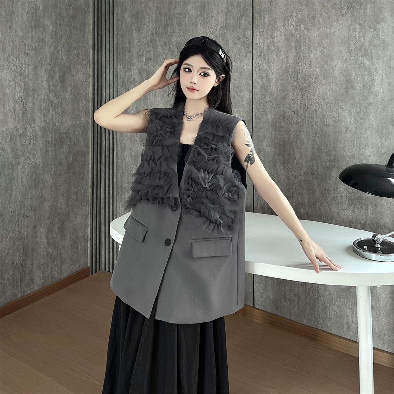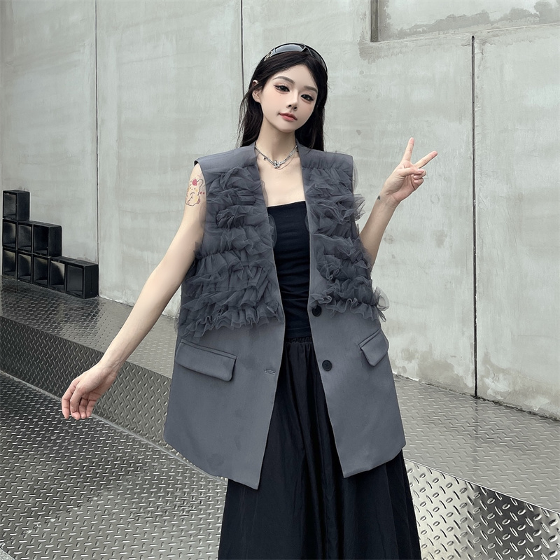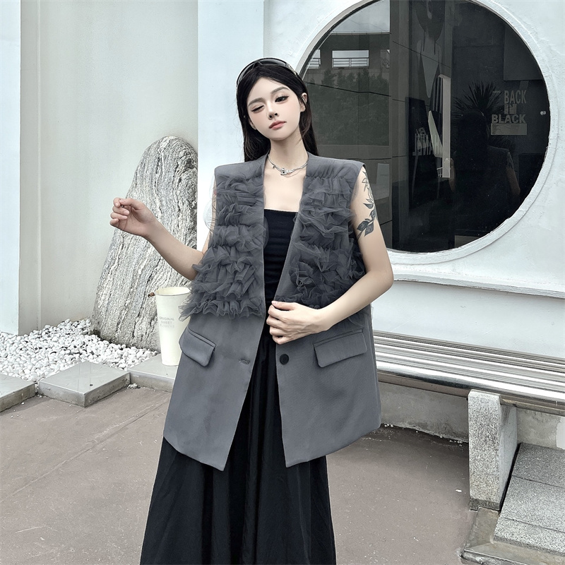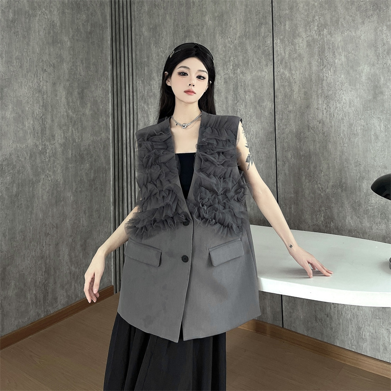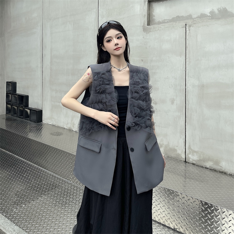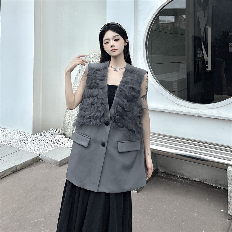 실사 한 부서 부드러운 바람 레이스 조각 정장 베스트 여름 얇은 스타일 민소매 정장 재킷