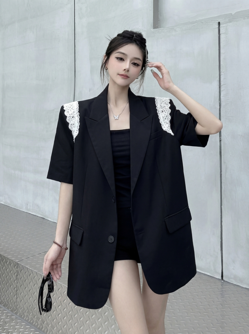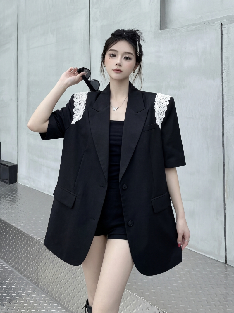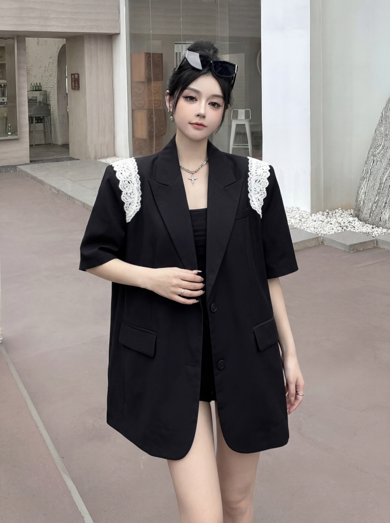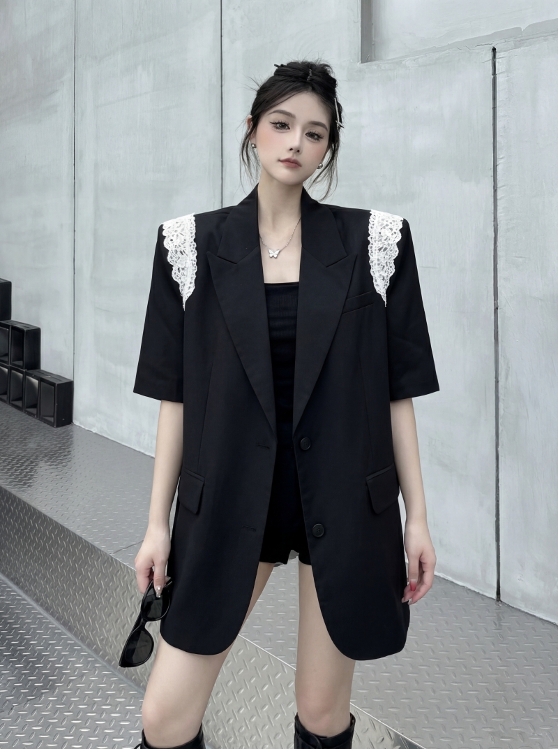 실사 디자인 센스 층 레이스 패치워크 정장 조끼 여자 트렌드 패션 캐주얼 중간 길이 재킷