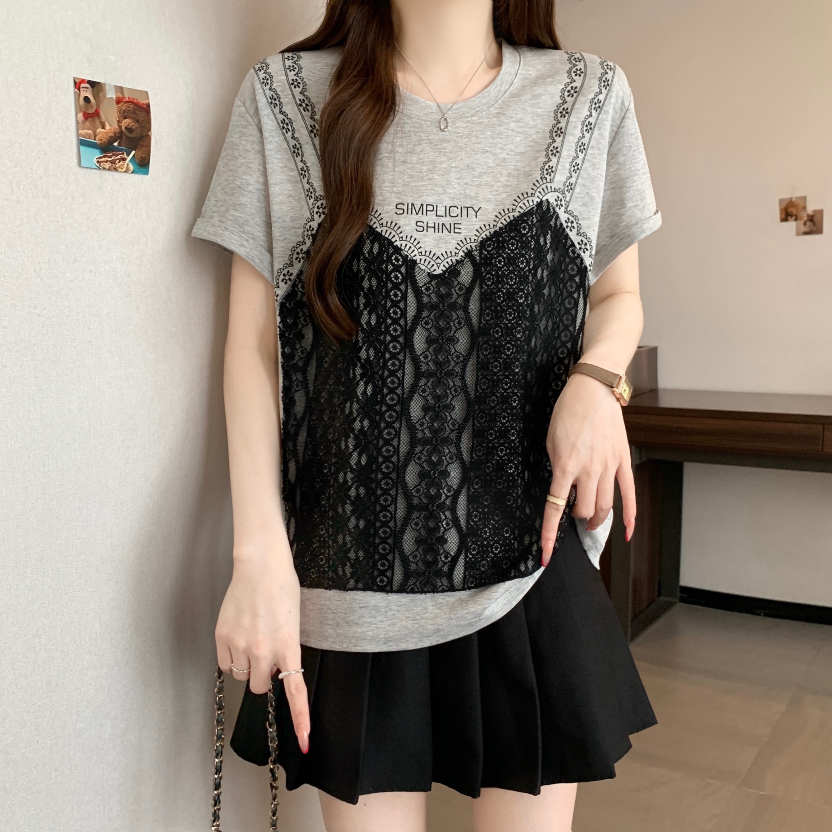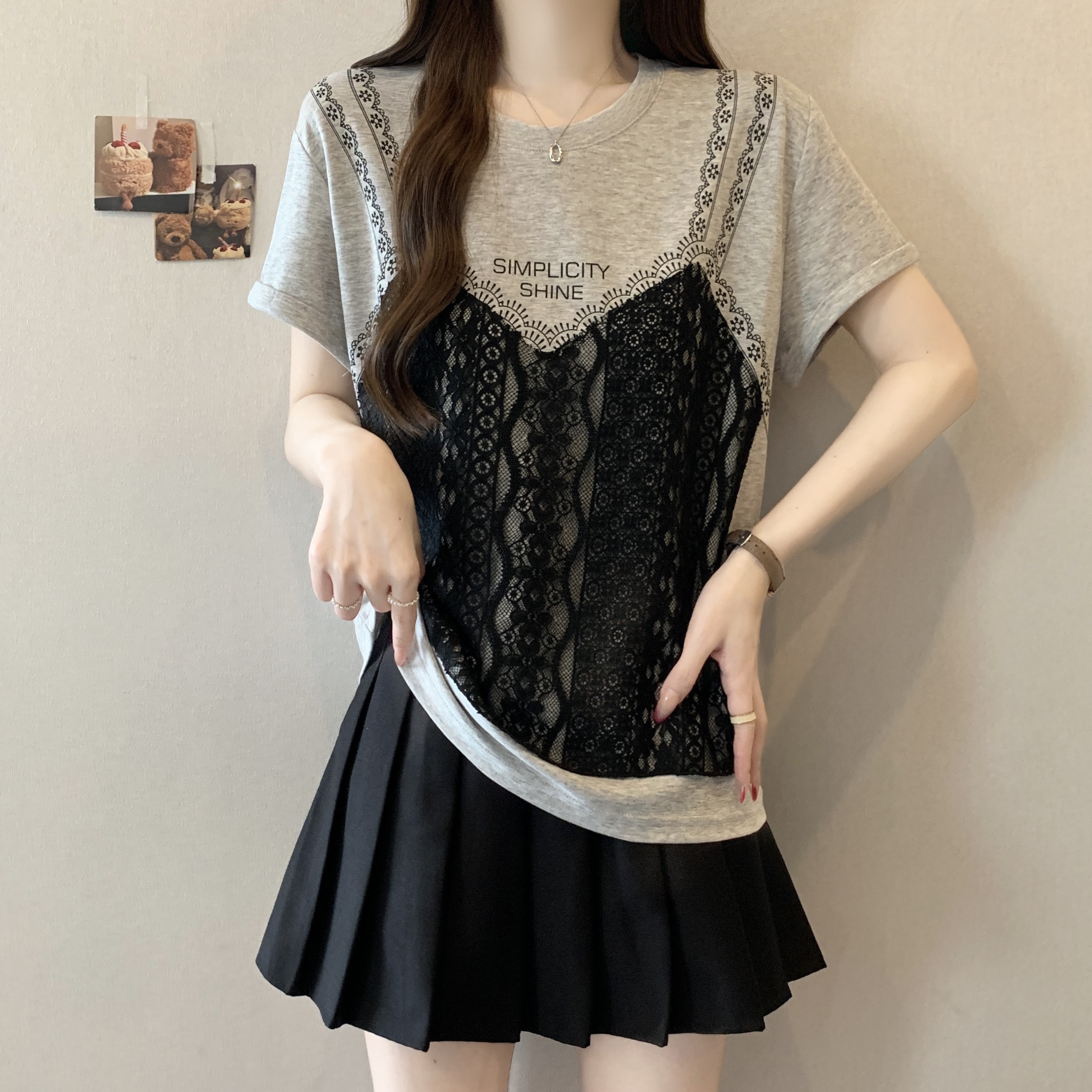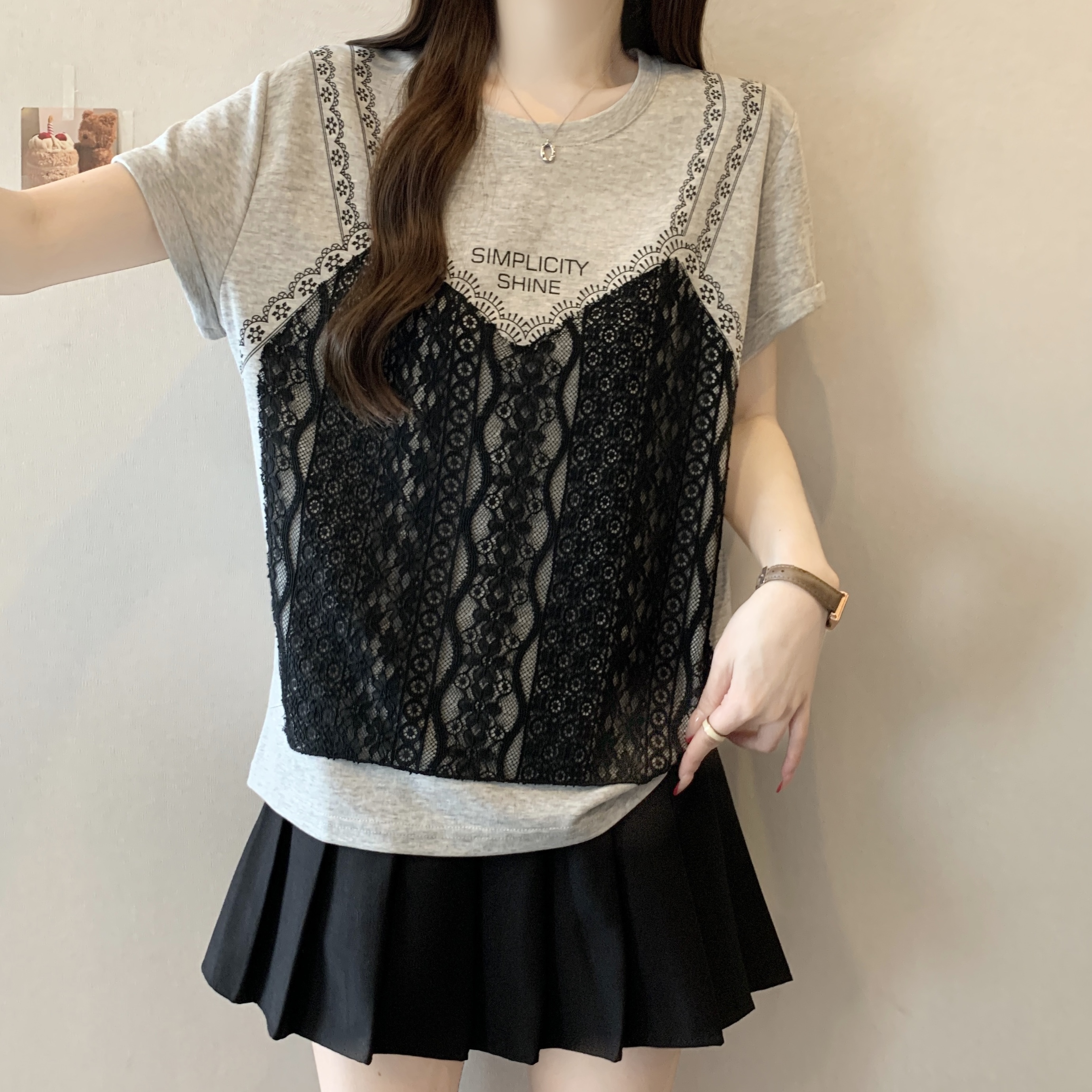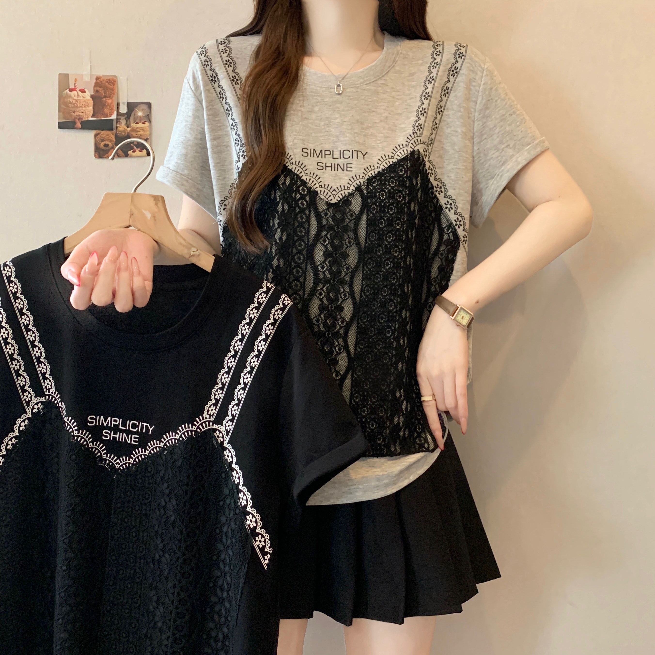실사 2026 새로운 빅 사이즈 지방 mm 디자인 센스 페이크 레이어드 작은 대중 패치워크 레이스 슬림해 보이는 다용도 맨위