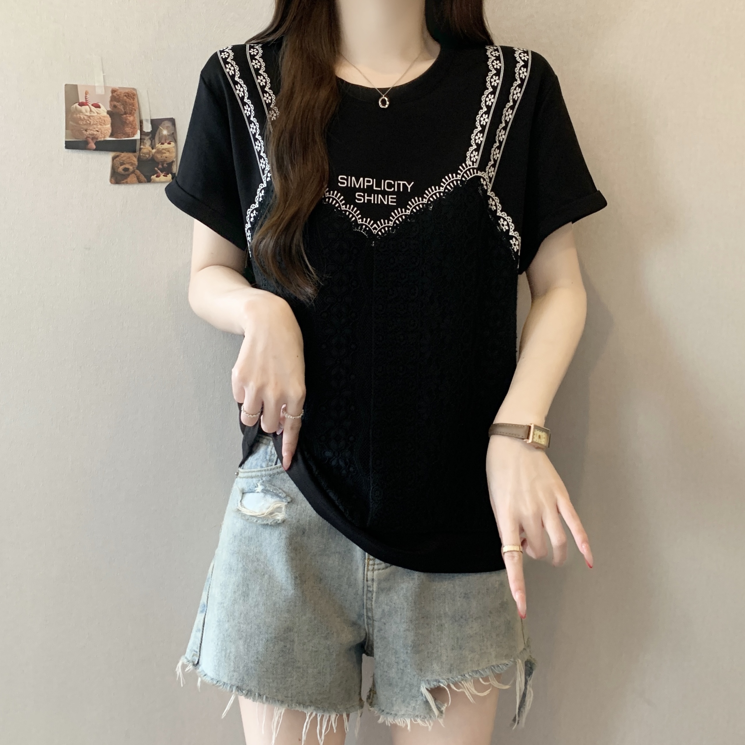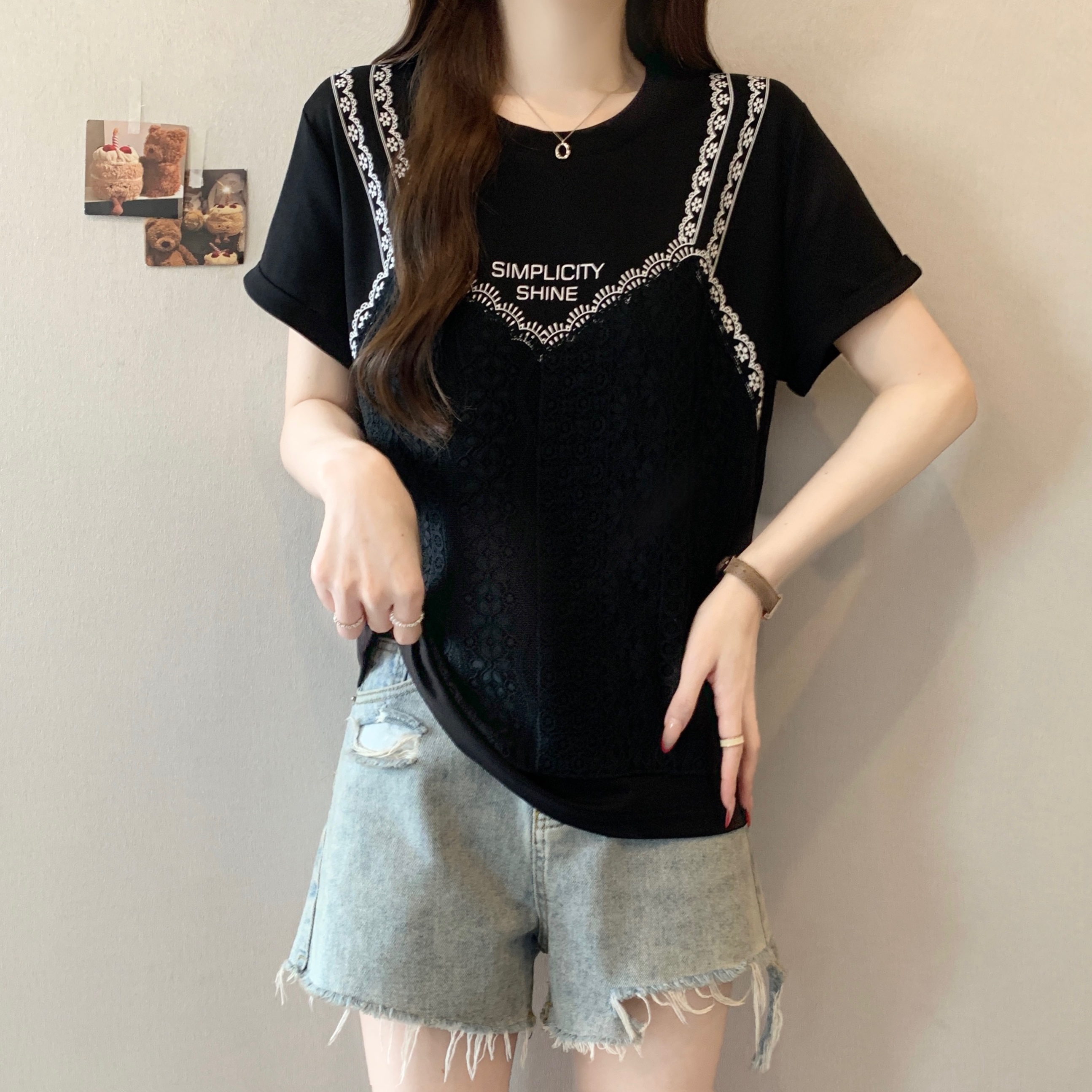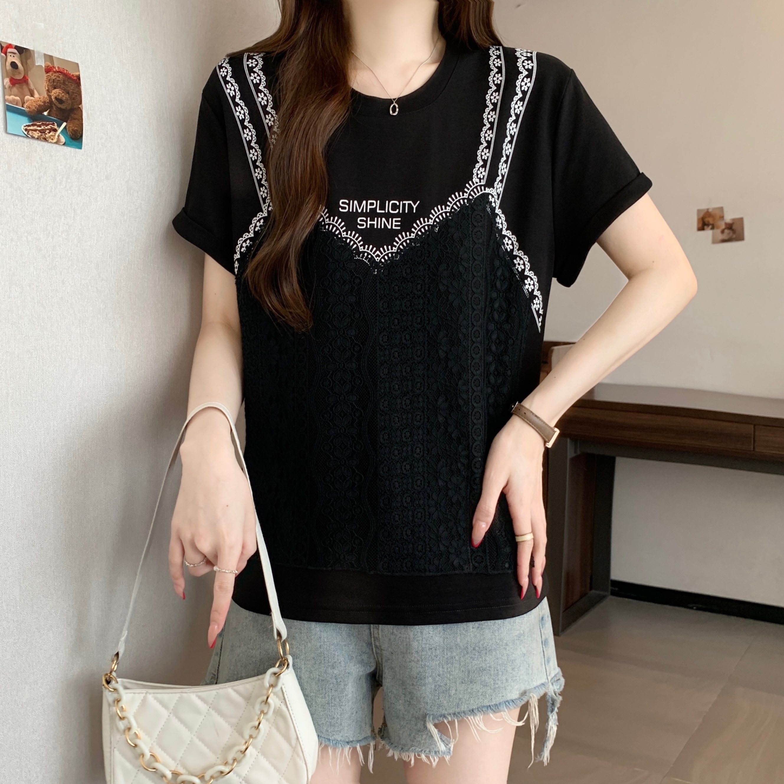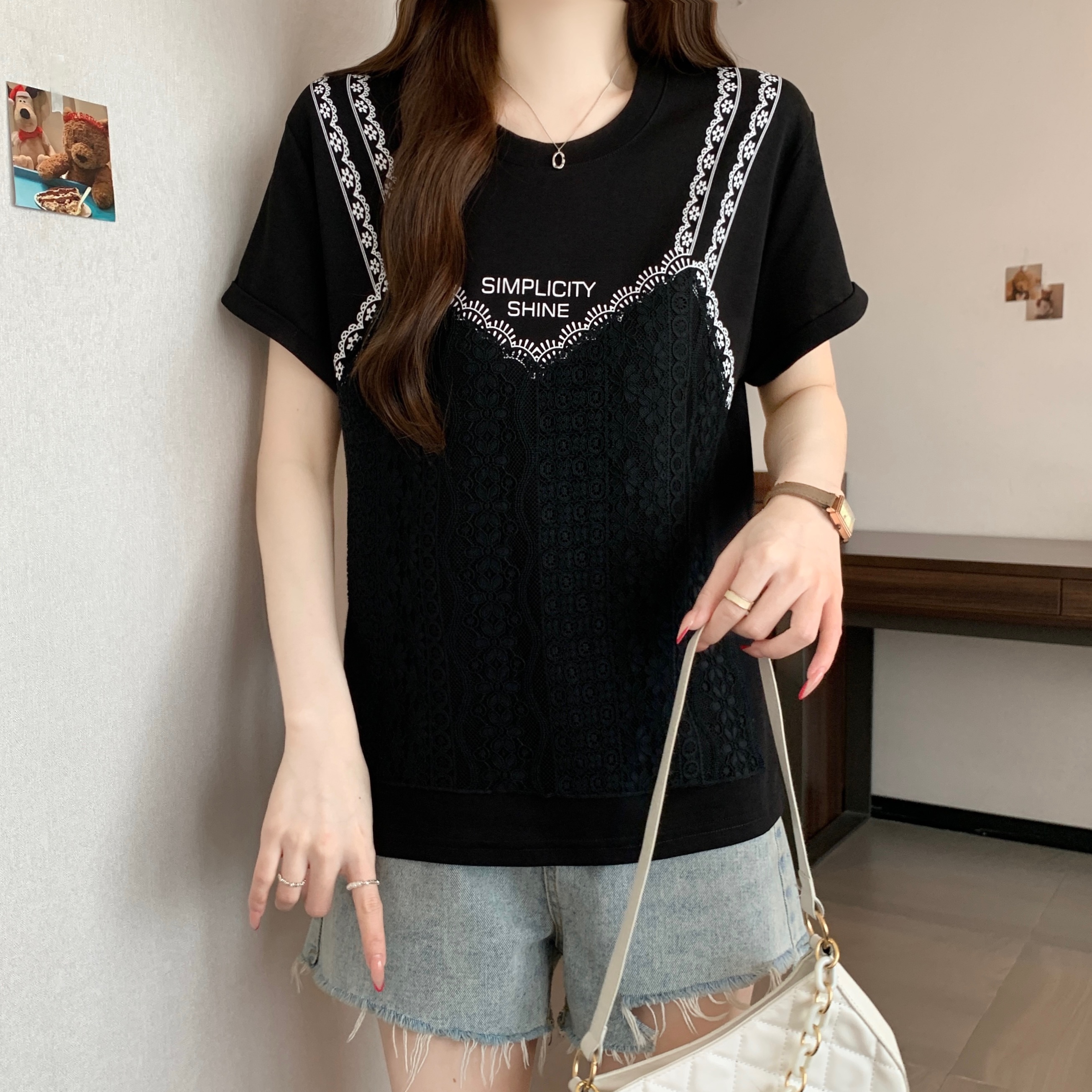실사 2026 새로운 빅 사이즈 지방 mm 디자인 센스 페이크 레이어드 작은 대중 패치워크 레이스 슬림해 보이는 다용도 맨위