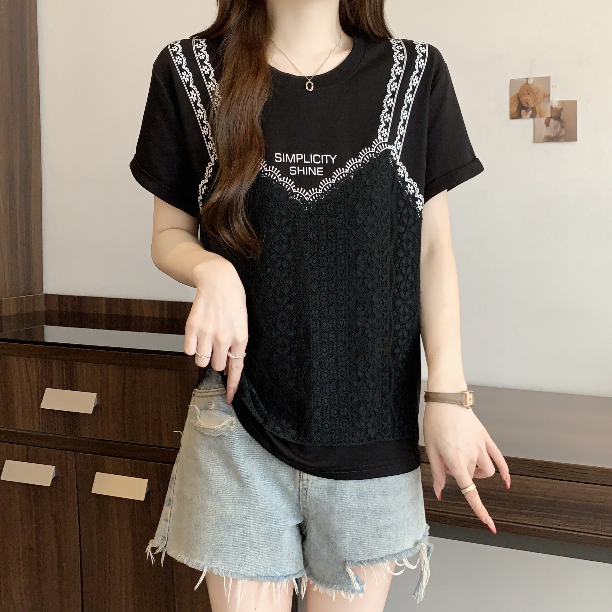 빅 사이즈 여성 의류 한 부서 연령 감소 디자인 짧은 티셔츠 여성 레트로 슬립 패치워크 사실 두 조각 통통한 여동생 맨위 여름